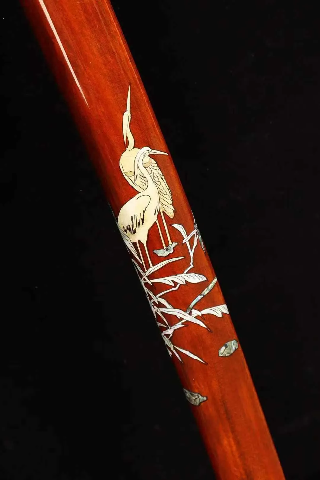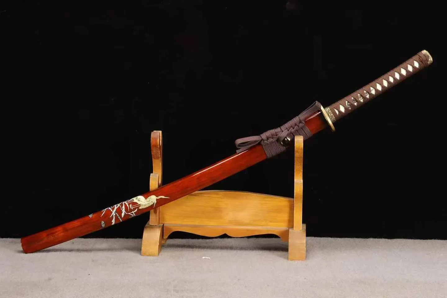 Vỏ katana màu đỏ sơn bóng, nổi bật với họa tiết chim hạc đứng trên cành trúc, biểu tượng cho sự thanh cao, trường thọ và tinh thần bình ổn. Akane Tsuru Katana là lựa chọn hoàn hảo cho người yêu thích những mẫu kiếm mang vẻ đẹp tinh tế và giàu giá trị thẩm mỹ khi trưng bày.