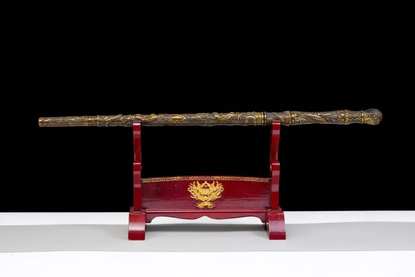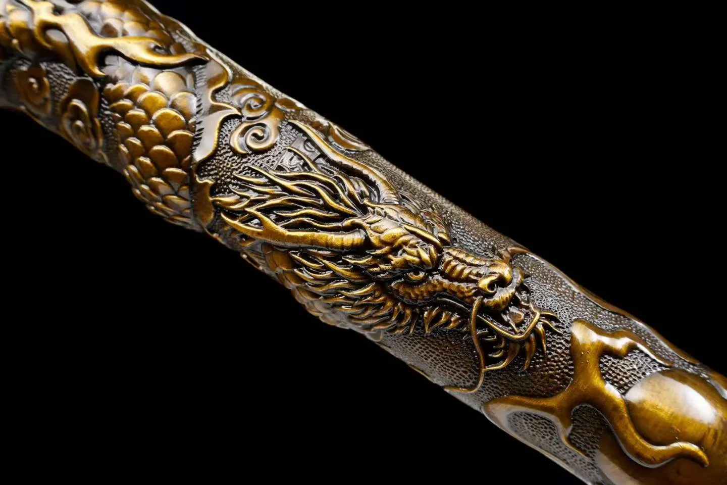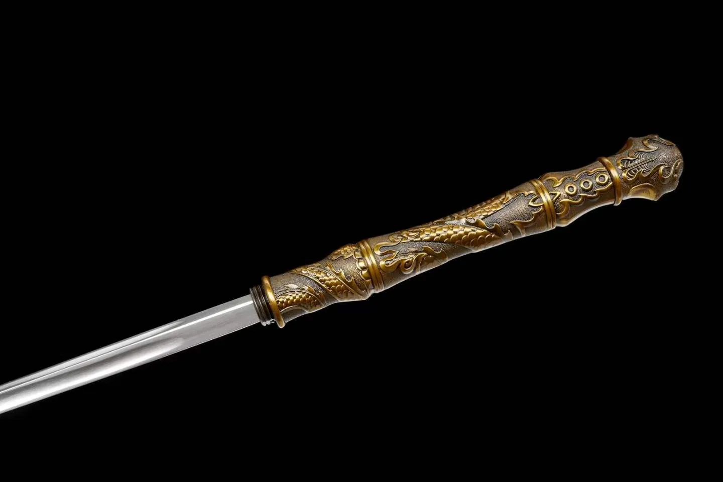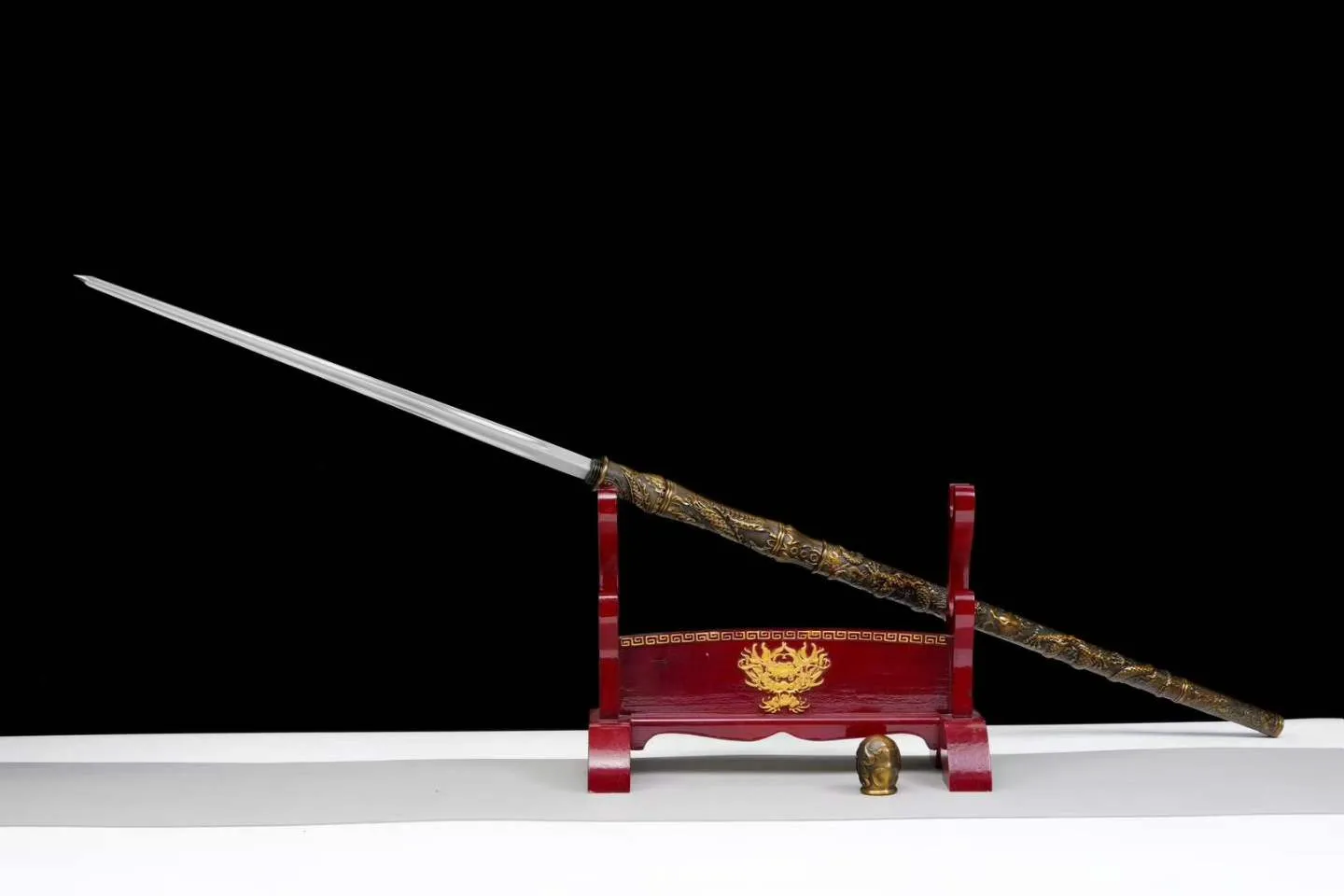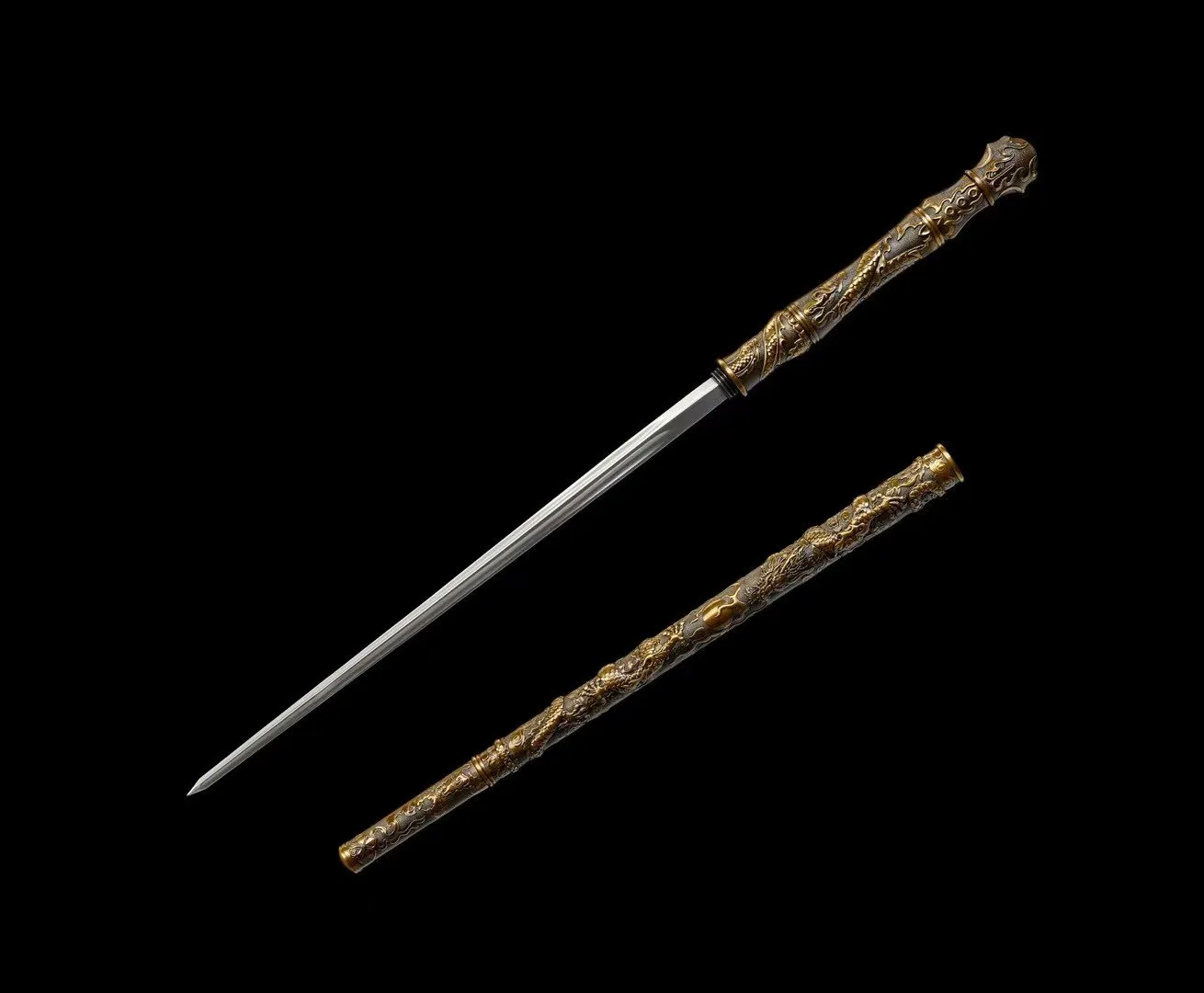 Thiết kế dạng gậy kiếm tích hợp, vỏ kim loại nguyên khối chạm nổi song long tranh châu, bên trong là mũi đột phá giáp 4 cạnh liền khối, tối ưu lực xuyên. Lưỡi/đầu đột sử dụng thép mangan rèn thủ công, cho độ cứng và độ bền cao.