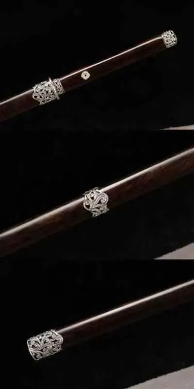 Tay cầm gỗ được mài nhẵn thủ công, cho cảm giác cầm chắc và giữ đúng tinh thần giản dị nhưng sang trọng của dòng trường kiếm cổ. Phụ kiện mạ bạc chạm khắc tinh xảo, ôm trọn phần chuôi và miệng vỏ, tạo điểm nhấn nổi bật và tăng tính nhận diện. Vỏ gỗ hoàn thiện sắc nét, giữ form tốt và tôn trọn vẻ đẹp thanh thoát của lưỡi thép bạc.
