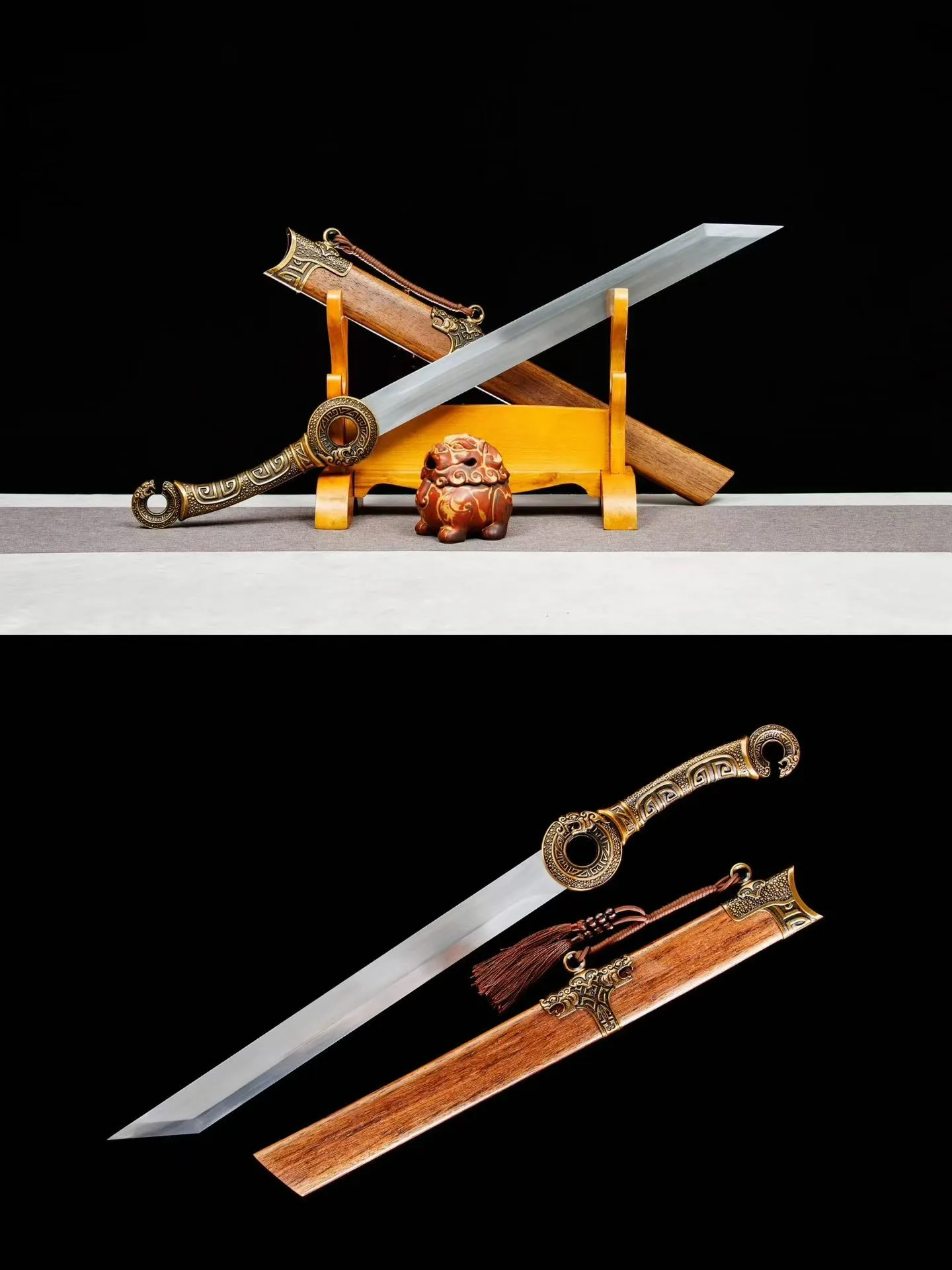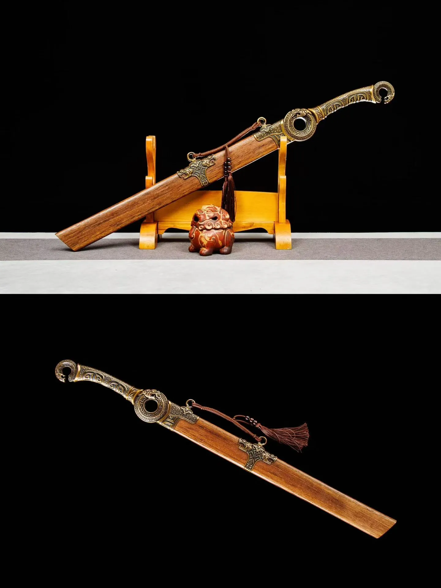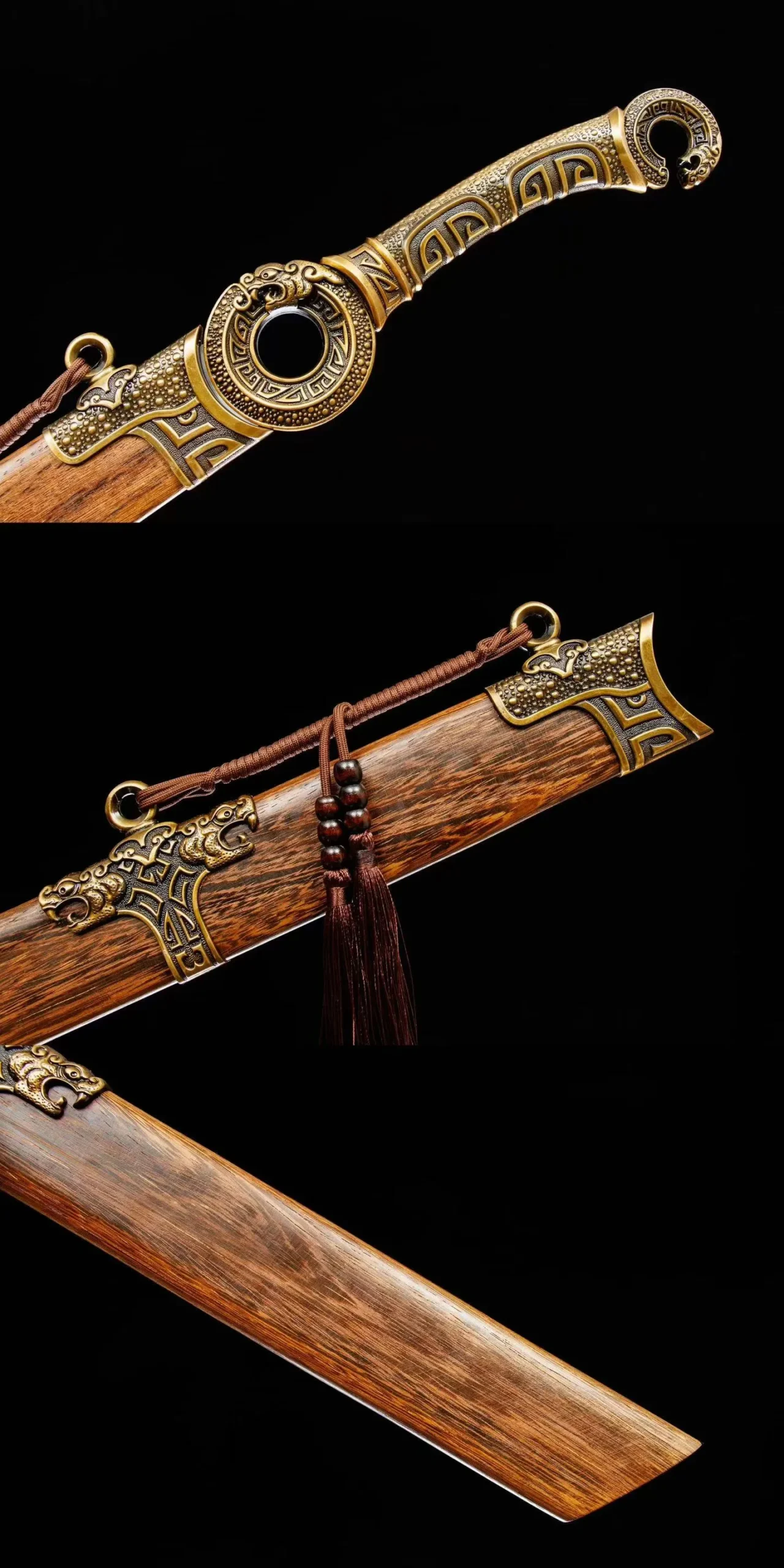 Bao kiếm: Gỗ hoa lê ốp phụ kiện hợp kim | Tay cầm : hợp kim  | Chắn lưỡi: Hợp kim