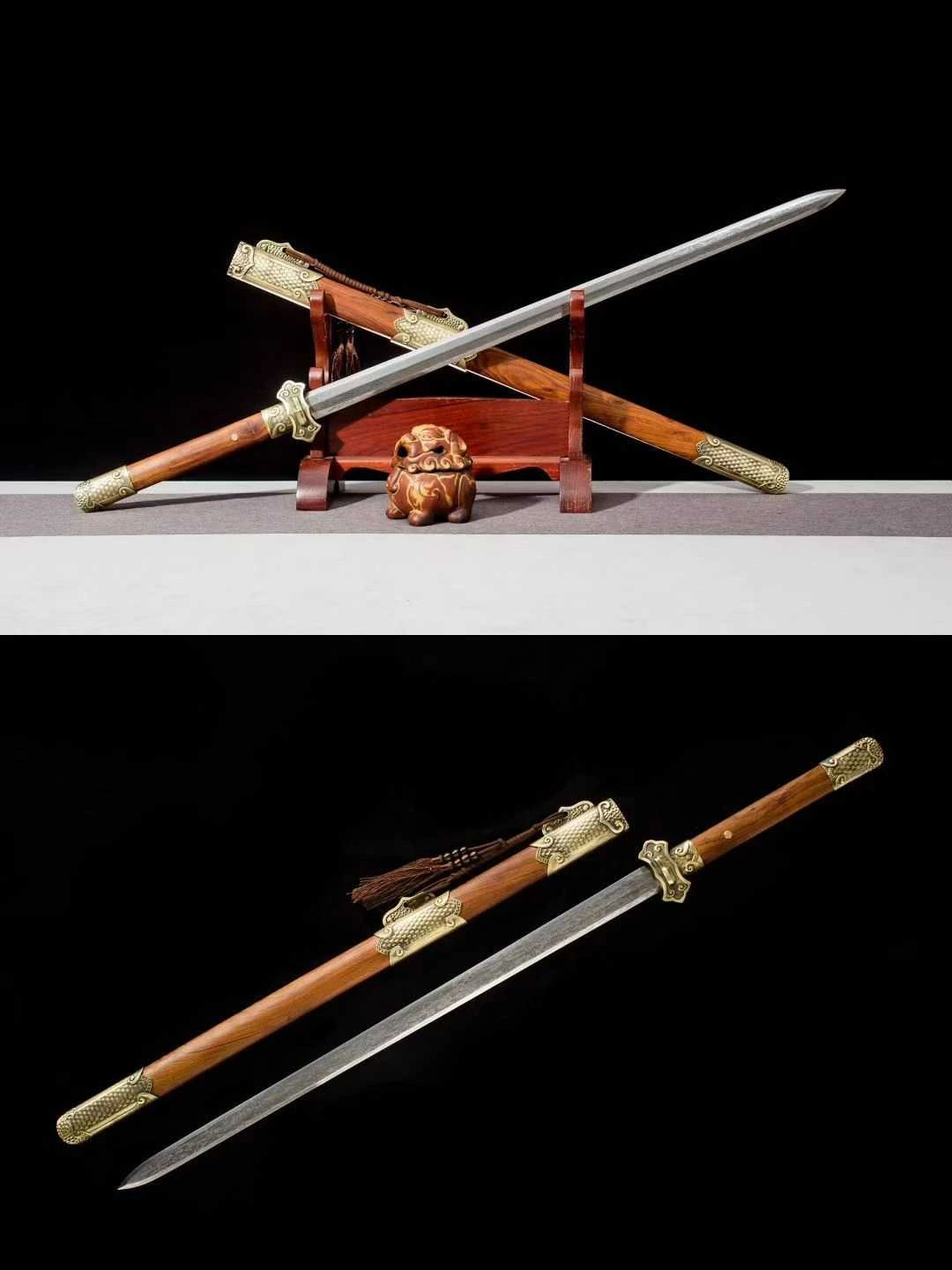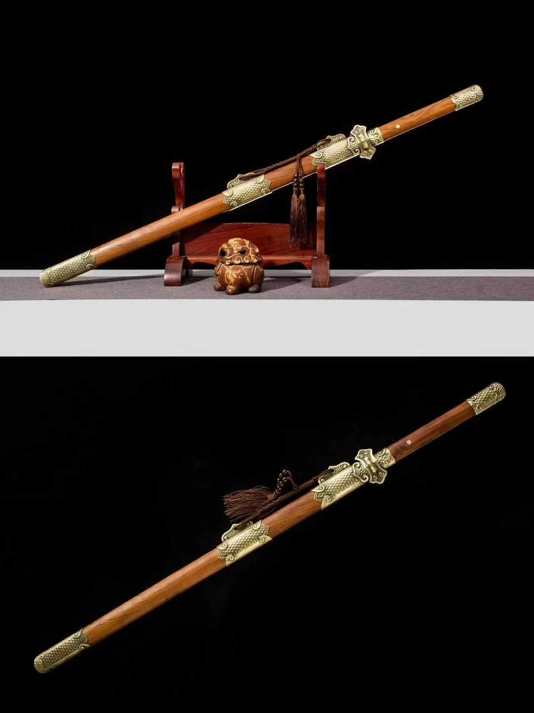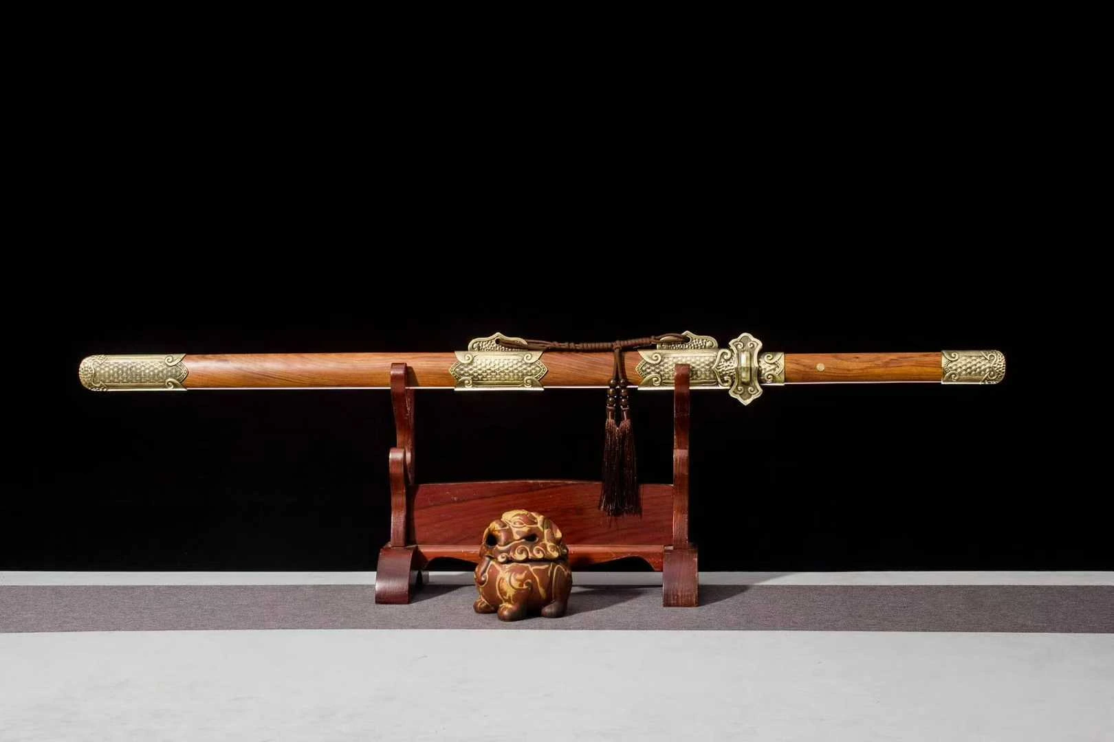 một loại binh khí truyền thống biểu tượng cho trí tuệ và sự chính trực, thường được sử dụng bởi học giả, võ tướng hoặc các bậc cao thủ trong lịch sử Trung Quốc. Đường Kiếm có lưỡi thép rèn từ thép gấp hoa văn, bề mặt hiện rõ đường vân tinh xảo do nhiều lớp thép được gấp và rèn thủ công, vừa tạo độ cứng lẫn độ dẻo, vừa mang giá trị thẩm mỹ cao. Mũi kiếm nhọn, sống lưỡi thẳng, sắc xảo ở cả hai cạnh. Hộ thủ chạm khắc họa tiết mây cuộn cổ điển, chế tác bằng hợp kim đồng, vừa bảo vệ tay cầm vừa tăng tính trang trí. Chuôi kiếm làm từ gỗ tự nhiên vân đỏ, được bịt đầu bằng chụp đồng hoa văn nổi, chắc chắn và cân đối khi cầm. Vỏ kiếm gỗ đỏ mịn, kết hợp các chi tiết chụp, khâu, miệng vỏ bằng đồng vàng khắc họa tiết hoa văn cổ điển; có dây tua trang trí tạo nét uyển chuyển. Các khớp nối và nẹp đồng được gia công tinh tế, ôm khít với thân gỗ, vừa bền bỉ vừa tôn lên giá trị mỹ thuật. Phù hợp trưng bày sưu tầm, biểu diễn võ thuật cổ truyền, hoặc làm đạo cụ trang phục cổ trang – tái hiện hình ảnh kiếm khách.