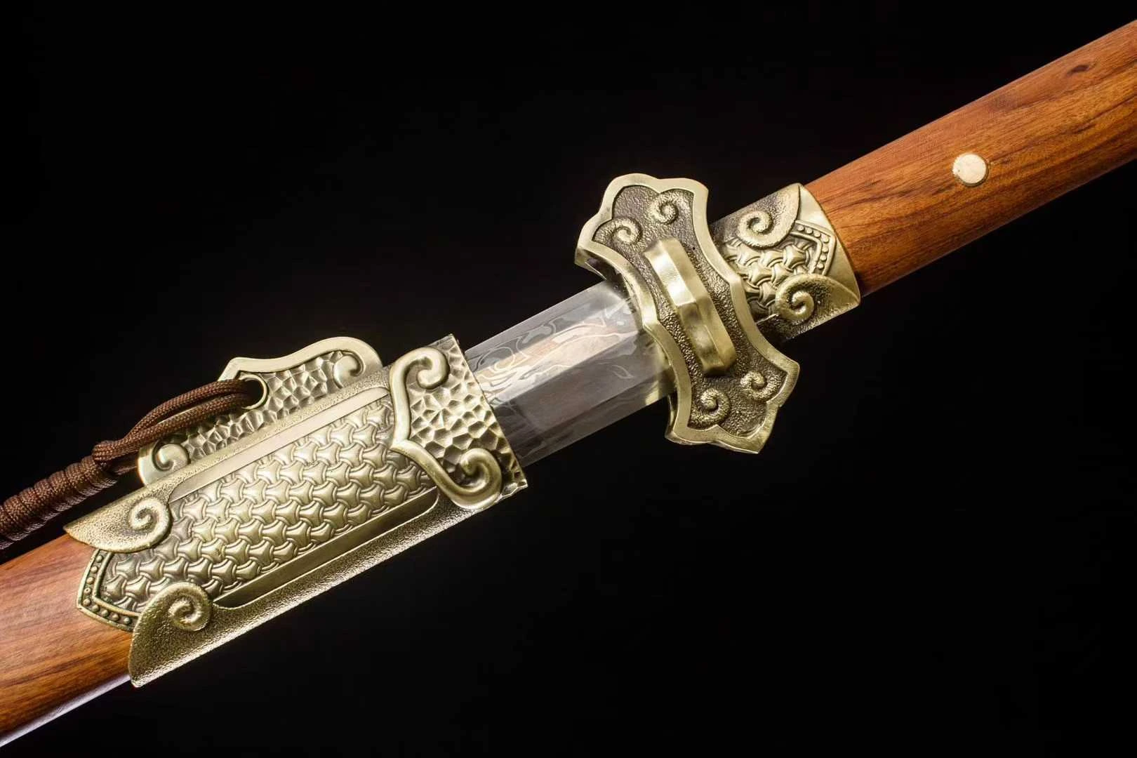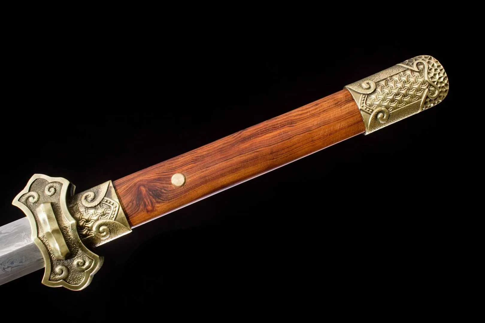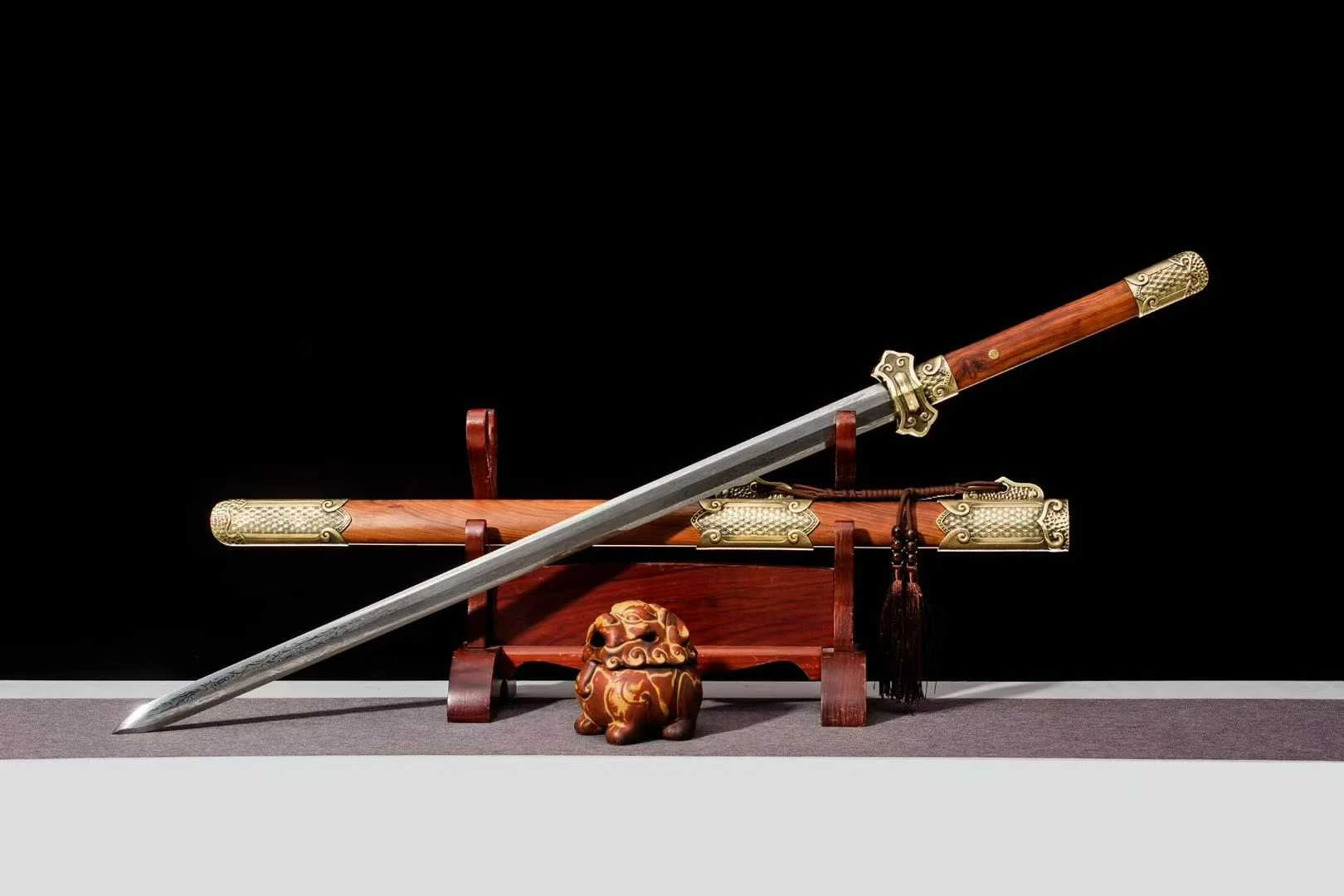 một loại binh khí truyền thống biểu tượng cho trí tuệ và sự chính trực, thường được sử dụng bởi học giả, võ tướng hoặc các bậc cao thủ trong lịch sử Trung Quốc. Đường Kiếm có lưỡi thép rèn từ thép gấp hoa văn, bề mặt hiện rõ đường vân tinh xảo do nhiều lớp thép được gấp và rèn thủ công, vừa tạo độ cứng lẫn độ dẻo, vừa mang giá trị thẩm mỹ cao. Mũi kiếm nhọn, sống lưỡi thẳng, sắc xảo ở cả hai cạnh. Hộ thủ chạm khắc họa tiết mây cuộn cổ điển, chế tác bằng hợp kim đồng, vừa bảo vệ tay cầm vừa tăng tính trang trí. Chuôi kiếm làm từ gỗ tự nhiên vân đỏ, được bịt đầu bằng chụp đồng hoa văn nổi, chắc chắn và cân đối khi cầm. Vỏ kiếm gỗ đỏ mịn, kết hợp các chi tiết chụp, khâu, miệng vỏ bằng đồng vàng khắc họa tiết hoa văn cổ điển; có dây tua trang trí tạo nét uyển chuyển. Các khớp nối và nẹp đồng được gia công tinh tế, ôm khít với thân gỗ, vừa bền bỉ vừa tôn lên giá trị mỹ thuật. Phù hợp trưng bày sưu tầm, biểu diễn võ thuật cổ truyền, hoặc làm đạo cụ trang phục cổ trang – tái hiện hình ảnh kiếm khách.