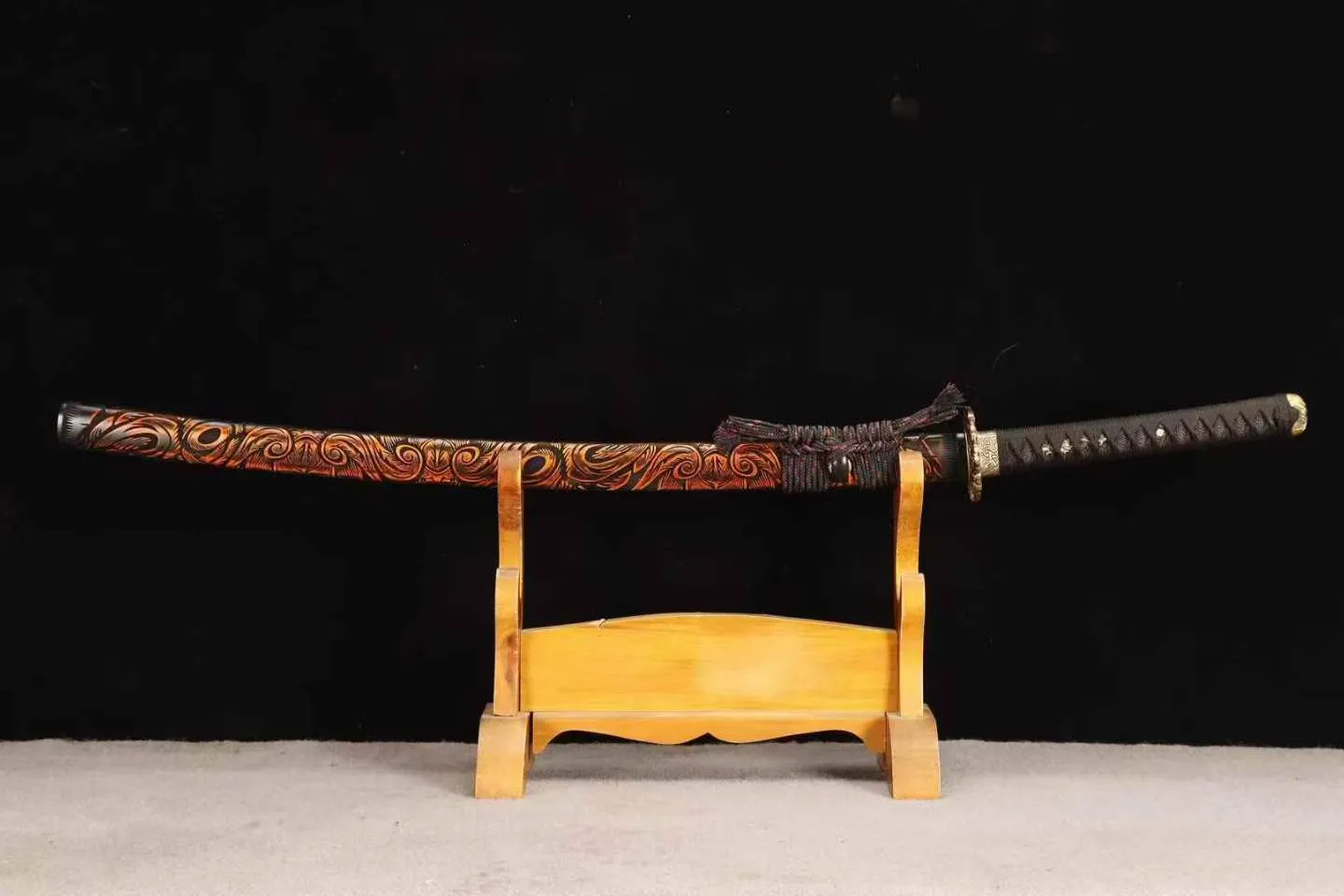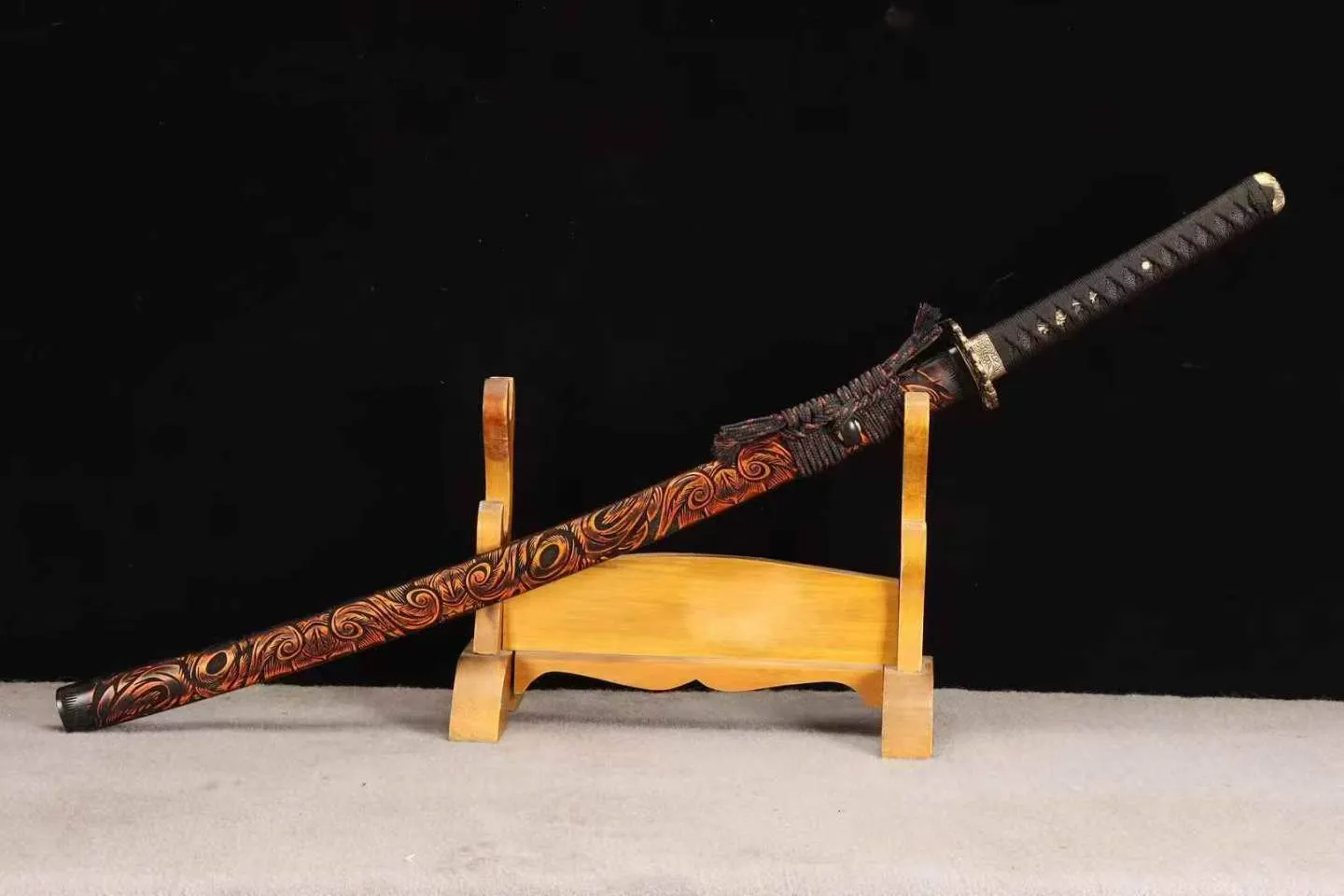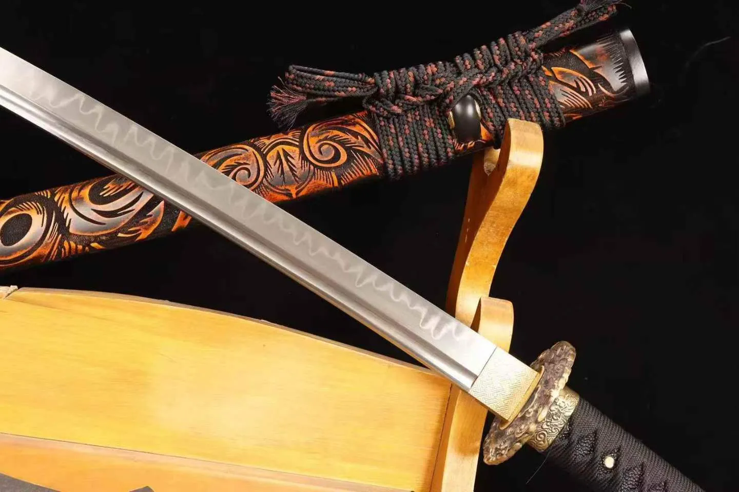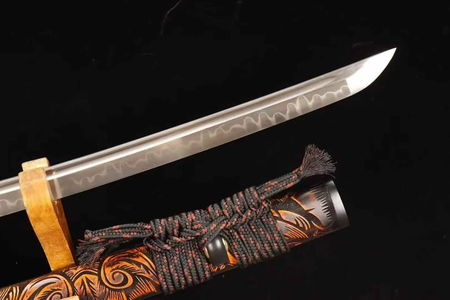 Vỏ katana sơn họa tiết xoáy cam – than mô phỏng dòng dung nham, mang vẻ đẹp nổi bật và giàu tính thẩm mỹ. Enkazan Katana phù hợp cho người yêu kiếm tìm một mẫu sắc sảo, mạnh mẽ và độc đáo khi trưng bày, sưu tầm và tập luyện kiếm đạo.