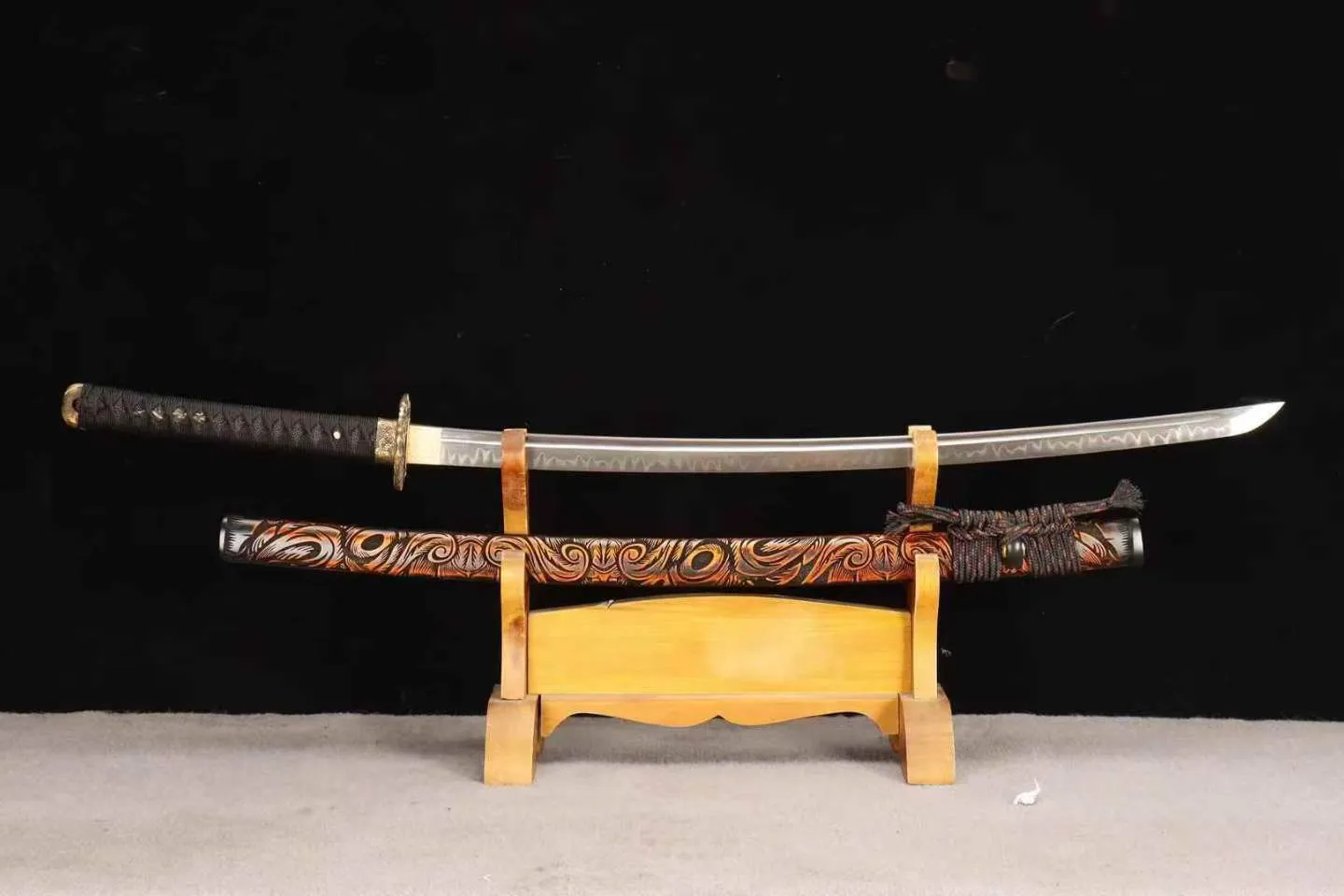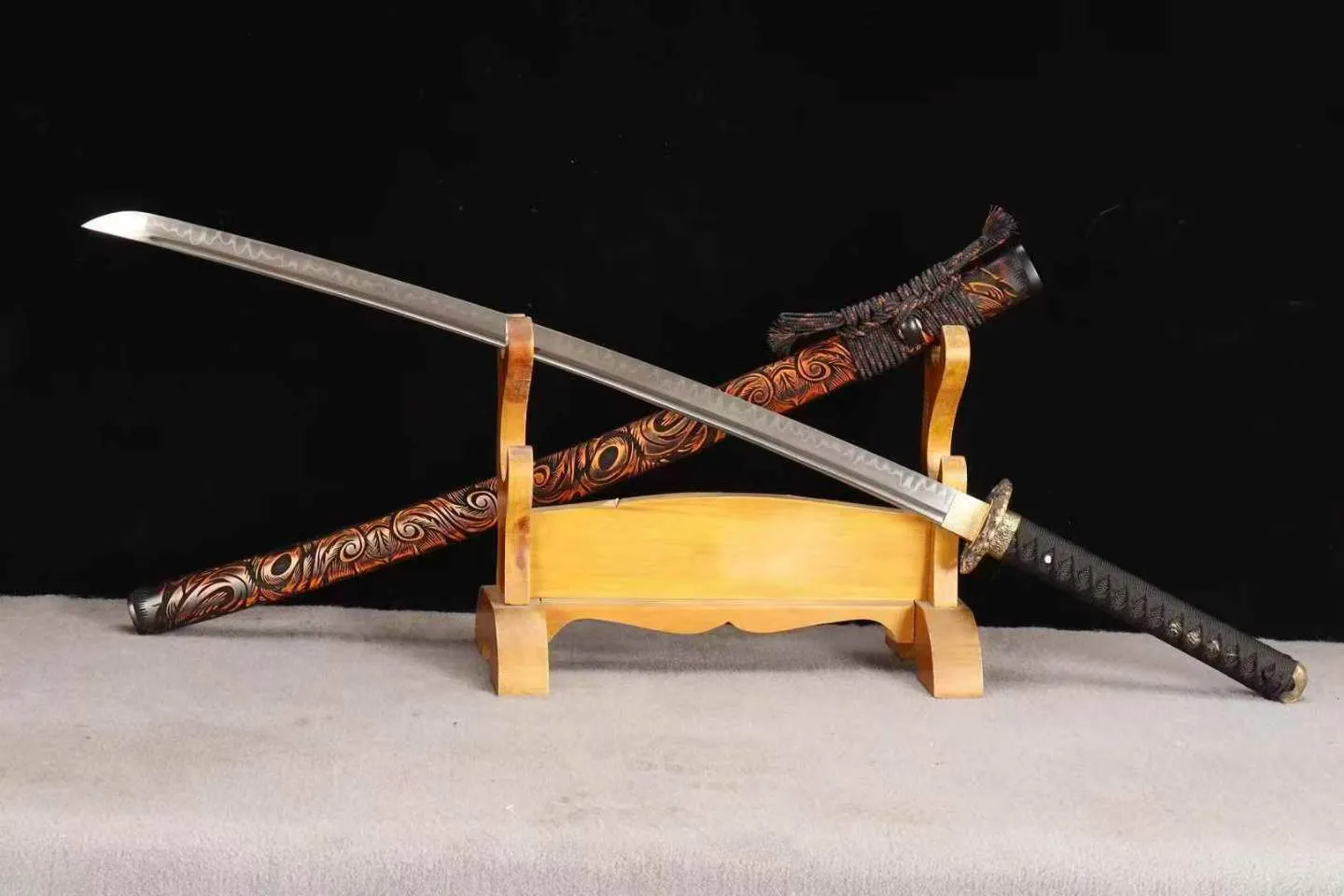 Loại kiếm: Katana, fulltang, rèn tay truyền thống , chất liệu lưỡi thép: T10 – độ cứng cao & độ sắc tiêu chuẩn, có thể tùy chỉnh theo yêu cầu