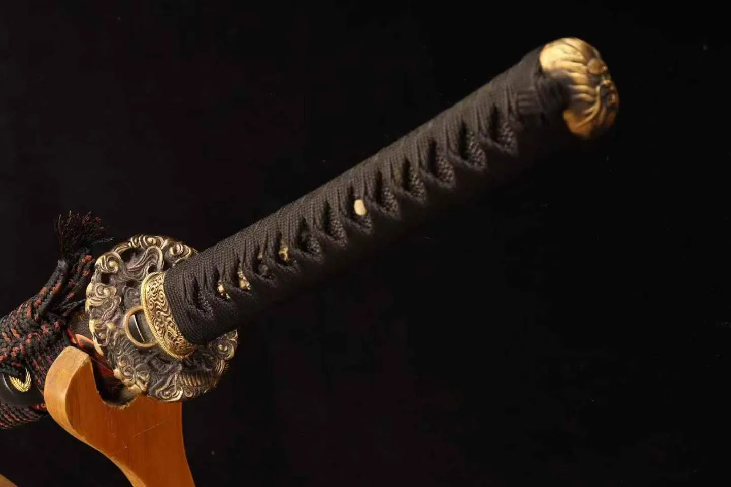 Tay cầm katana làm từ gỗ, lót da cá nhân tạo và quấn dây màu đen – đỏ, mang lại cảm giác chắc tay, không trơn trượt và bám tốt trong mọi tư thế. Bộ phụ kiện đồng thau gồm tsuba và habaki được chế tác hoa văn cổ điển, tạo điểm nhấn mạnh mẽ, đồng bộ với tổng thể thiết kế.
