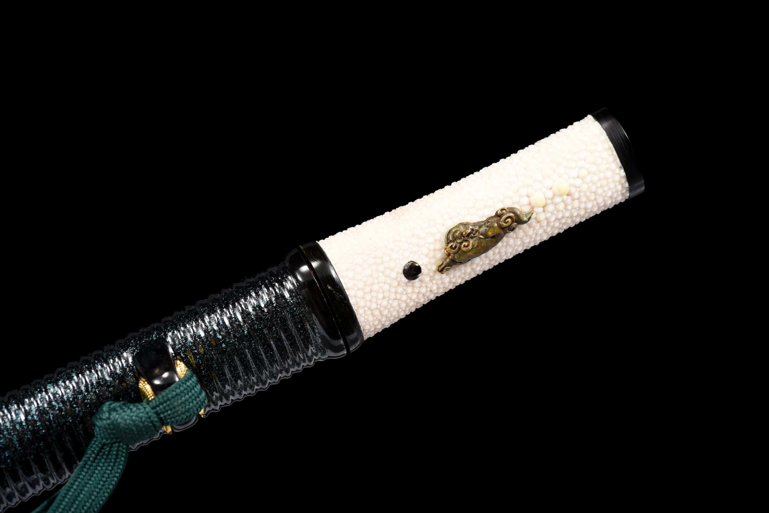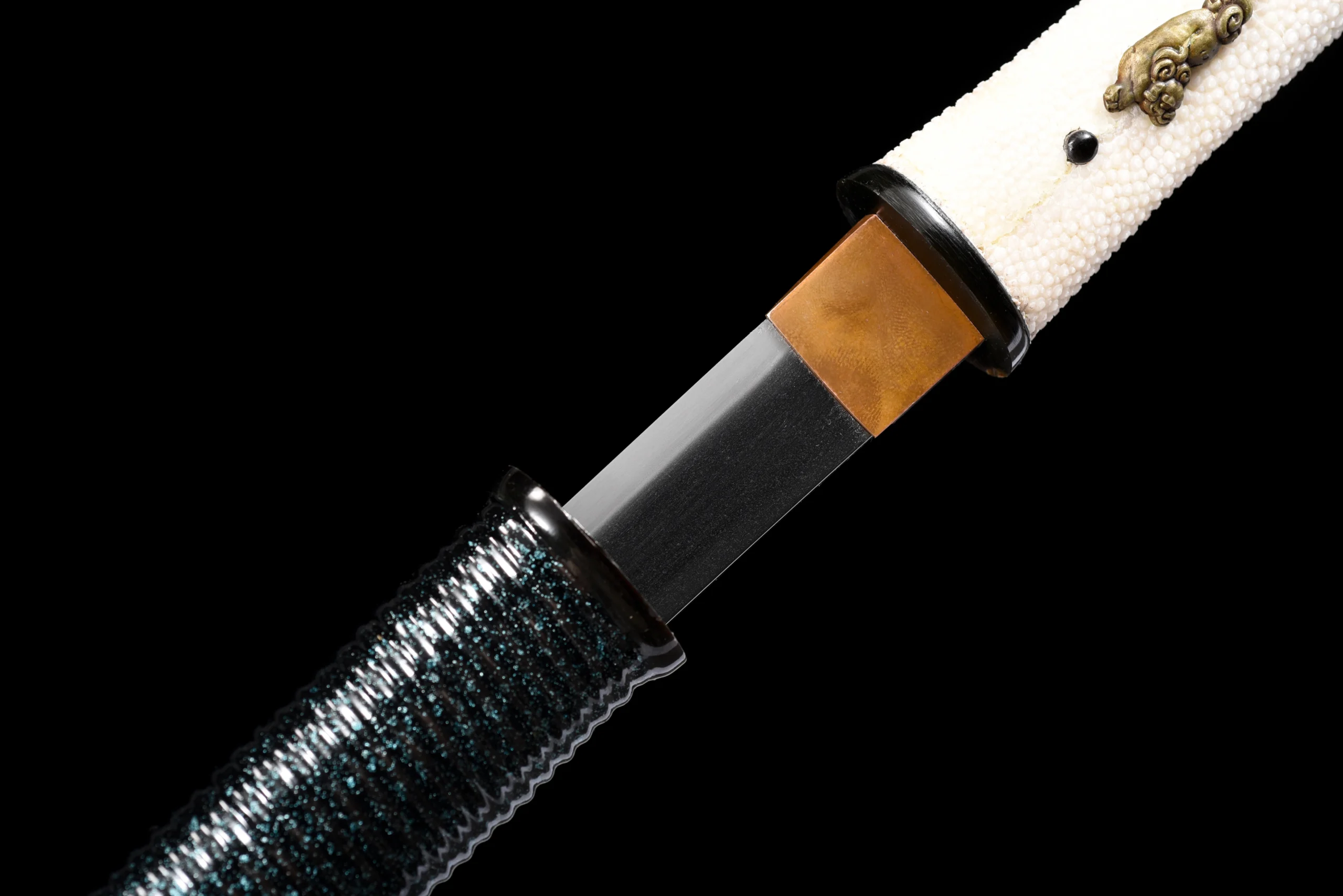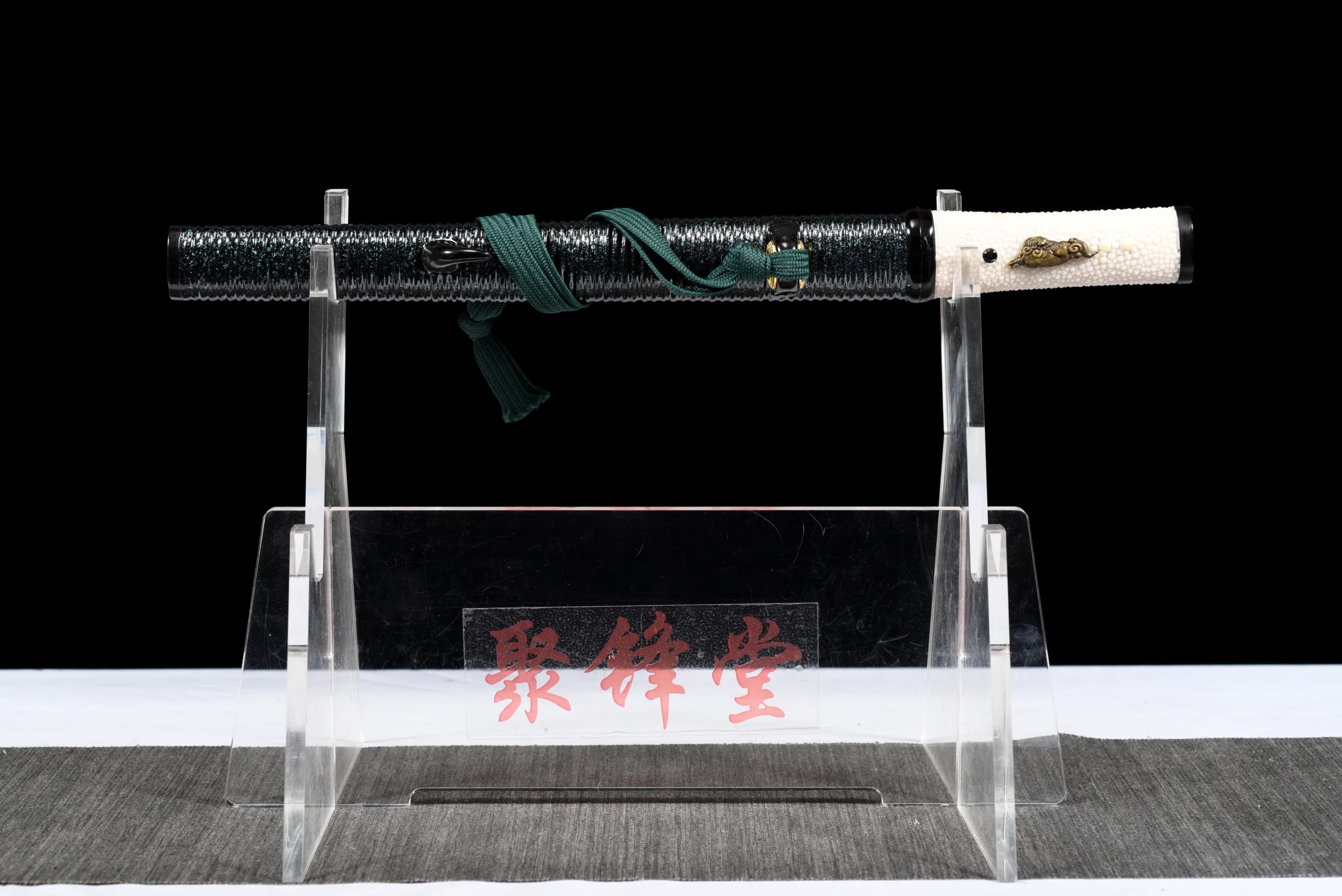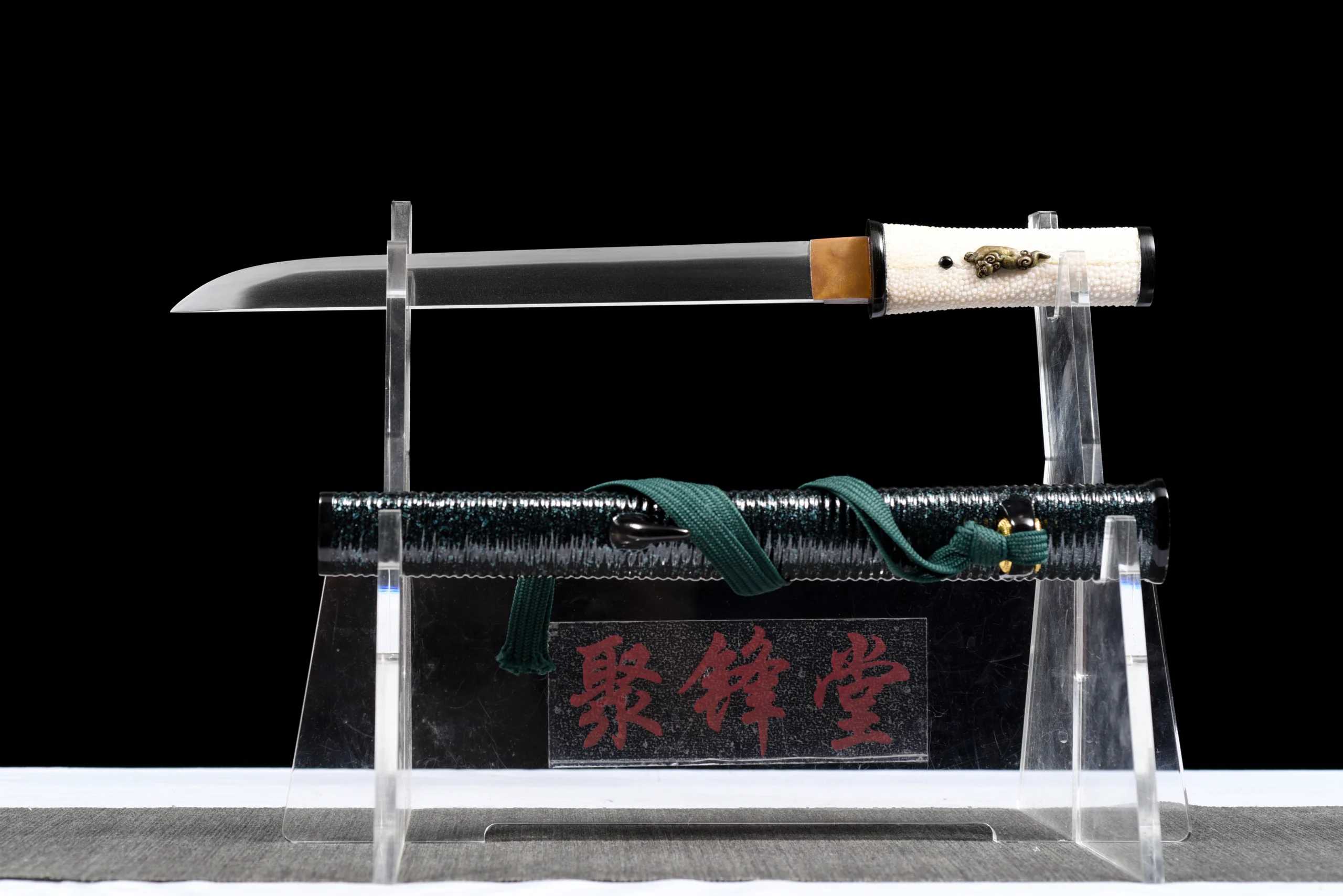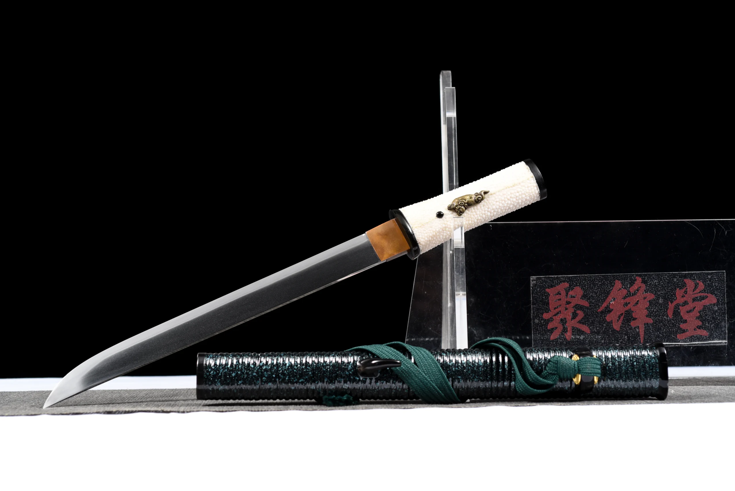 Thanh Tanto này được rèn từ thép Tamahagane truyền thống Nhật Bản, loại thép nổi tiếng bởi độ cứng, độ bền và vẻ đẹp độc nhất sau quá trình luyện tinh xảo. Lưỡi kiếm sắc xảo, sáng gương, giữ trọn tinh thần của dòng kiếm ngắn chiến đấu cổ điển. Habaki bằng đồng đỏ chắc chắn, khớp chặt với lưỡi, đảm bảo độ ổn định khi sử dụng. Tay cầm được bọc da cá đuối tự nhiên, trang trí họa tiết menuki tinh xảo, mang lại cảm giác cầm nắm vừa sang trọng vừa bền bỉ. Vỏ kiếm chế tác từ gỗ sơn mài khảm sừng, thắt dây Oxford xanh đậm, nổi bật vẻ cao cấp và cổ điển.