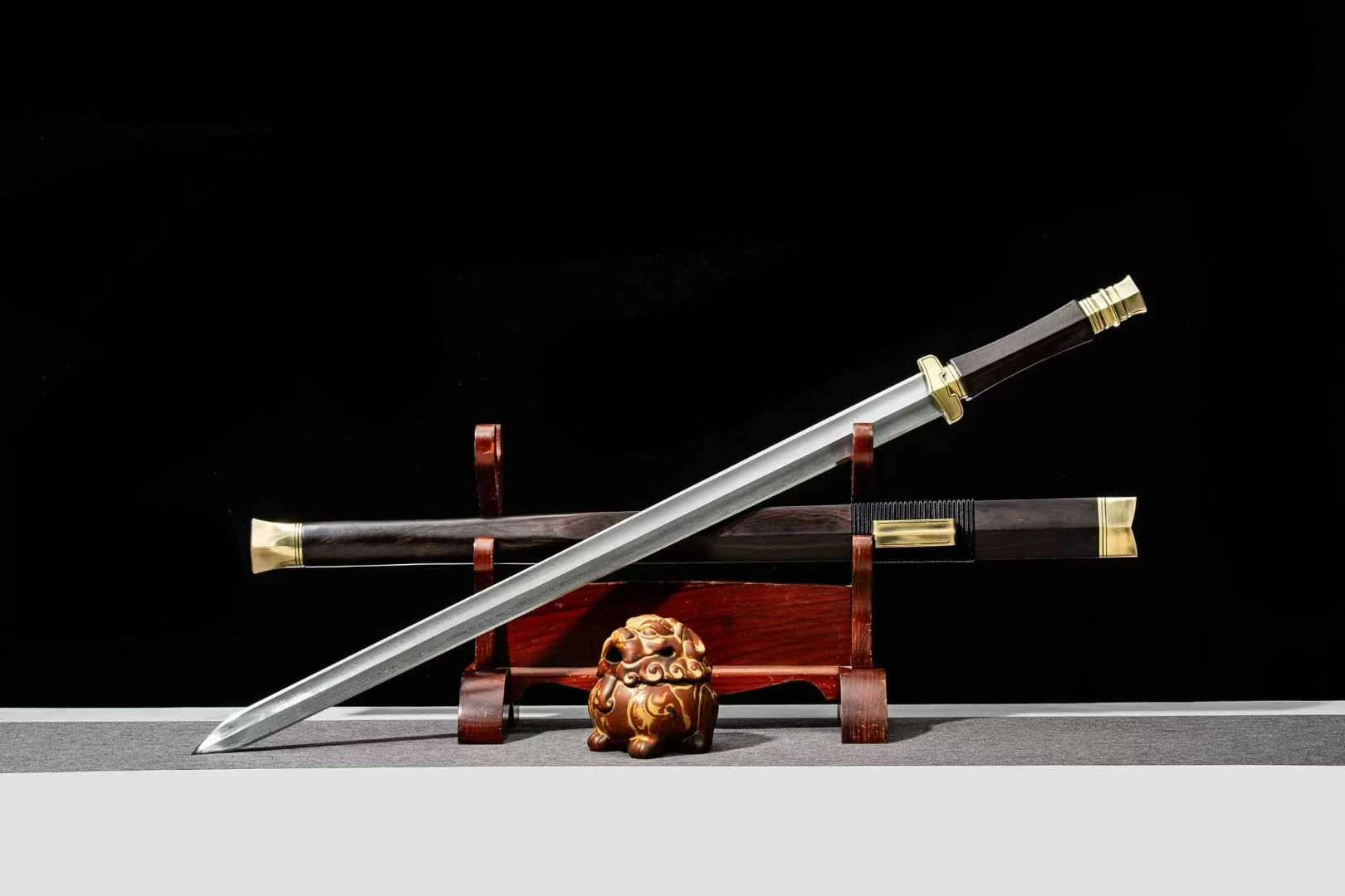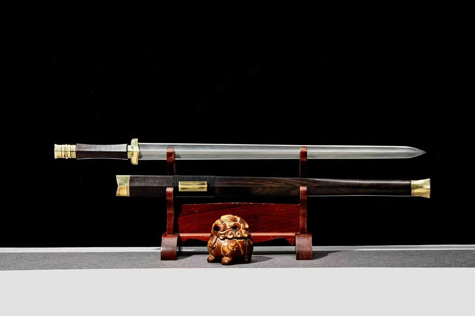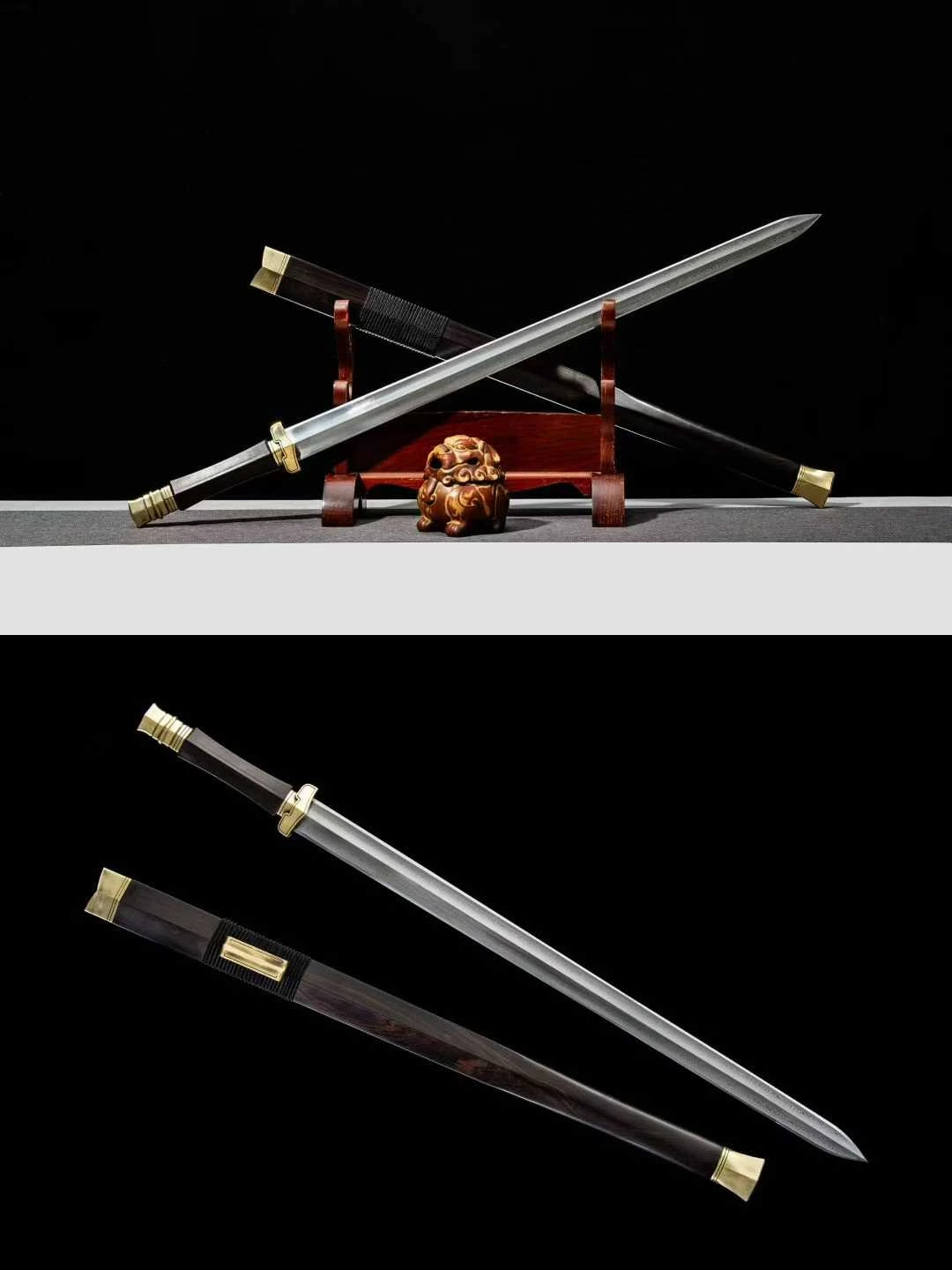 Lấy cảm hứng từ tinh hoa vũ khí thời nhà Hán, thanh bảo kiếm này mang thiết kế kiếm thẳng song nhận đặc trưng, được chế tác thủ công tỉ mỉ, từng chi tiết tái hiện tinh thần cổ xưa kết hợp với chất liệu hiện đại để đạt độ bền và độ sắc tối ưu. Lưỡi của thanh Hán Kiếm này rèn thép gấp hoa văn Damascus với đường vân chạy dọc, bề mặt mài bóng, cạnh sắc bén, mũi nhọn đối xứng. Chuôi gỗ cứng cao cấp, dáng thon, bọc chặt bằng ốp đồng thau mạ vàng cổ, đảm bảo độ bền chặt cho thanh Hán Kiếm và đem lại cảm giác đầm khi cầm trên tay. Hộ thủ thiết kế bản dẹt thời Hán, đơn giản nhưng chắc chắn, giữ an toàn cho tay cầm. Vỏ làm từ gỗ mun gắn phụ kiện đồng thau đồng bộ với chuôi, tạo sự sang trọng và cổ điển. Phù hợp cho trưng bày sưu tầm, biểu diễn võ thuật cổ truyền, hoặc làm quà tặng giá trị cho những ai yêu thích lịch sử và văn hóa vũ khí phương Đông.