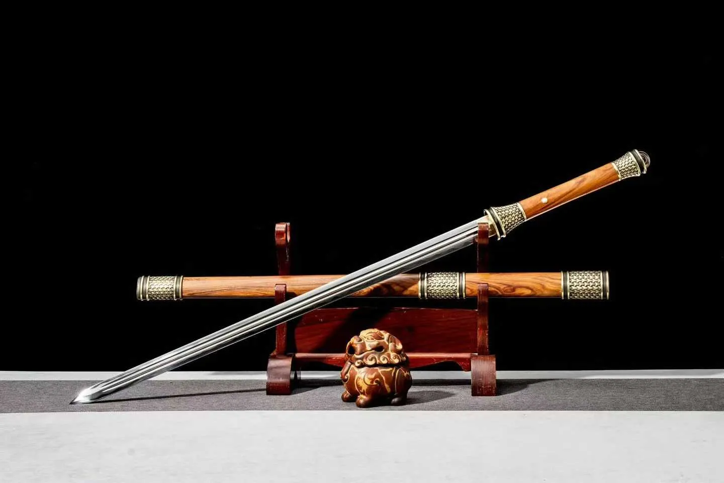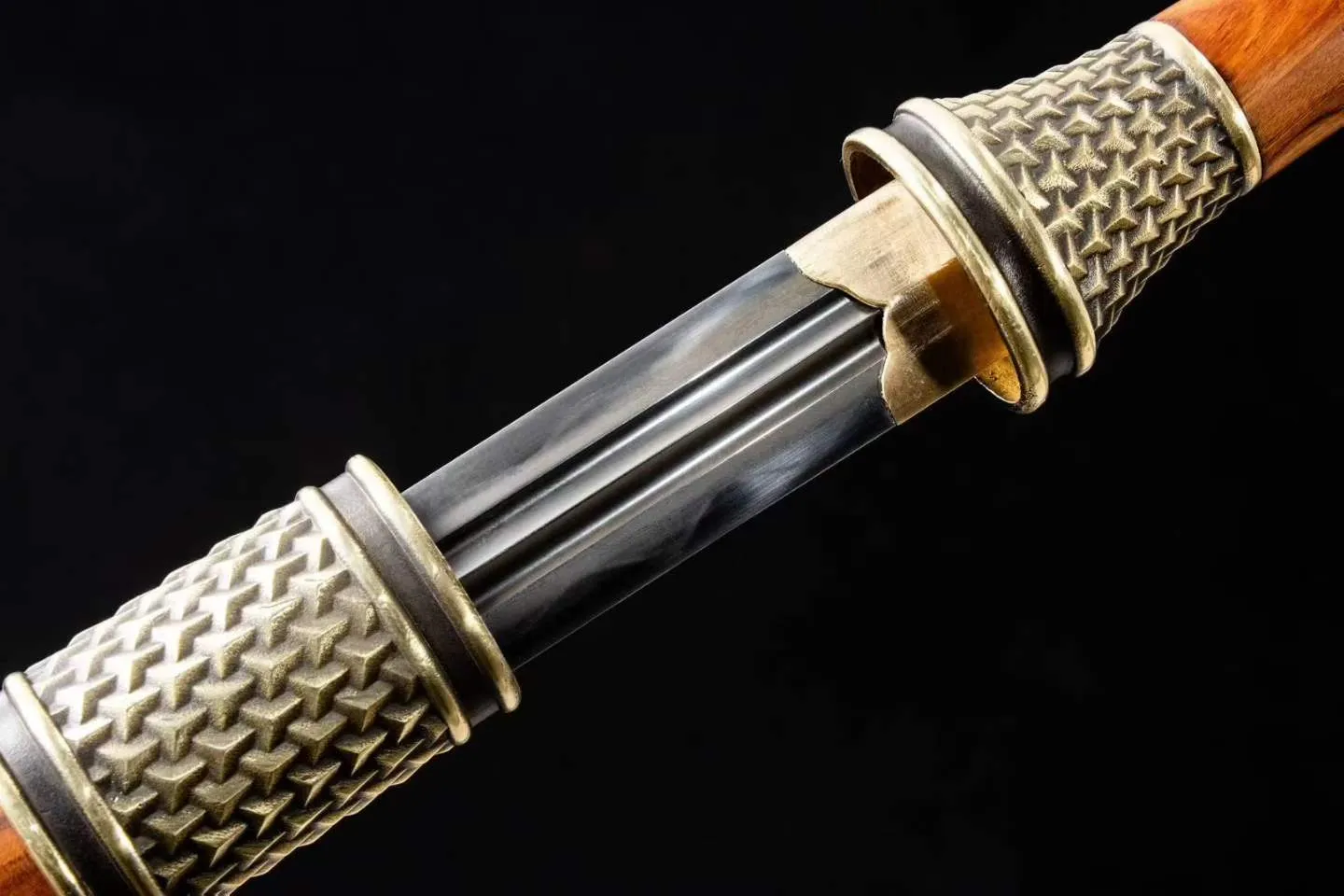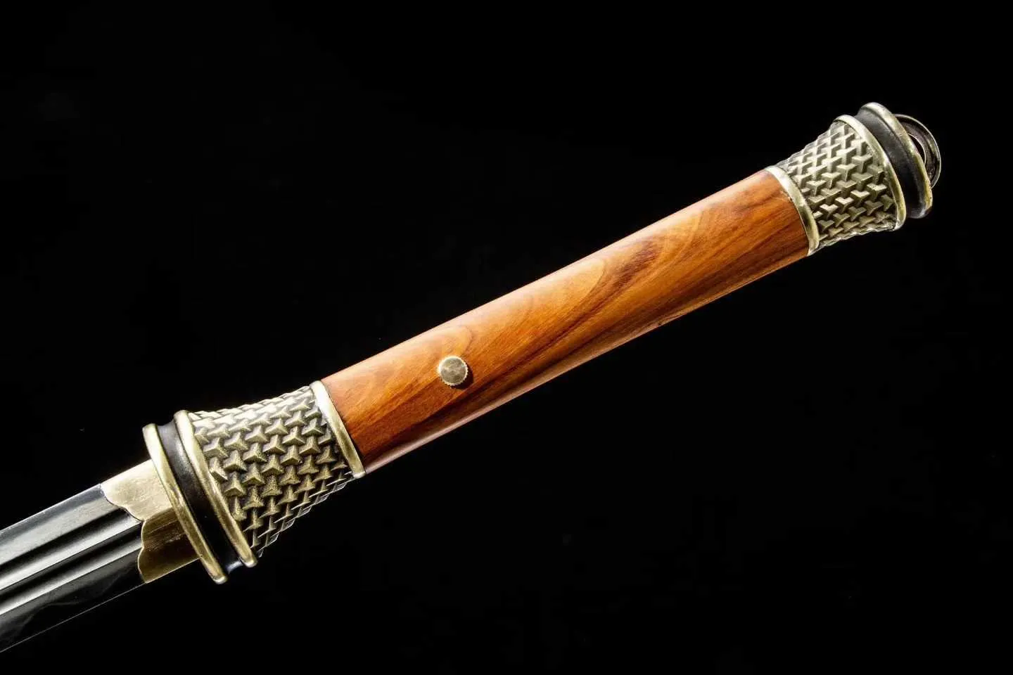 Phần tay cầm bằng gỗ được giữ nguyên vân tự nhiên, mang lại cảm giác chắc tay và vẻ đẹp mộc mạc đặc trưng của dòng kiếm Hán cổ. Bộ phụ kiện đồng thau chạm họa tiết cổ điển giúp tổng thể thanh kiếm có thêm chiều sâu và sự uy nghi.