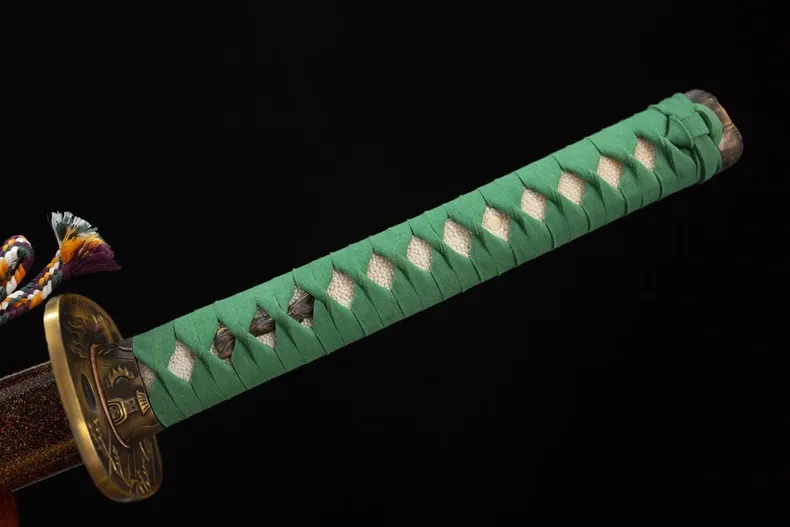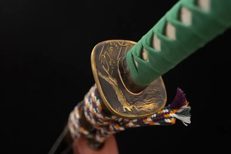 Phần habaki và tsuba bằng đồng thau được hoàn thiện theo tông vàng trầm, tạo điểm nhấn ấm áp, hài hòa với chủ đề mùa xuân. Tay cầm gỗ nguyên khối lót da cá đuối, quấn theo kiểu truyền thống, cho cảm giác cầm chắc tay và độ bám tốt. Harusame Katana phù hợp cho trưng bày cao cấp, sưu tầm cá nhân và làm quà tặng mang ý nghĩa khởi đầu, sinh khí và tinh thần tái sinh.
