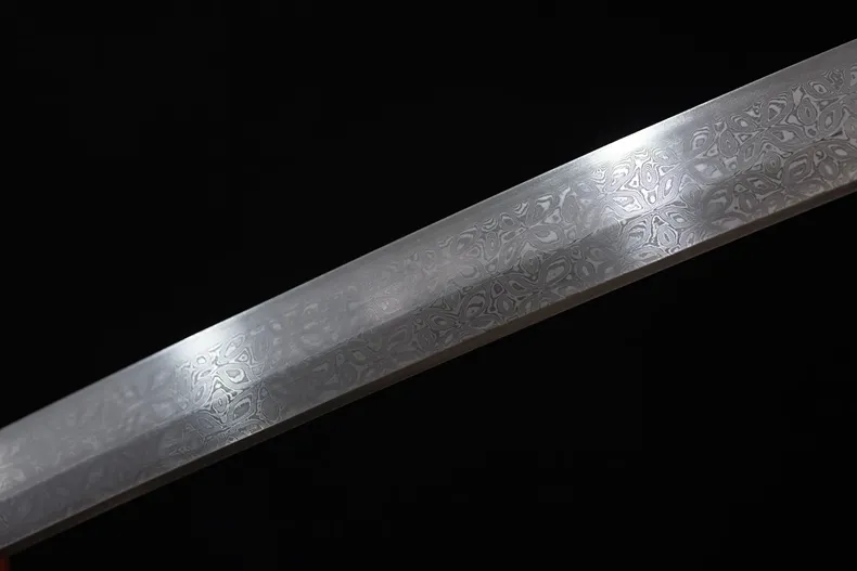 Lưỡi katana được chế tác từ thép hoa văn tạo hình bằng công nghệ laser, tạo nên các lớp hoa văn đều, sắc nét và ổn định trên bề mặt lưỡi. Hoa văn laser mang giá trị thẩm mỹ cao, giúp lưỡi kiếm nổi bật khi quan sát dưới ánh sáng, đồng thời dễ bảo quản và duy trì độ hoàn thiện theo thời gian. Cấu trúc lưỡi gọn gàng, sống lưỡi rõ, tạo cảm giác liền mạch và cân đối.