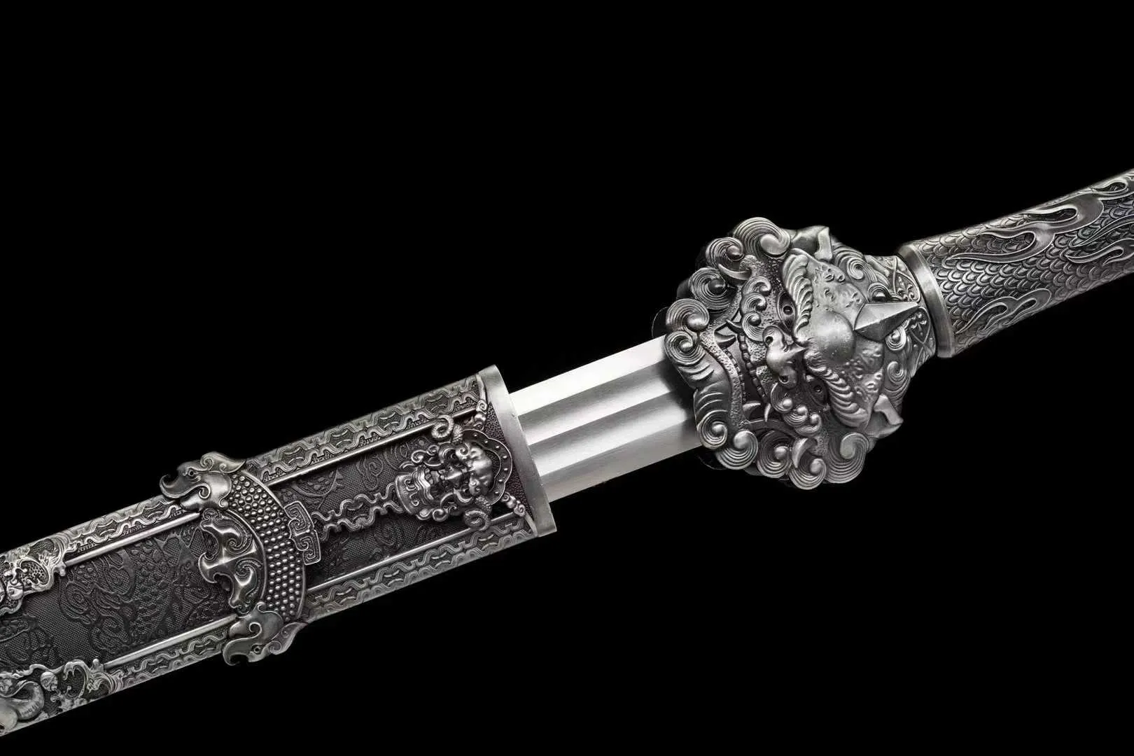 Phần habaki và tsuba bằng hợp kim được gia công chắc chắn, tạo liên kết liền mạch giữa lưỡi và tay cầm Hán kiếm. Tay cầm hợp kim chạm khắc tinh xảo, cho cảm giác cầm nắm ổn định. Vỏ gỗ nguyên khối bọc da PU giúp Hán kiếm dễ bảo quản, phù hợp cho trưng bày, sưu tầm và làm quà tặng cao cấp.