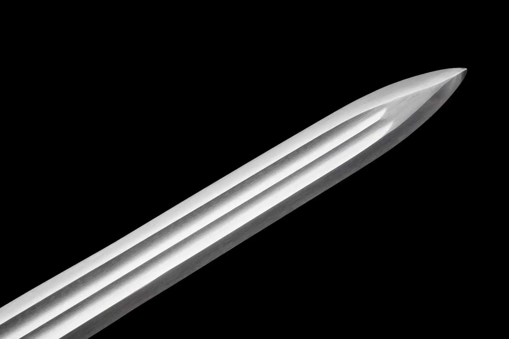 Lưỡi Hán kiếm được rèn từ thép mangan, nổi bật với độ dẻo dai tốt và khả năng giữ hình dạng ổn định. Bề mặt lưỡi được xử lý sạch, phản sáng đều, giúp Hán kiếm thể hiện rõ chiều sâu kim loại và cảm giác cứng cáp khi quan sát ở nhiều góc độ. Phong cách hoàn thiện này phù hợp với người tìm kiếm một Hán kiếm có tính thẩm mỹ rõ ràng và bố cục chuẩn mực.