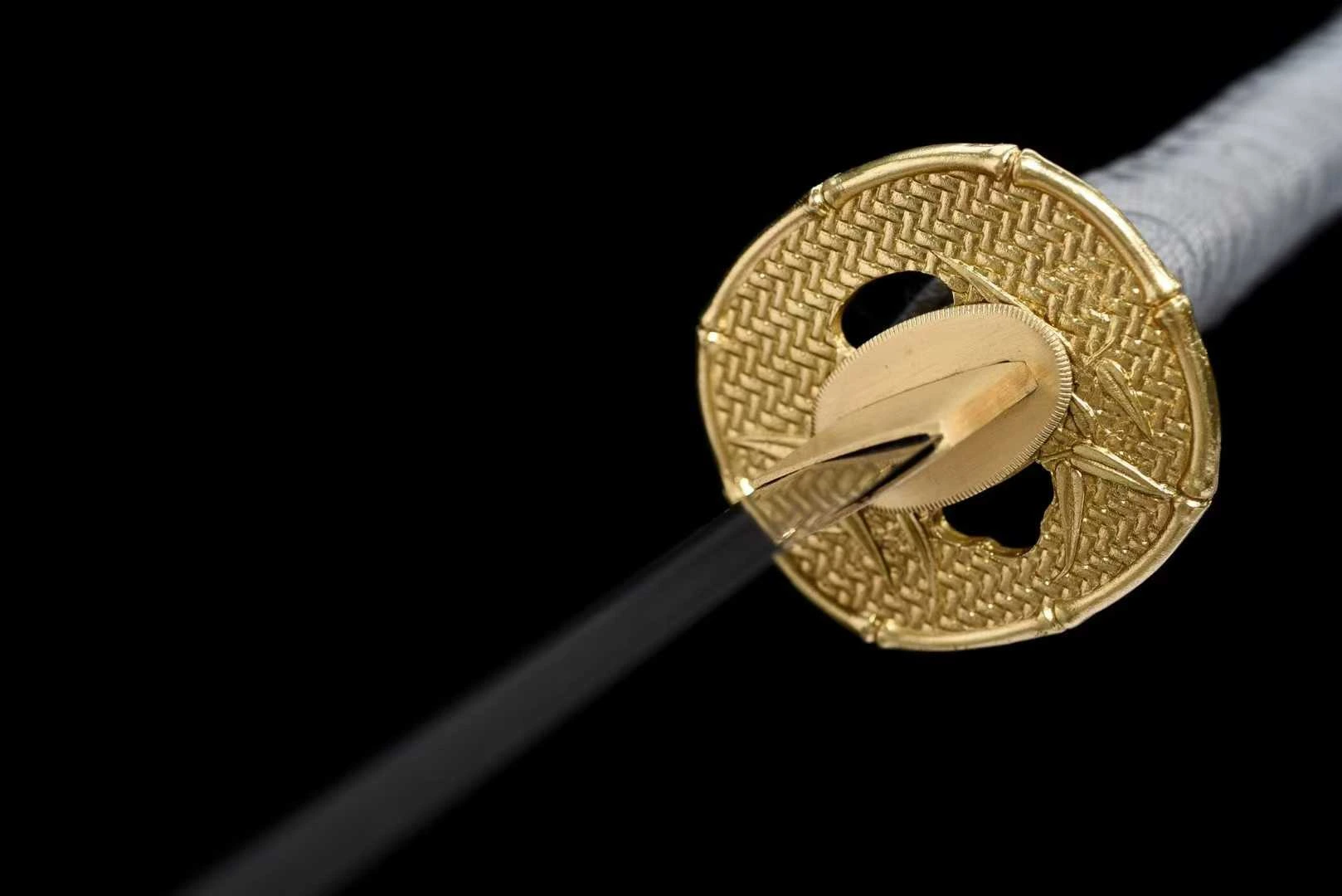 Sở hữu cấu trúc katana chuẩn mực với độ hoàn thiện cao, mẫu kiếm này sử dụng thép 1095 carbon cao – một trong những loại thép lý tưởng để tạo ra lưỡi bén, cứng, và khả năng giữ cạnh vượt trội. Trên nền thép là đường hamon rõ nét, được tạo ra bằng kỹ thuật tôi đất thủ công truyền thống, giúp tăng cường độ cứng cho lưỡi mà vẫn giữ lại độ dẻo cho sống kiếm. Đây không chỉ là hiệu ứng thẩm mỹ, mà còn là minh chứng cho tay nghề rèn đỉnh cao. Lưỡi kiếm thép 1095 với hàm lượng carbon cao (0.95%), được mài sắc xảo, đường hamon nổi bật hình sóng đều, phản chiếu ánh sáng đẹp mắt. Tsuba (hộ thủ) đồng vàng đúc họa tiết nan tre lồng ghép, tạo điểm nhấn cổ điển, vừa bảo vệ tay cầm vừa gia tăng tính thẩm mỹ. Tsuka (chuôi) quấn ito xám truyền thống, kết hợp menuki kim loại mạ vàng và nền da cá ngọc trai tạo độ bám chắc tay khi sử dụng. Kashira và Fuchi đồng khảm họa tiết đan tre, đồng bộ với tsuba, tạo nên sự nhất quán và sang trọng. Saya (vỏ kiếm) sơn đen vân rạn giả cổ, kết hợp sageo trắng vàng thắt cầu kỳ, đem lại phong thái tinh tế và trang nhã.