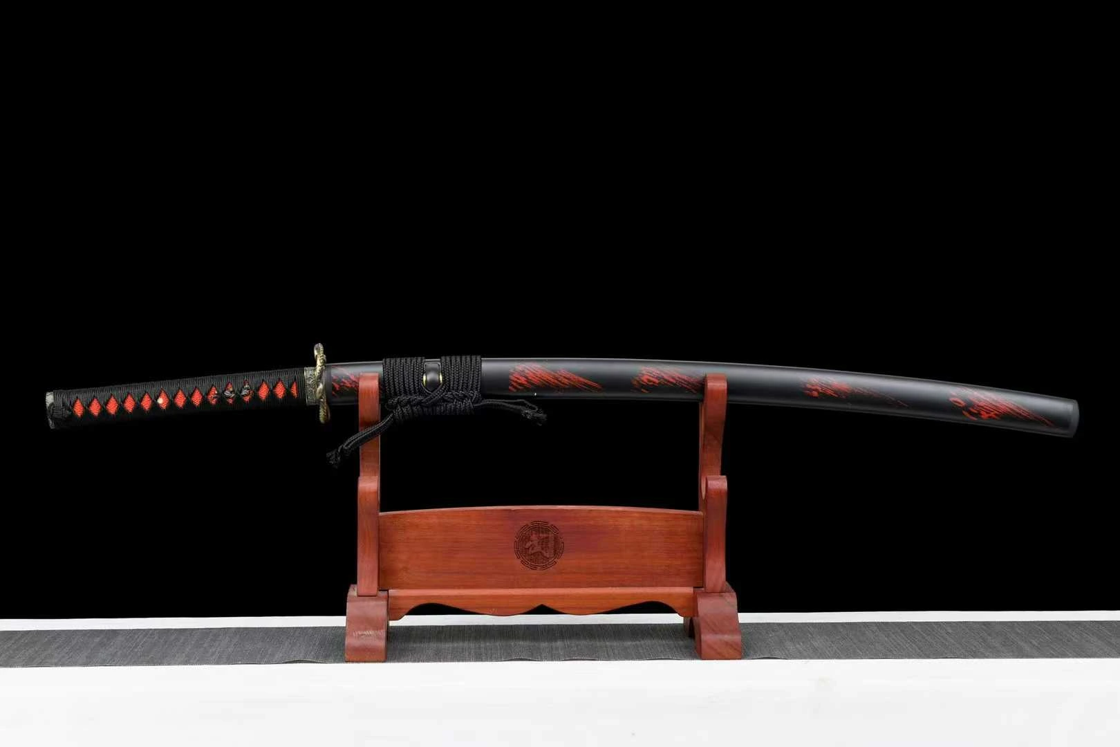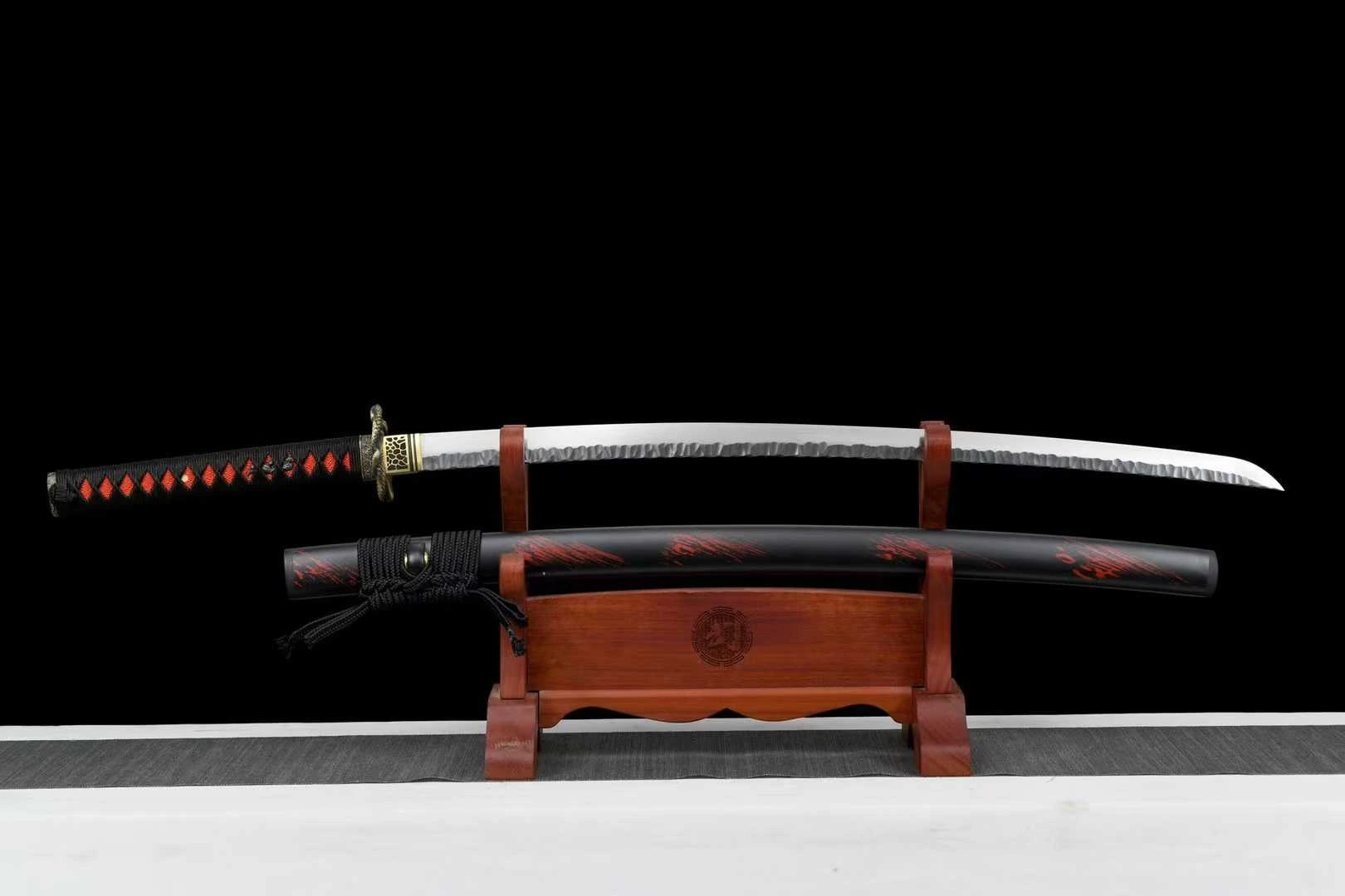 Lưỡi kiếm rèn từ thép gấp nhiều lớp, lưỡi bén sắc, có vân thép damacus uốn lượn rõ nét từ sống đến mép. Bề mặt được xử lý thủ công tạo đường hamon thô độc đáo, tsuba hình rắn quấn, tạc chi tiết vảy da, đầu rắn nhô ra như đang phục kích chất liệu hợp kim cao cấp mạ giả cổ. Habaki & Seppa tinh xảo với họa tiết tổ ong vàng đồng, tạo điểm nhấn sang trọng giữa phần lưỡi và cán, vừa tăng độ chắc chắn vừa hoàn thiện tính thẩm mỹ. Tsuka quấn ito đen kết hợp samegawa đỏ rực bên dưới, tạo cảm giác như vảy rắn lộ ra dưới lớp vải — tương phản mạnh mẽ, đậm chất chiến binh bóng tối. Menuki hình rắn ẩn hiện dưới lớp quấn tạo thêm chiều sâu và tính biểu tượng. Saya sơn mài đen lì với họa tiết vệt đỏ loang lổ như vết máu chém — không đều mà có chủ đích, thể hiện tính cách cuồng nộ và bi tráng. Kèm sageo đen buộc truyền thống, tôn dáng kiếm khi trưng bày hoặc đeo thắt lưng