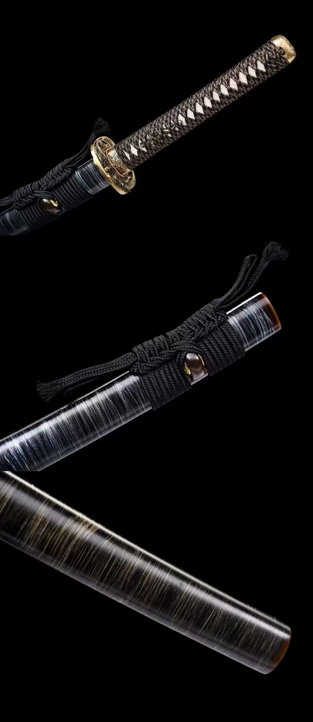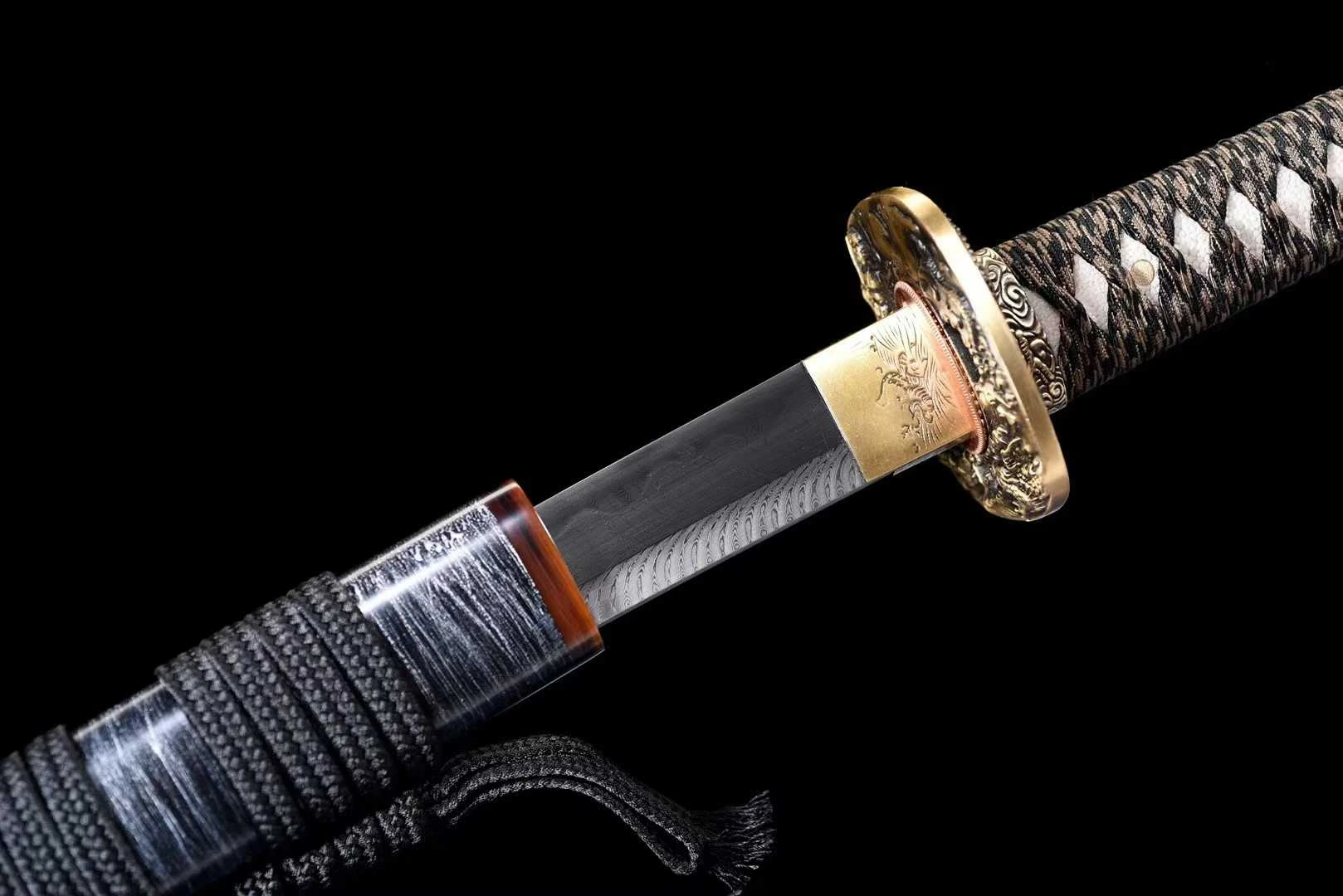 Thanh katana sở hữu lưỡi thép gấp damascus với họa tiết sóng cuộn và vân thép nổi bật trải dài khắp thân kiếm. Mỗi lớp gấp thép là một nhát rèn kỳ công, tạo nên đường vân tự nhiên đan xen như mắt lưới – vừa uyển chuyển, vừa dữ dội. Kết hợp cùng đường sống lưỡi bo-hi chạy dọc, không chỉ tạo điểm nhấn thẩm mỹ mà còn giúp giảm trọng lượng kiếm khi vung. Tsuba được chế tác cầu kỳ từ đồng thau nguyên khối, khắc nổi hình tượng võ thần cưỡi rồng, biểu trưng cho sức mạnh và sự bảo hộ. Bộ seppa – habaki chạm khắc rồng lửa uốn lượn tiếp nối với tsuba – tạo thành một tổng thể liền mạch giàu chi tiết, sang trọng mà vẫn mang khí chất chiến binh. Tsuka bọc dây ito đen pha trắng, đan chéo tỉ mỉ trên nền samegawa trắng, giúp tăng độ bám tay và cảm giác chắc chắn. Đầu cán và chốt đều sử dụng họa tiết hoa văn đồng khắc thủ công. Saya là điểm nổi bật không thể bỏ qua – làm từ sừng trâu bóng loáng với hiệu ứng vân đen xám bạc ánh kim, cho cảm giác ẩn hiện trong bóng tối. Sageo đen được thắt tinh tế, đảm bảo độ bền và thẩm mỹ cho việc đeo kiếm hoặc trưng bày.