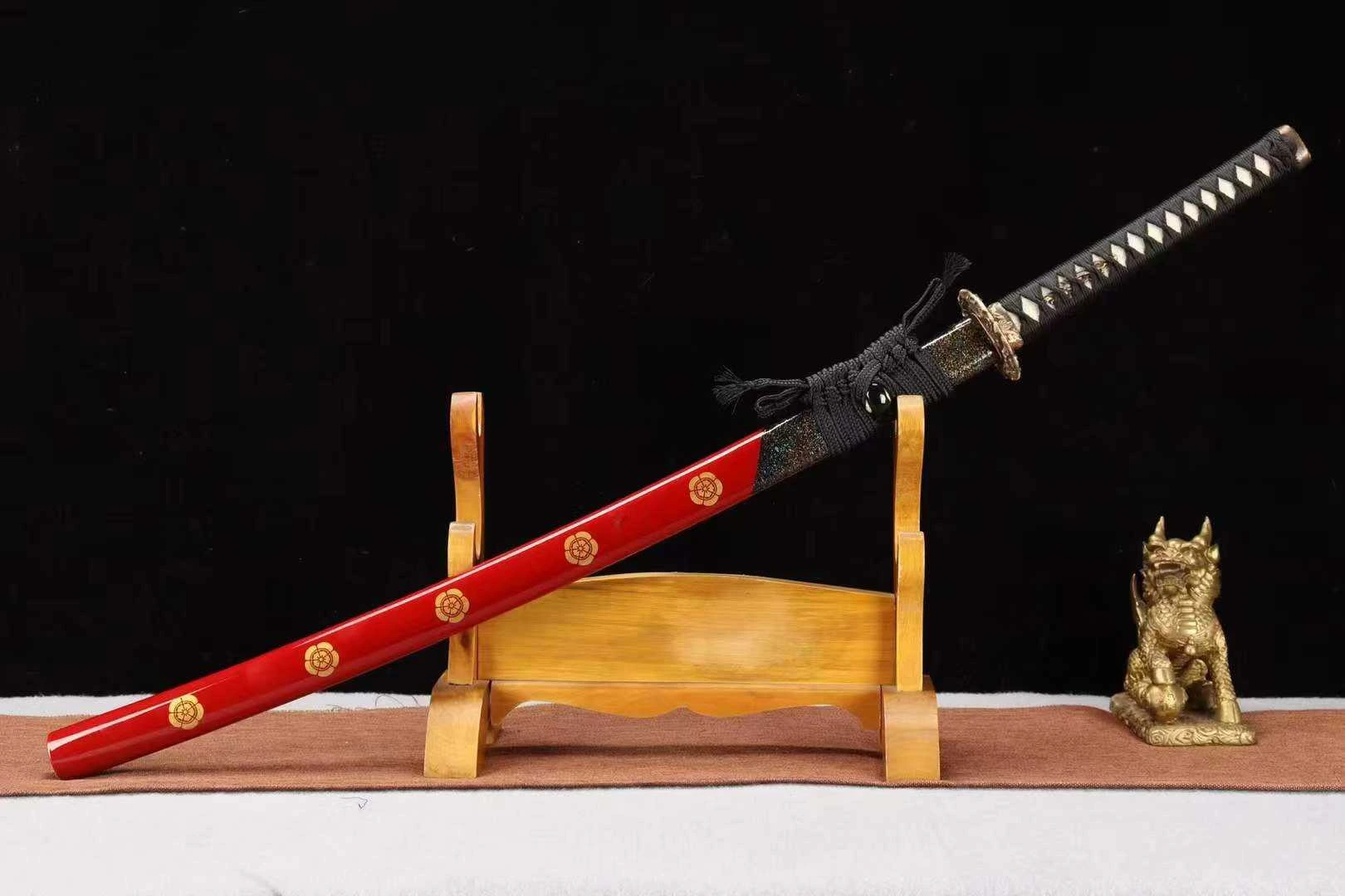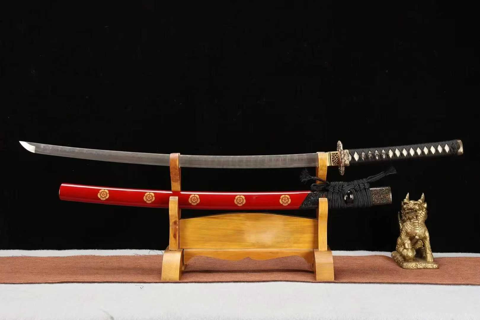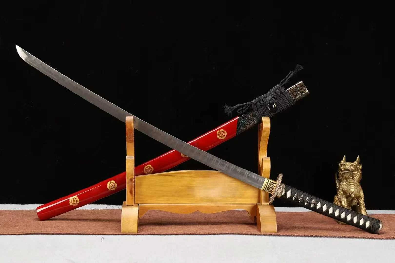 Lưỡi katana được rèn từ thép gấp thủ công, tạo nên những vân thép đẹp mắt uốn lượn theo từng lớp xếp chồng tinh xảo hiệu ứng thị giác đặc trưng độ cứng cân bằng, lưỡi bén và có khả năng giữ cạnh cao, phù hợp cho cả trưng bày và sưu tầm cao cấp. Bề mặt mài kỹ, vân thép sắc nét, tạo chiều sâu như những làn sóng kim loại chạy dọc thân kiếm. Tsuba đúc hợp kim thủ công, họa tiết long ẩn vân vũ, đại diện cho quyền uy và điềm lành trong văn hóa phương Đông. Tsuka quấn ito đen dày chắc tay, đan chéo đều đặn theo lối truyền thống. Lớp lót men trắng dưới ito (samegawa giả da cá đuối) tạo điểm nhấn mạnh mẽ. Menuki chạm khắc rồng nổi bật ẩn bên dưới lớp quấn – tăng cảm giác cầm nắm, đồng thời mang yếu tố thẩm mỹ sâu sắc. Saya sơn đỏ ánh kim, phủ bóng hoàn thiện cao cấp, đi kèm họa tiết Kamon vàng đồng – biểu tượng gia tộc Nhật cổ.Phần kojiri – đầu vỏ kiếm – được bọc vảy kim tuyến đen óng ánh khi phản chiếu ánh sáng, như một lớp áo choàng lễ nghi dành cho vũ khí quý tộc.
