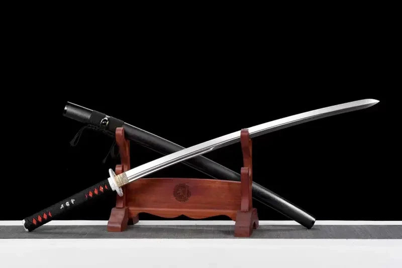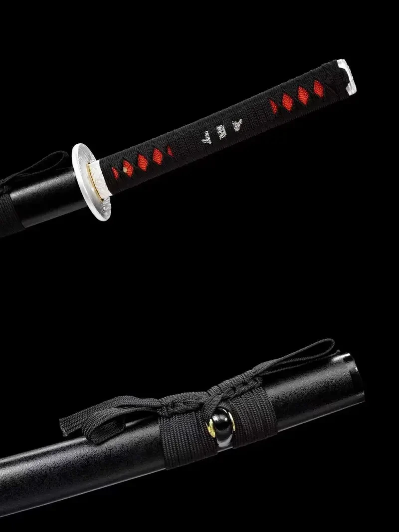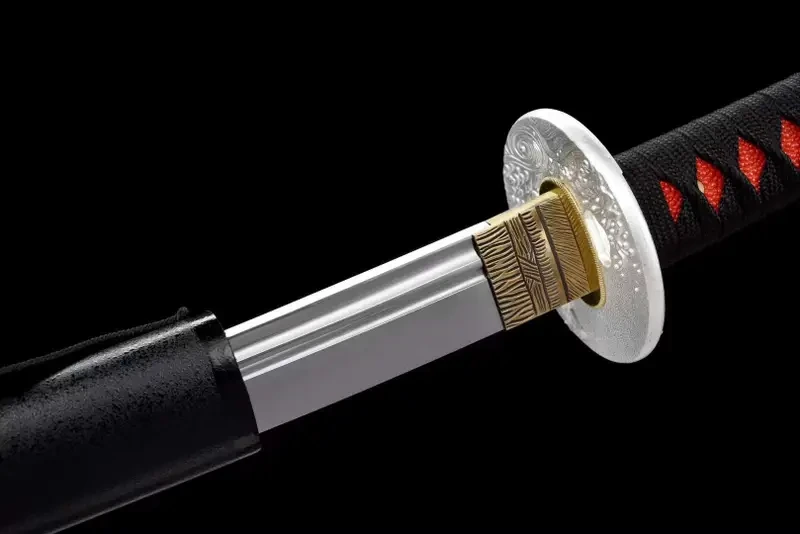 Thanh katana này được chế tác từ thép mangan, nổi bật với thiết kế đặc biệt ở phần mũi hai dầu, mang lại sự sắc bén và uy lực mạnh mẽ hơn trong từng nhát cắt,rèn thủ công tỉ mỉ với sống kiếm chắc khỏe, đảm bảo độ bền vượt trội cùng khả năng chịu lực và đàn hồi tốt. Phần tsuba được chạm khắc hoa văn tinh xảo màu bạc, đi kèm habaki ánh vàng khắc họa tiết sắc nét, tôn lên vẻ sang trọng và uy nghi. Chuôi tsuka quấn dây đen nổi bật với lớp da đỏ bên trong, tạo điểm nhấn mạnh mẽ và cầm nắm chắc tay. Saya(Vỏ) của thanh katana màu đen nhám kết hợp cùng dây buộc gọn gàng, làm nổi bật tính thẩm mỹ và sự tinh tế của toàn bộ thanh katana này. Đây là một thanh katana mang phong cách hiện đại nhưng vẫn giữ được linh hồn truyền thống, thích hợp cho sưu tầm, trưng bày hoặc luyện tập. Với nền thép mangan bền bỉ và thiết kế mũi hai dầu độc đáo.