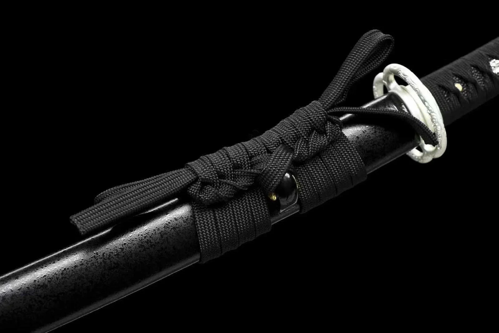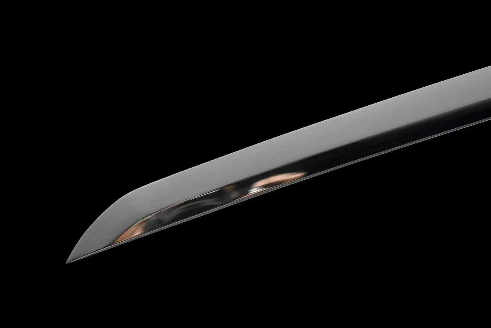 Thanh katana này được chế tác từ thép mangan nổi tiếng với độ dẻo và khả năng chịu va đập tốt, kết hợp cùng bề mặt rèn sáng gương cho độ bóng hoàn hảo, phản chiếu ánh sáng đầy cuốn hút. Phần lưỡi thẳng, đường mài sắc xảo, phần mũi (kissaki) vuốt nhọn gọn gàng. Tsuba(chắn tay) thiết kế tròn cổ điển, tông bạc sáng, khắc họa hoa văn tinh tế, tạo điểm nhấn nổi bật giữa sắc đen huyền bí của toàn thể. Habaki chế tác kim loại vàng đồng khắc họa tiết, ôm khít lưỡi, tăng độ chắc chắn và giá trị thẩm mỹ. Tsuka (chuôi) quấn dây đen đều đặn trên nền samegawa(giả da cá đuối), tạo cảm giác chắc tay và đồng bộ với tổng thể. Saya (vỏ kiếm) sơn đen bóng, kết hợp sageo quấn thủ công sắc đen tinh xảo, mang đến vẻ ngoài trang nhã và huyền bí. Katana thép mangan rèn sáng gương thích hợp cho sưu tầm, trưng bày cao cấp và luyện tập, kết hợp hoàn hảo giữa độ bền, độ dẻo dai và tính thẩm mỹ.