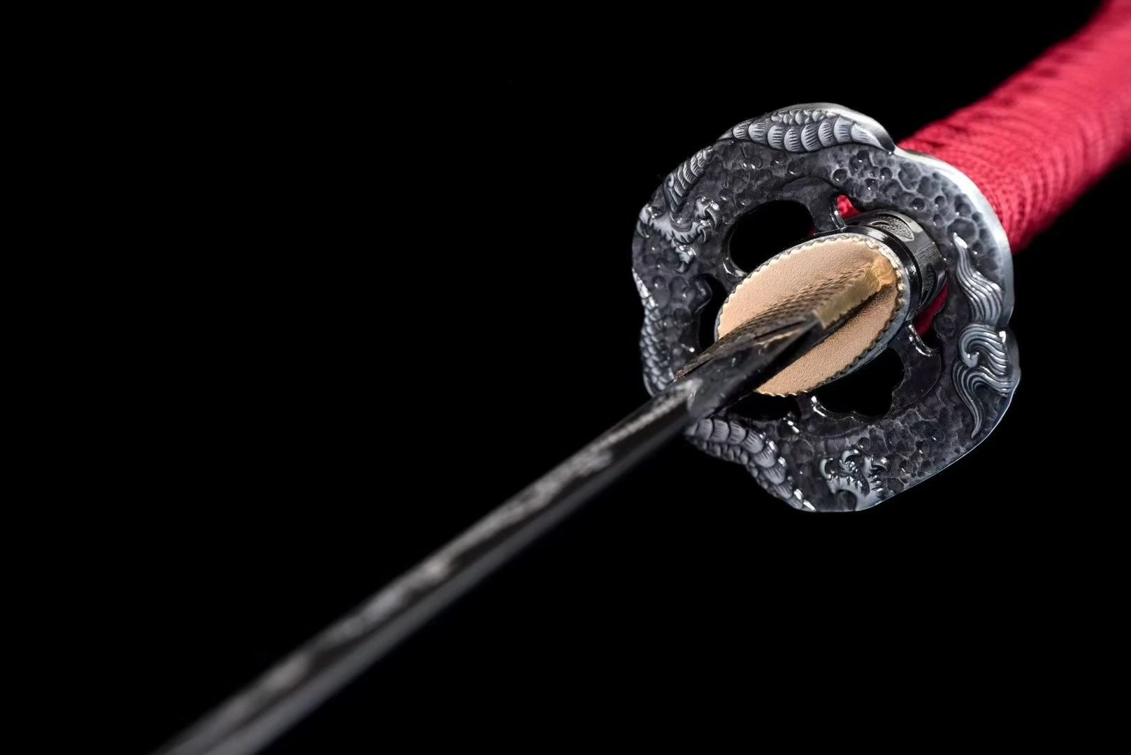 Lưỡi kiếm của thanh katana được rèn từ thép carbon 1060, loại thép có hàm lượng carbon trung bình, mang lại độ cân bằng giữa độ cứng và độ dẻo. Nhờ đặc tính này, lưỡi có khả năng chịu va đập khá tốt, trên thân lưỡi khắc nổi hình rồng uy nghi, tôn thêm khí thế chiến binh. Tsuba(chắn tay) chế tác kim loại đen khắc rồng tinh xảo, vừa bảo vệ tay cầm vừa tạo điểm nhấn uy lực cho thanh katana. Tsuka(chuôi) quấn dây đỏ thủ công nổi bật trên nền samegawa (giả da cá đuối) đen, đi kèm menuki kim loại, mang lại cảm giác cầm chắc chắn và phong thái mạnh mẽ. Saya(Vỏ) sơn mài đỏ bóng, kết hợp sageo đen – đỏ đồng bộ, làm nổi bật toàn bộ khí chất rực lửa của thanh katana. Katana thép carbon 1060 thích hợp cho luyện tập chém cắt mục tiêu nhẹ nhàng, biểu diễn võ đạo, sưu tầm và trưng bày. Với độ bền dẻo ổn định, đây là lựa chọn phổ biến cho những ai mong muốn một thanh kiếm vừa đẹp vừa có tính năng tập luyện.