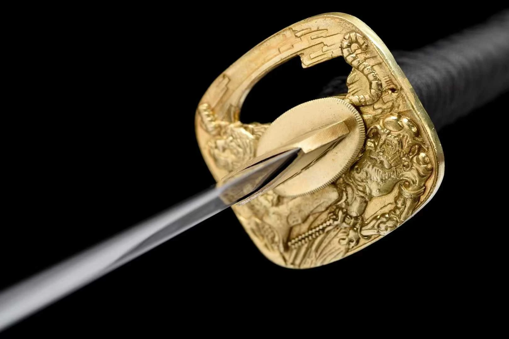 Thanh katana này được rèn từ thép T1095 – loại thép carbon cao chuyên dùng trong các thanh kiếm hiệu suất cao, nổi bật với độ cứng vượt trội và khả năng giữ cạnh lâu dài. Lưỡi kiếm được mài theo kỹ thuật gương tạo hiệu ứng ánh phản chiếu sắc xảo, làm nổi bật đường hamon uốn lượn sống động – đặc trưng của kỹ thuật tôi đất truyền thống. Lưỡi katana có sống lưng dày, cạnh bén sắc lẹm, thích hợp cho cả trưng bày nghệ thuật và luyện tập các bài tập chém & cắt. Đường hamon được tôi tay hoàn toàn, dạng notare (gợn sóng), thể hiện tay nghề cao của nghệ nhân. Tsuba (chắn tay) đúc hợp kim màu vàng với hoạ tiết samurai cổ điển, kết hợp habaki đánh bóng sáng và seppa tinh xảo, tăng thêm phần sang trọng cho thanh kiếm. Tsuka (chuôi) bọc ito đen truyền thống trên nền da cá ngọc trai màu trắng, đan kiểu hineri-maki, bên trong là lõi gỗ chắc chắn. Các chi tiết menuki ánh kim được gắn chìm, tạo điểm nhấn tinh tế. Saya (vỏ kiếm) phủ sơn đen vảy sơn nhiều lớp (kanshitsu urushi) phối vệt đỏ vàng cam, tạo hiệu ứng độc bản như nham thạch rực lửa. Sageo đỏ đen kết nút tay cầu kỳ, tạo tổng thể mạnh mẽ và quyền uy.