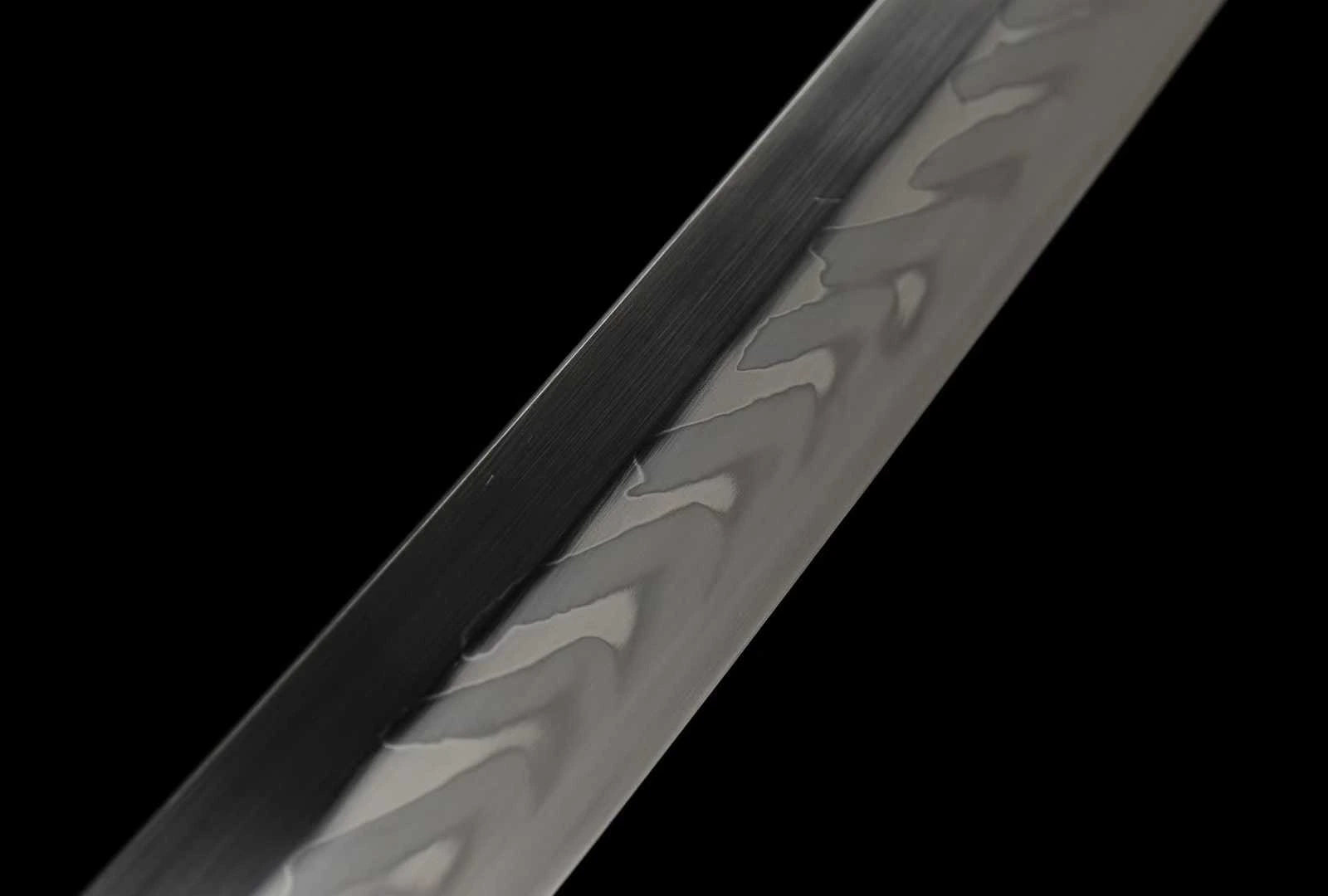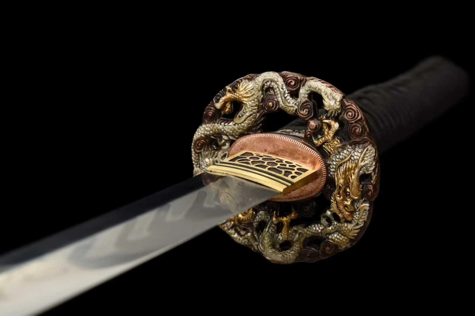 Thanh katana này được rèn từ thép T1095 carbon cao – dòng thép nổi tiếng với khả năng giữ cạnh sắc bén, độ cứng vượt trội và phản ứng rõ nét khi tôi tạo hamon. Bề mặt lưỡi được đánh bóng thủ công, thể hiện đường hamon thật dạng gunome (răng sóng) uốn lượn sắc sảo – kết quả từ quá trình tôi đất thủ công, không chỉ đẹp mà còn giúp phân vùng độ cứng giữa sống và lưỡi, nâng cao độ bền khi cắt. Phần tsuba (chắn tay) đúc bằng hợp kim đồng, chạm khắc long văn nổi 3D cầu kỳ và tinh xảo. Mỗi vảy rồng, móng vuốt, hay ánh mắt đều được tạo hình tỉ mỉ – mang đến không khí thần thoại và phong thủy bảo hộ cho chủ nhân. Seppa và habaki đi kèm cũng là đồng thau cao cấp, chạm khắc họa tiết lưới cá truyền thống, tạo điểm nhấn cổ điển và tăng độ chắc chắn tại giao điểm giữa lưỡi và chuôi. Tsuka (chuôi kiếm) được quấn dây sageo đen kiểu ito maki đều tay, bên dưới là lớp samegawa trắng từ da cá ngọc trai, giúp chống trượt hiệu quả và tạo cảm giác cầm nắm chắc tay. Menuki hình rồng ẩn bên dưới lớp quấn, không chỉ làm đẹp mà còn góp phần nâng cao độ bám và giá trị thẩm mỹ. Đầu chuôi (kashira) và cổ chuôi (fuchi) đều đồng bộ với tsuba, hoàn thiện một tổng thể mạnh mẽ và huyền bí. Từng chi tiết được chế tác không chỉ để trưng bày, mà còn mang khí chất của một thanh chiến kiếm thực thụ khi tập luyện – hội tụ cả vẻ đẹp, chức năng và tinh thần samurai.