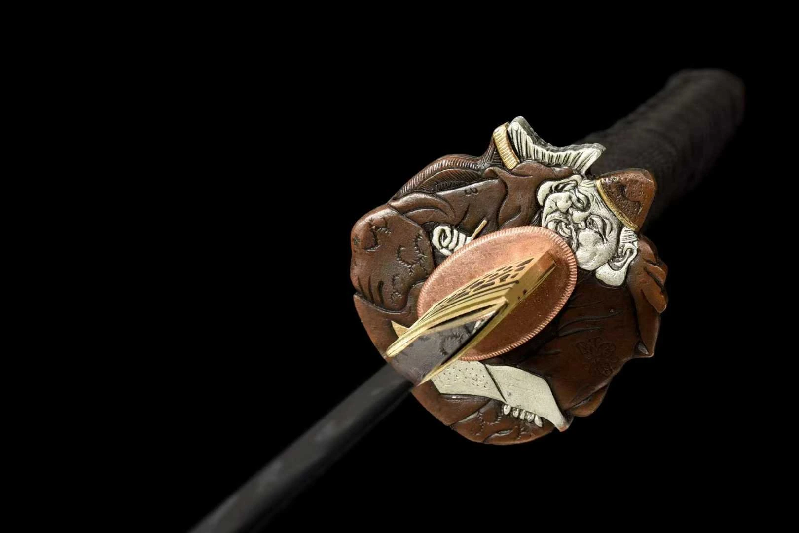 Thanh katana sở hữu lưỡi thép T1095 hàm lượng carbon cao, nổi bật với đường vân mài tay sắc nét, kết hợp cùng hamon uốn lượn tinh tế, thể hiện trình độ rèn thủ công đỉnh cao. Phần kissaki (mũi kiếm) của thanh katana được mài bóng hoàn hảo, cho độ sắc vượt trội. Tsuba chế tác nổi hình nhân vật truyền thống Nhật Bản, phối hợp chất liệu đồng, bạc và đồng đỏ, vừa là điểm nhấn thẩm mỹ vừa bảo vệ tay người sử dụng. Habaki đồng khắc họa tiết độc bản, ôm khít sống lưỡi, đảm bảo kết cấu chắc chắn. Tsuka bọc da cá đuối trắng, quấn ito đen truyền thống, đính menuki đồng chạm thủ công, tạo cảm giác cầm đầm và chắc tay. Saya sơn mài xanh lam ánh kim rắc vảy vàng, nổi bật với sageo đen đan chỉ xanh, kết hợp koiguchi và kojiri ốp sừng, mang lại vẻ sang trọng và bền bỉ. Phù hợp để trưng bày, sưu tầm cao cấp hoặc luyện tập và iaido ở mức độ chuyên nghiệp.