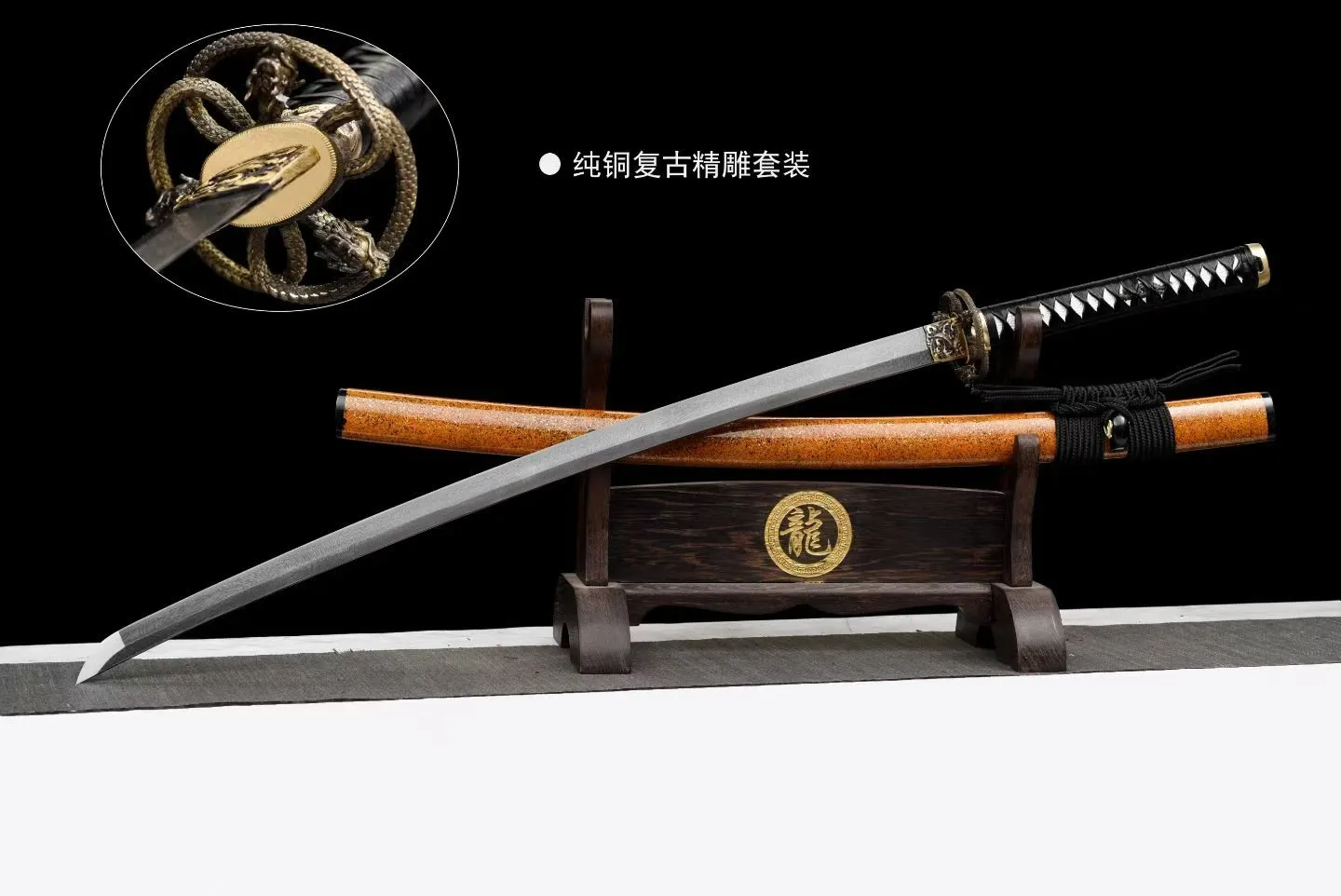 Bộ trang bị đồng nguyên khối chạm khắc cổ điển, hoàn thiện tinh xảo, kết hợp tay cầm dài 26cm quấn dây truyền thống giúp tăng độ bám. Bao kiếm làm từ gỗ cứng sơn mài, đi kèm dây treo kiếm bản lớn, tổng thể vừa mang giá trị sưu tầm vừa phù hợp trưng bày.