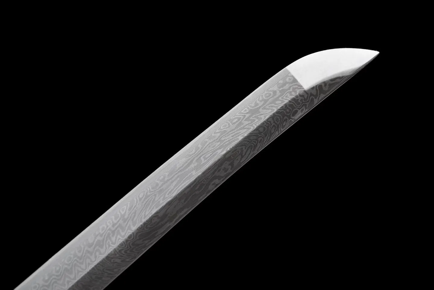 Thanh katana được rèn từ thép gấp Bách Luyện (thép hoa văn Damascus), lưỡi kiếm xuất hiện vân thép dạng “dấu vân tay” đặc trưng, độ cứng cao và bề mặt hoàn thiện sắc nét. Lưỡi dài 70cm, bản lưỡi 3.2cm, độ dày 0.75cm, tạo kết cấu chắc chắn và cân bằng khi cầm.