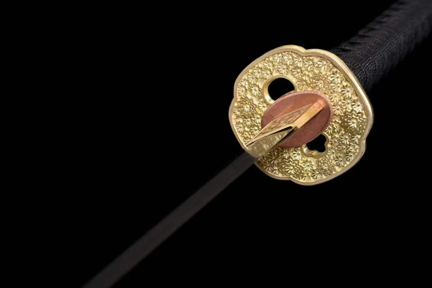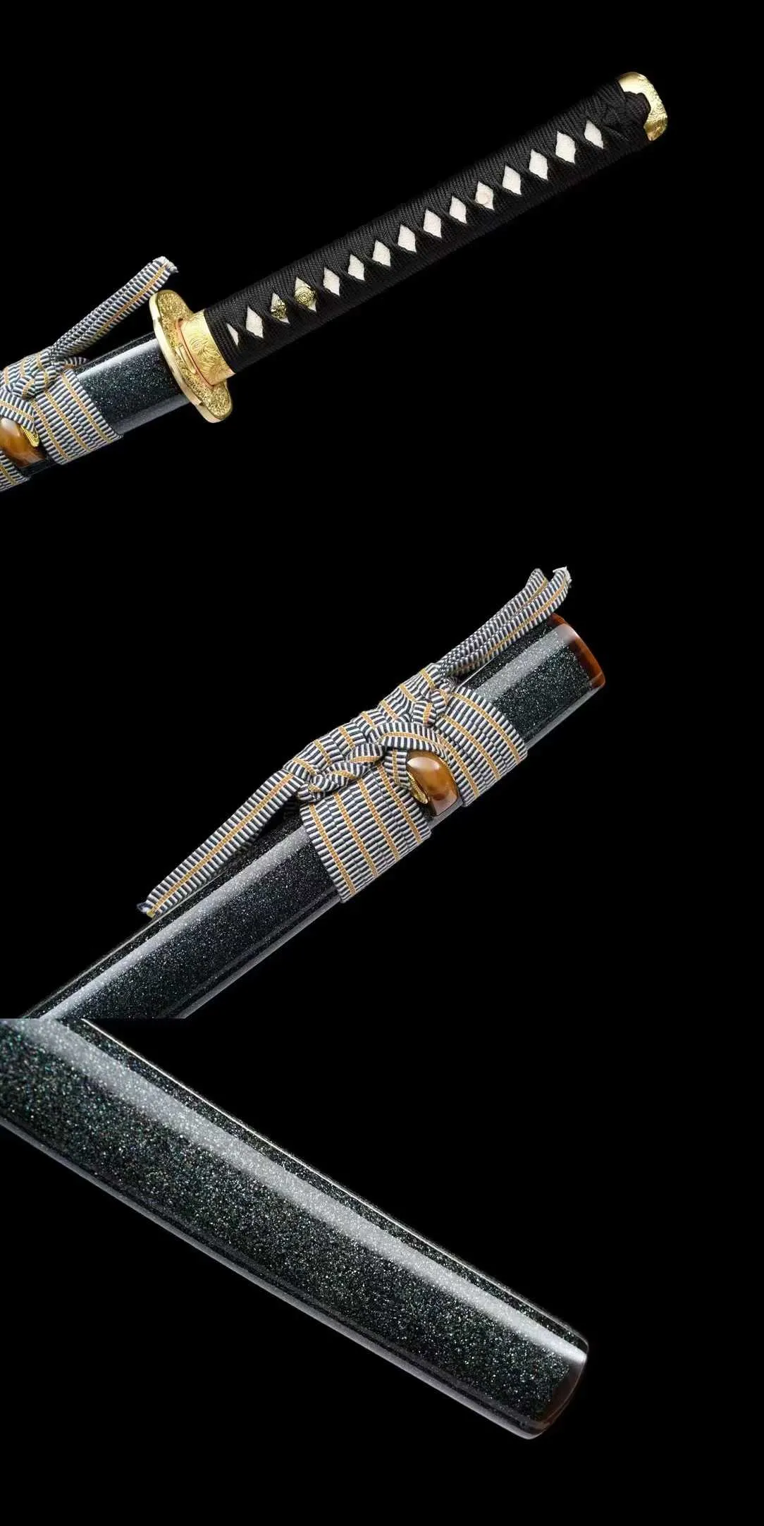 Bao kiếm: Gỗ cứng sơn mài | Tay cầm : gỗ nguyên khối lót da cá ngọc trai | Habaki/Tsuba : Đồng thau mạ vàng
