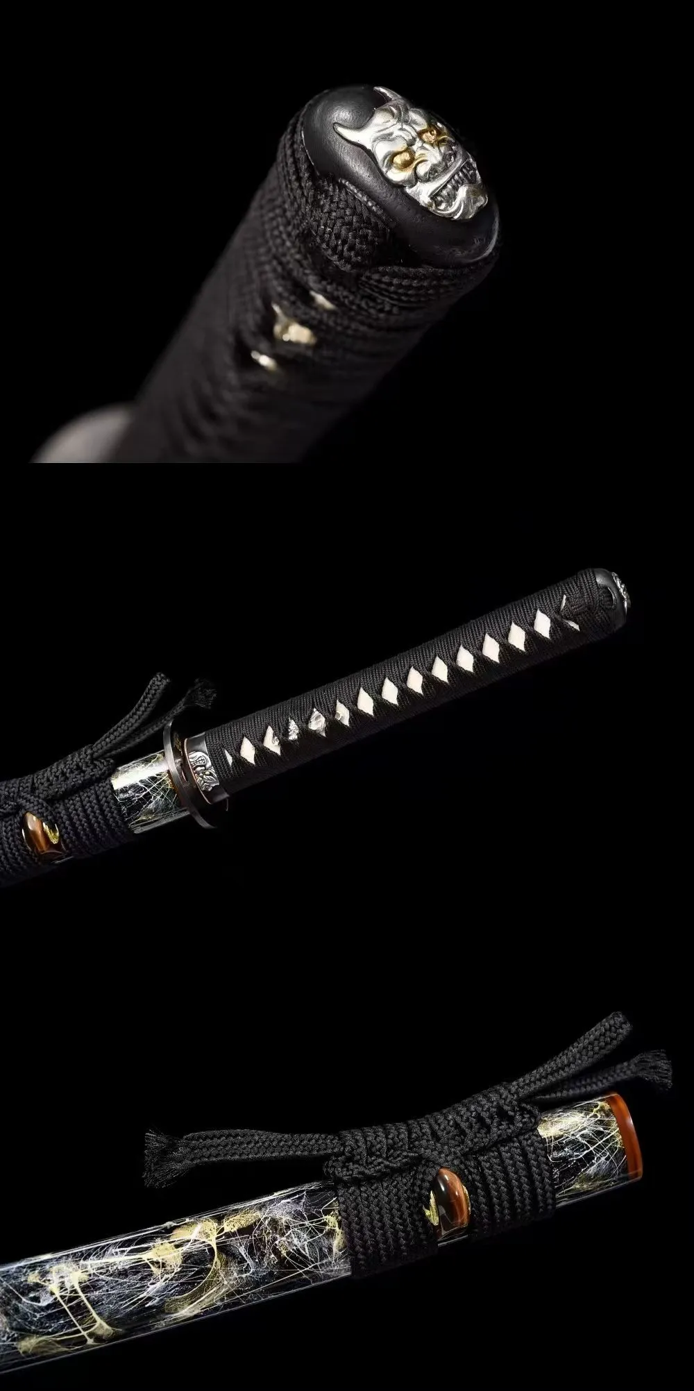 Bao kiếm: Gỗ cứng sơn mài cao cấp khảm 3 mảnh sừng trâu | Tay cầm : fulltang, ốp gỗ, lót da cá | Habaki/Tsuba : Đồng thau mạ vàng bạc