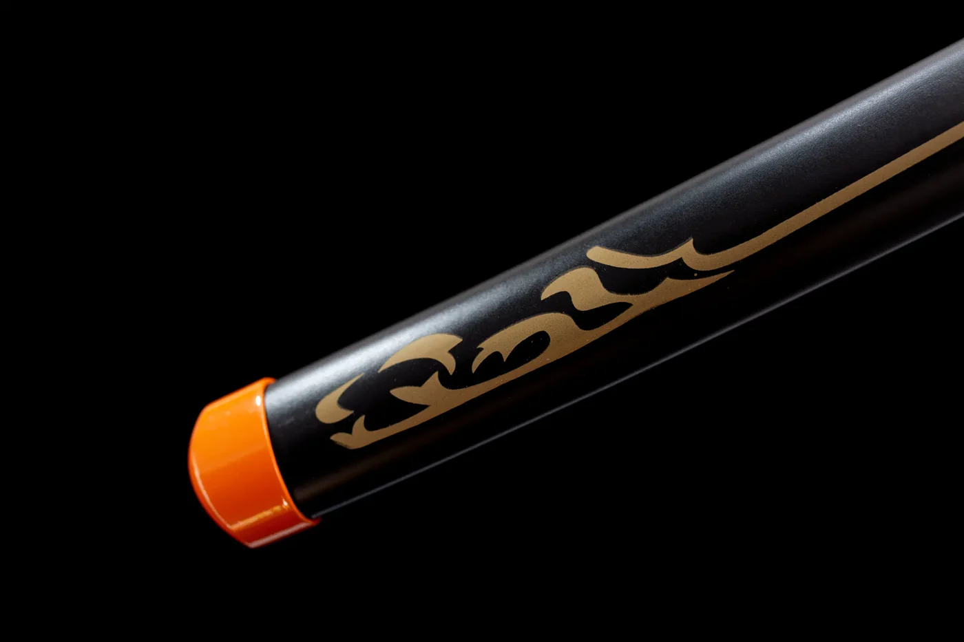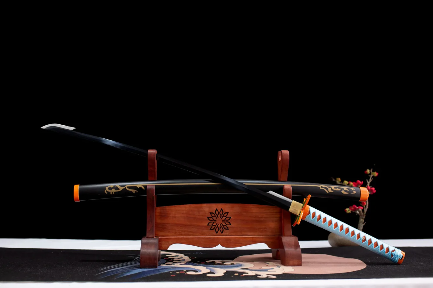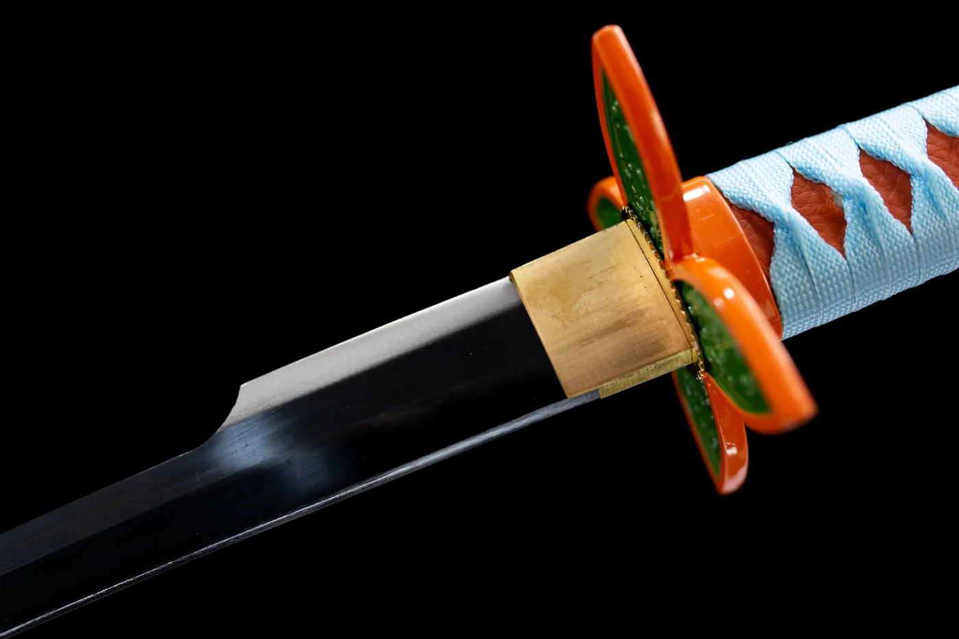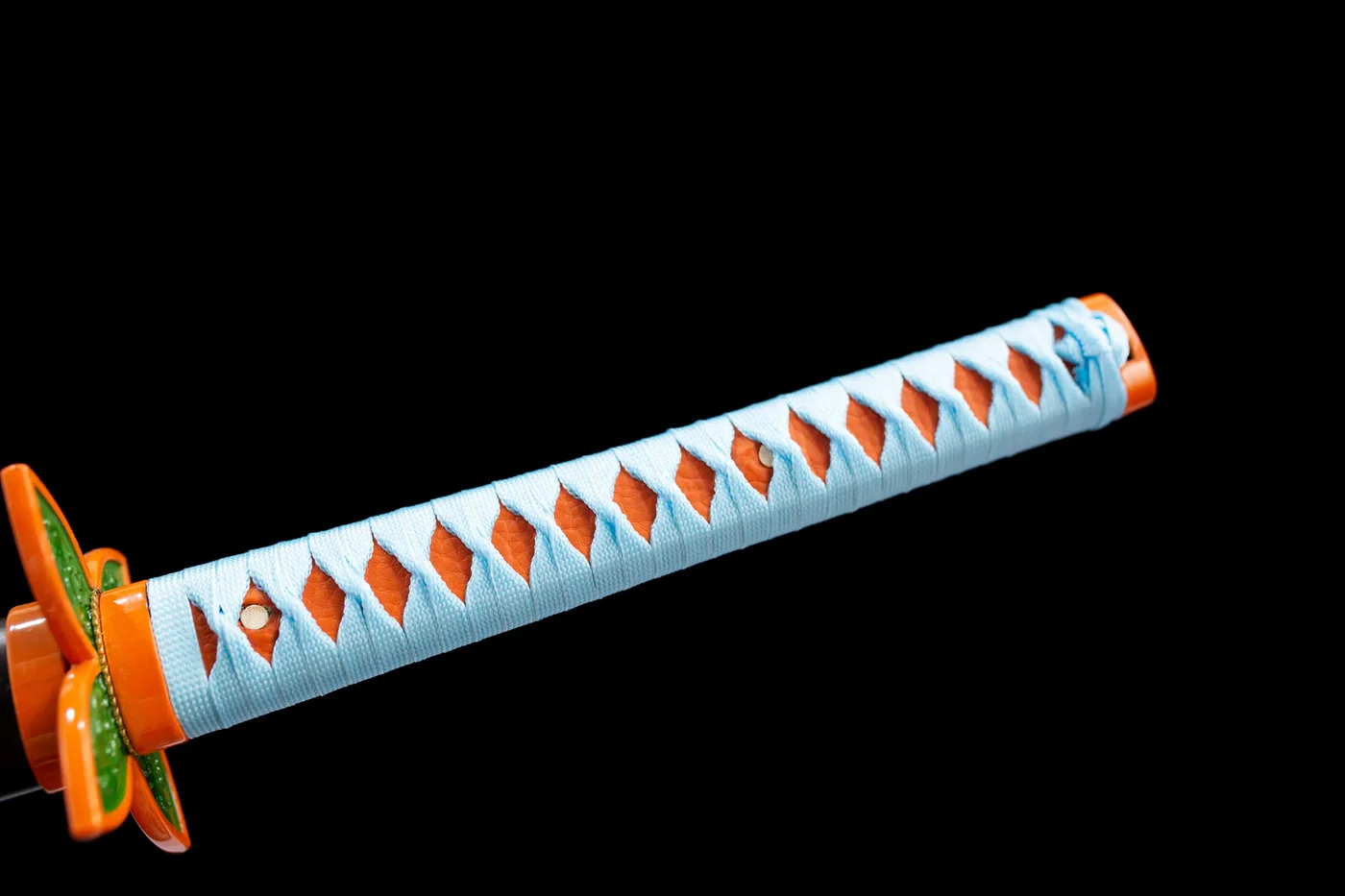 Thanh Kochou Shinobu Katana được chế tác với thiết kế lấy cảm hứng từ nhân vật Kochou Shinobu trong bộ truyện nổi tiếng Kimetsu no Yaiba (Demon Slayer). Đây là mẫu kiếm mang vẻ đẹp thanh thoát và đầy màu sắc, tái hiện đúng phong cách và khí chất của nữ kiếm sĩ Trụ Côn Trùng. Lưỡi katana được rèn từ thép carbon 1060, lưỡi kiếm thon gọn, đầu mũi nhọn sắc sảo. Bề mặt phủ màu đen bóng mang lại vẻ huyền bí, kết hợp phần sống lưỡi bạc nổi bật tạo nên độ tương phản bắt mắt. Thép 1060 có hàm lượng carbon vừa phải nhưng vẫn đảm bảo được độ cứng tốt, thích hợp cho trưng bày và tập luyện nhẹ. Tsuba (chắn tay) thiết kế hình bốn cánh hoa cách điệu – chi tiết biểu tượng đặc trưng của Kochou Shinobu. Tông màu cam viền ngoài nổi bật kết hợp phần xanh lá ở giữa, tạo cảm giác mềm mại nhưng vẫn đầy sức sống. Tsuka(chuôi kiếm) quấn dây xanh nhạt tươi sáng, đan chéo lộ lớp samegawa giả màu cam bên dưới, tạo sự hài hòa về màu sắc. Thiết kế vừa vặn tay cầm, giúp tăng độ bám và tính thẩm mỹ. Saya(vỏ katana) màu đen phủ bóng, được tô điểm họa tiết vàng chạy dọc, đồng bộ với màu sắc tổng thể. Đầu và miệng vỏ viền cam cùng màu tsuba, liền mạch và sang trọng. Habaki (đai nối) làm bằng hợp kim sáng màu, vừa chắc chắn vừa tạo điểm nhấn. Kochou Shinobu Katana là sản phẩm sưu tầm lý tưởng cho người yêu thích Demon Slayer, phù hợp để trưng bày, tập luyện nhẹ nhàng hoặc làm đạo cụ cosplay, nhiếp ảnh. Kiếm không chỉ mang giá trị thẩm mỹ cao mà còn truyền tải tinh thần thanh thoát nhưng mạnh mẽ của Trụ Côn Trùng Kochou Shinobu.