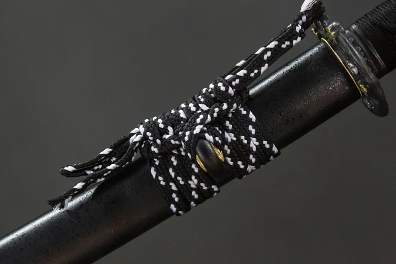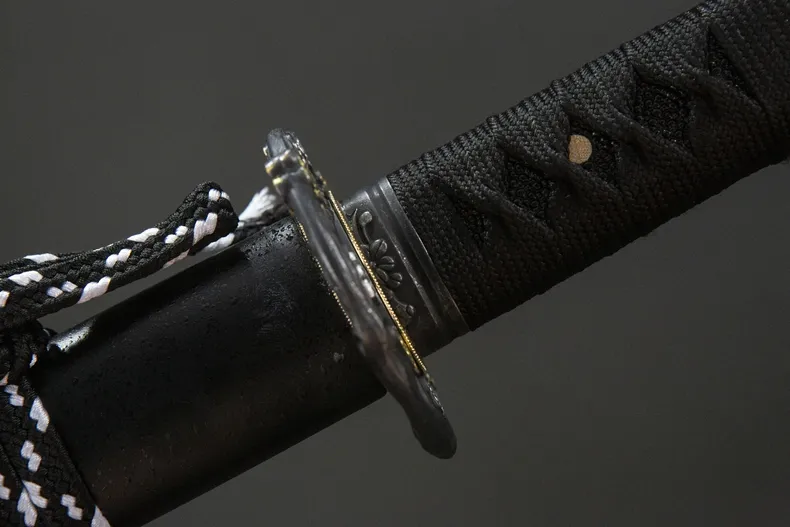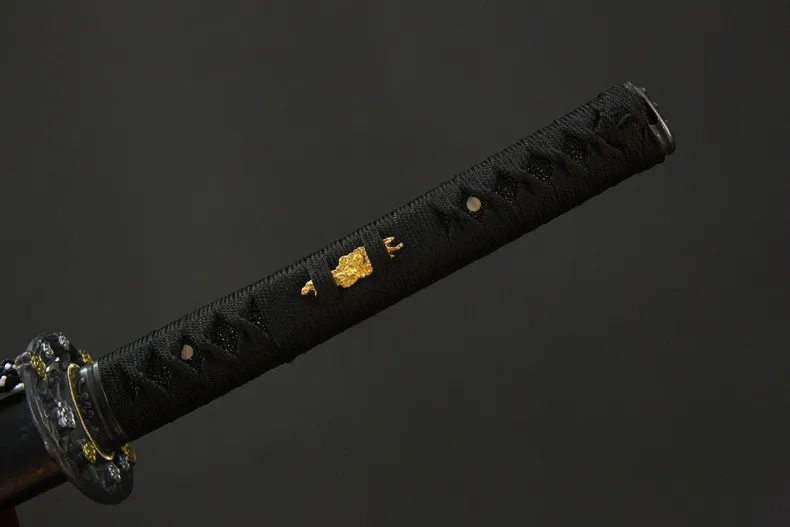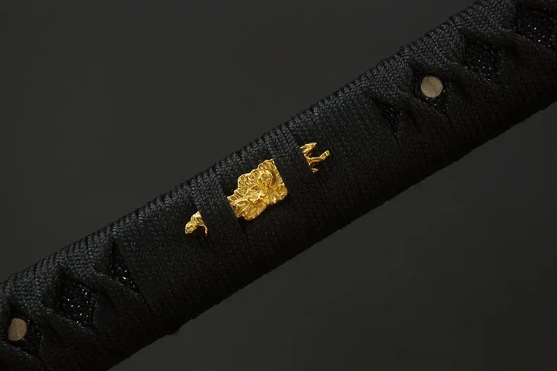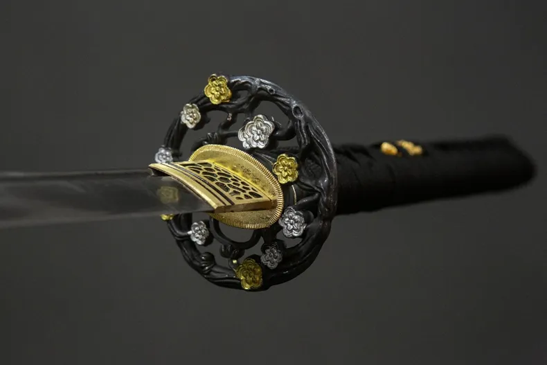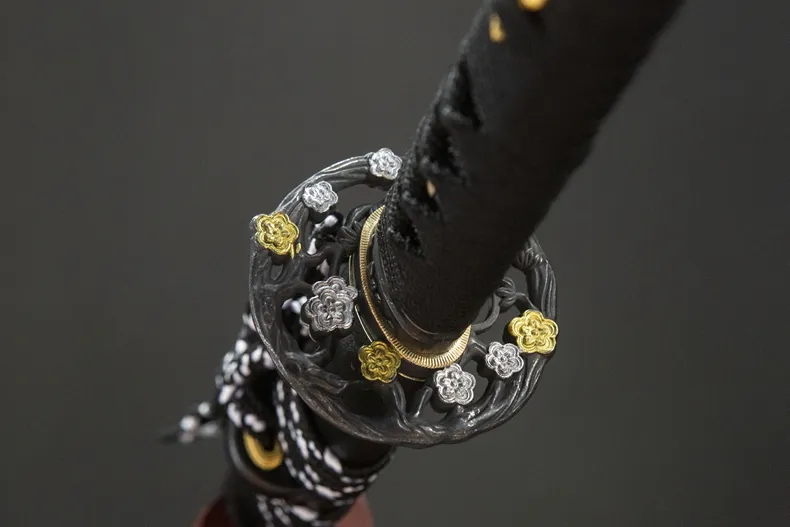Phần habaki và tsuba bằng đồng thau được hoàn thiện chắc chắn, tông màu vàng trầm tạo điểm nhấn vừa đủ trên nền đen chủ đạo của thanh kiếm. Tay cầm làm từ gỗ nguyên, quấn dây truyền thống, cho cảm giác cầm đầm tay, độ bám tốt và thao tác ổn định. Kokuen Ume Katana phù hợp cho trưng bày không gian cổ điển, sưu tầm cá nhân, luyện tập nhẹ và làm quà tặng dành cho người yêu katana phong cách trầm, gọn gàng và có chiều sâu.