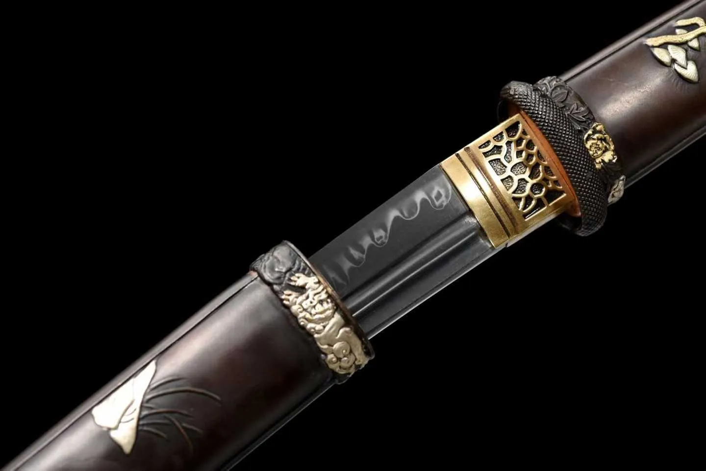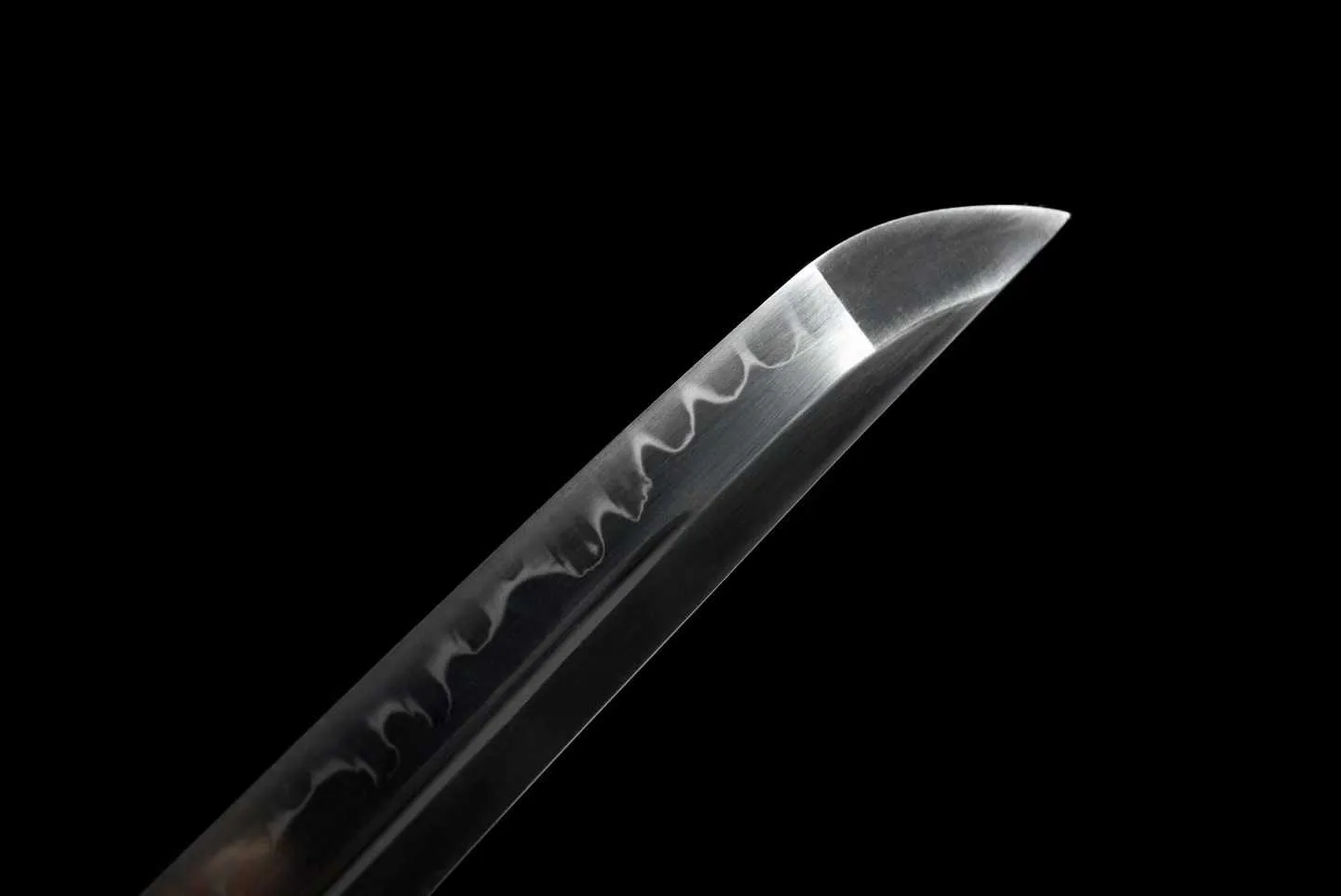 Kuronami Tantō là mẫu đoản kiếm mang phong thái trầm tối và sắc lạnh, lấy cảm hứng từ “sóng đen” – hình ảnh tượng trưng cho sự lặng lẽ nhưng đầy sức mạnh của các shinobi. Lưỡi kiếm được rèn từ thép T10 cao cấp, trải qua quá trình tôi đất nung để tạo ra đường hamon nổi rõ, tự nhiên và có chiều sâu. Bản lưỡi ngắn, gọn, độ cứng cao, phù hợp cho trưng bày cao cấp hoặc sưu tầm theo phong cách võ đạo cổ truyền.
