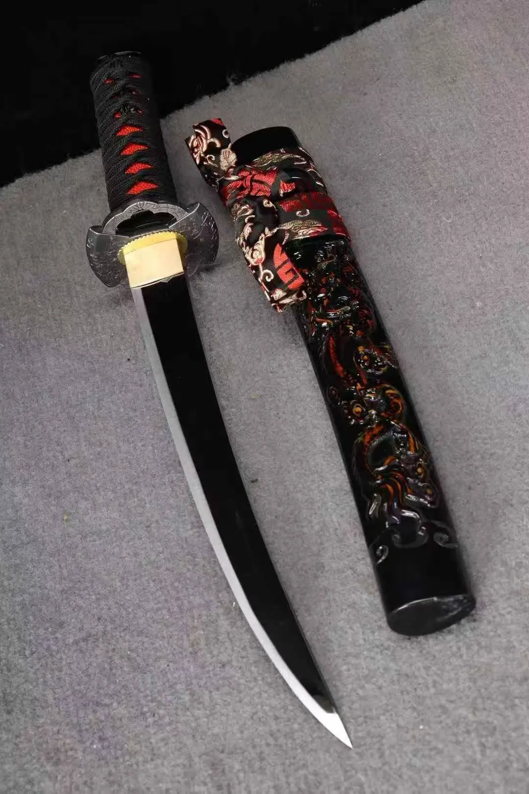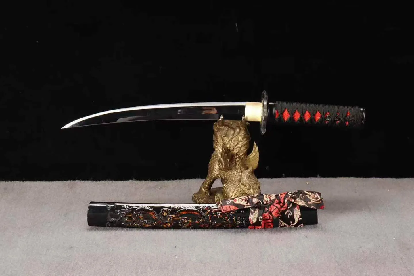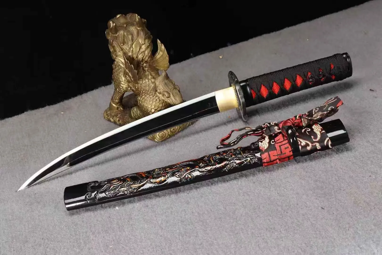 Phần hoàn thiện của tanto gồm bộ trang cụ thủ công, tay cầm quấn chắc, bao kiếm chạm khắc long văn nổi bật, đi kèm hộp gấm cao cấp. Tổng thể tanto hướng đến trưng bày, luyện tập và sưu tầm với mức hoàn thiện ổn định.