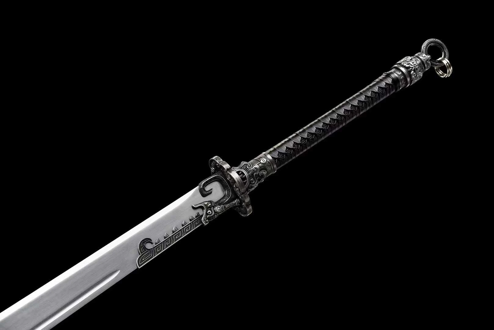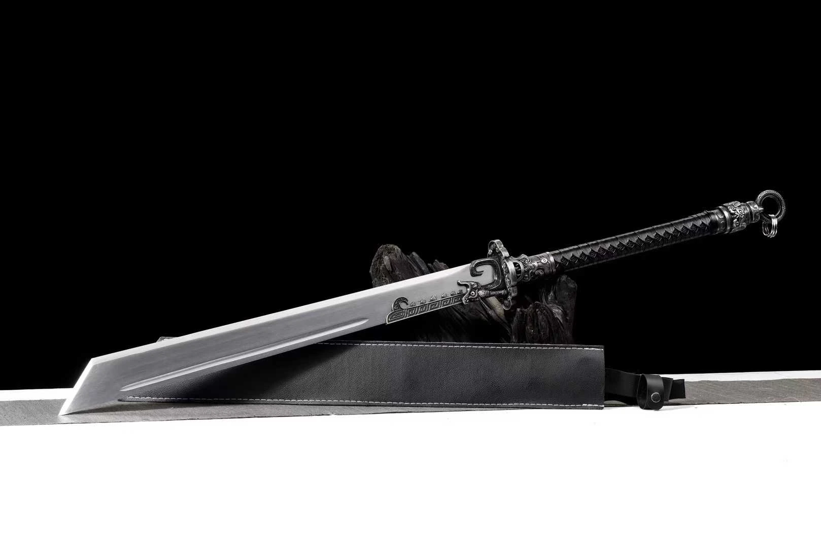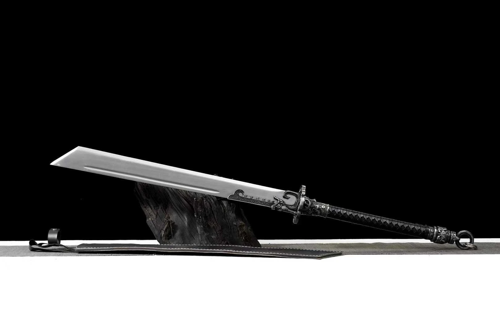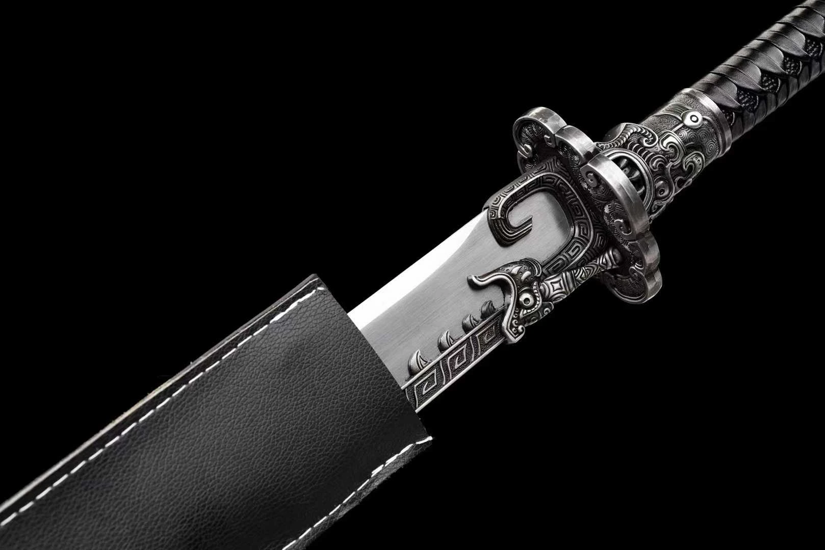 Mang linh hồn của thời đại chiến chinh, thanh Hán đao này được chế tác từ thép Mangan phù hợp cho cả trưng bày, biểu diễn văn nghệ. Lưỡi đao phẳng, bản rộng, thiết kế mũi chéo vát nhọn mạnh mẽ. Trên thân lưỡi có rãnh máu (bo-hi) kéo dài, giúp giảm trọng lượng và tăng tính khí động học. Họa tiết rồng cổ phong chạm khắc sắc sảo trên thân lưỡi mang đậm dấu ấn văn hóa Trung Hoa cổ đại. Chuôi đao bọc họa tiết vảy rồng nổi, cầm chắc tay. Đầu chuôi đúc kim loại với hình đầu thú trang trí công phu, mang phong cách chiến binh dũng mãnh. Phía đuôi có khoen tròn kim loại kèm vòng trang trí – có thể đeo dây đeo hoặc móc trưng bày. Phần chắn tay đúc từ hợp kim kẽm, tạo hình đám mây cuộn tròn, điêu khắc chi tiết với hoa văn xoáy đặc trưng của nghệ thuật Hán. Vừa có tác dụng bảo vệ tay, vừa tăng tính thẩm mỹ. Vỏ đao làm từ da nhân tạo màu đen nhám, viền chỉ trắng nổi bật. Kèm dây đeo vai tiện lợi nếu muốn mang theo như kiếm hành quân.