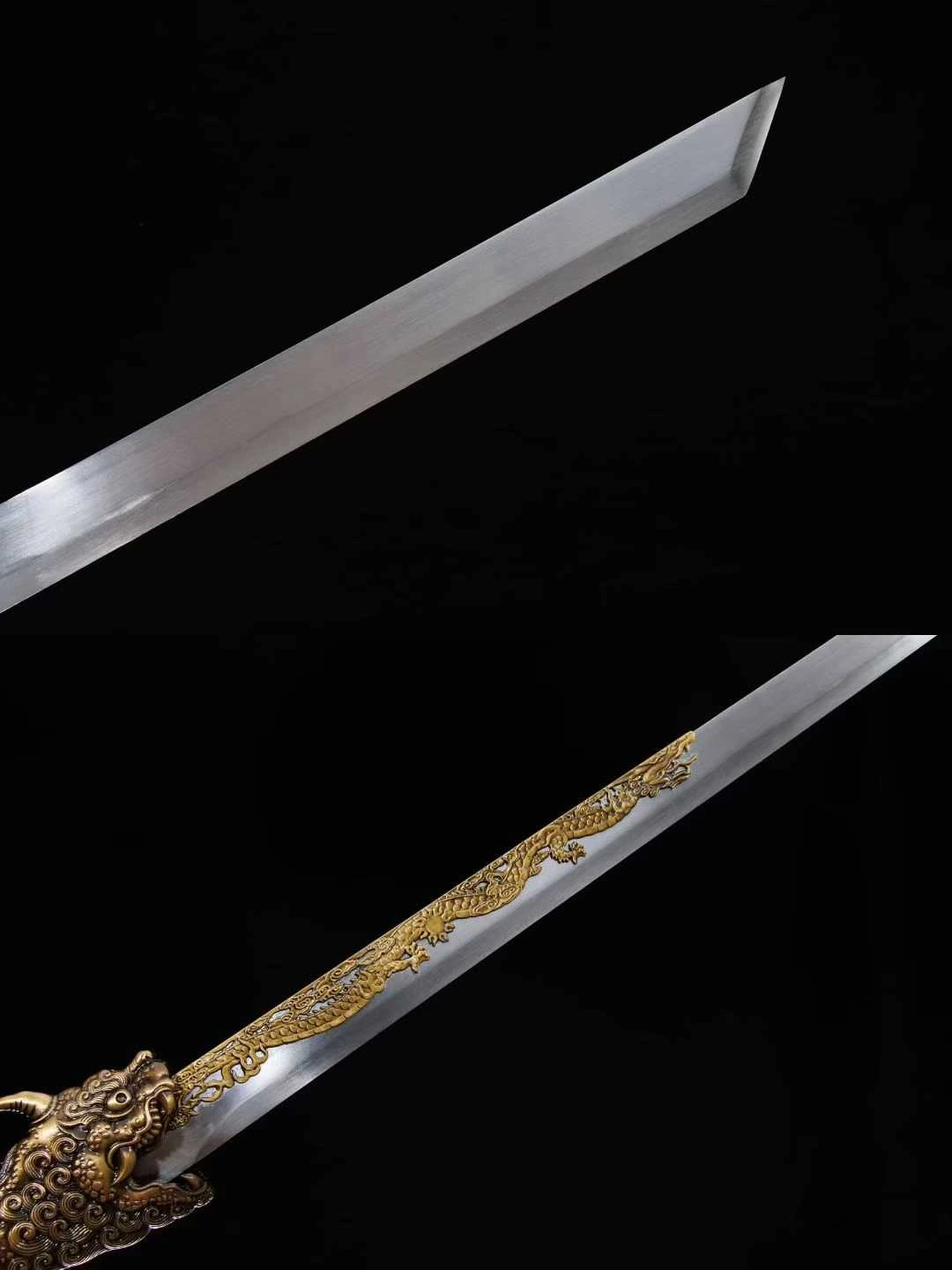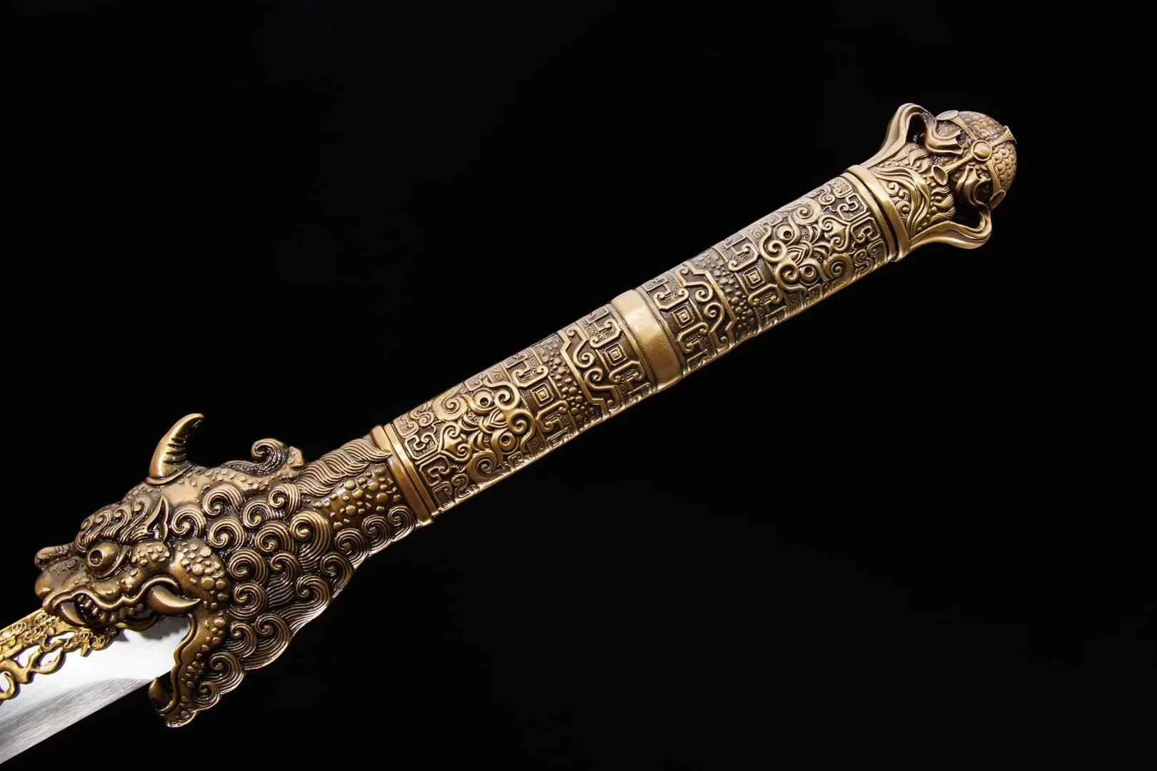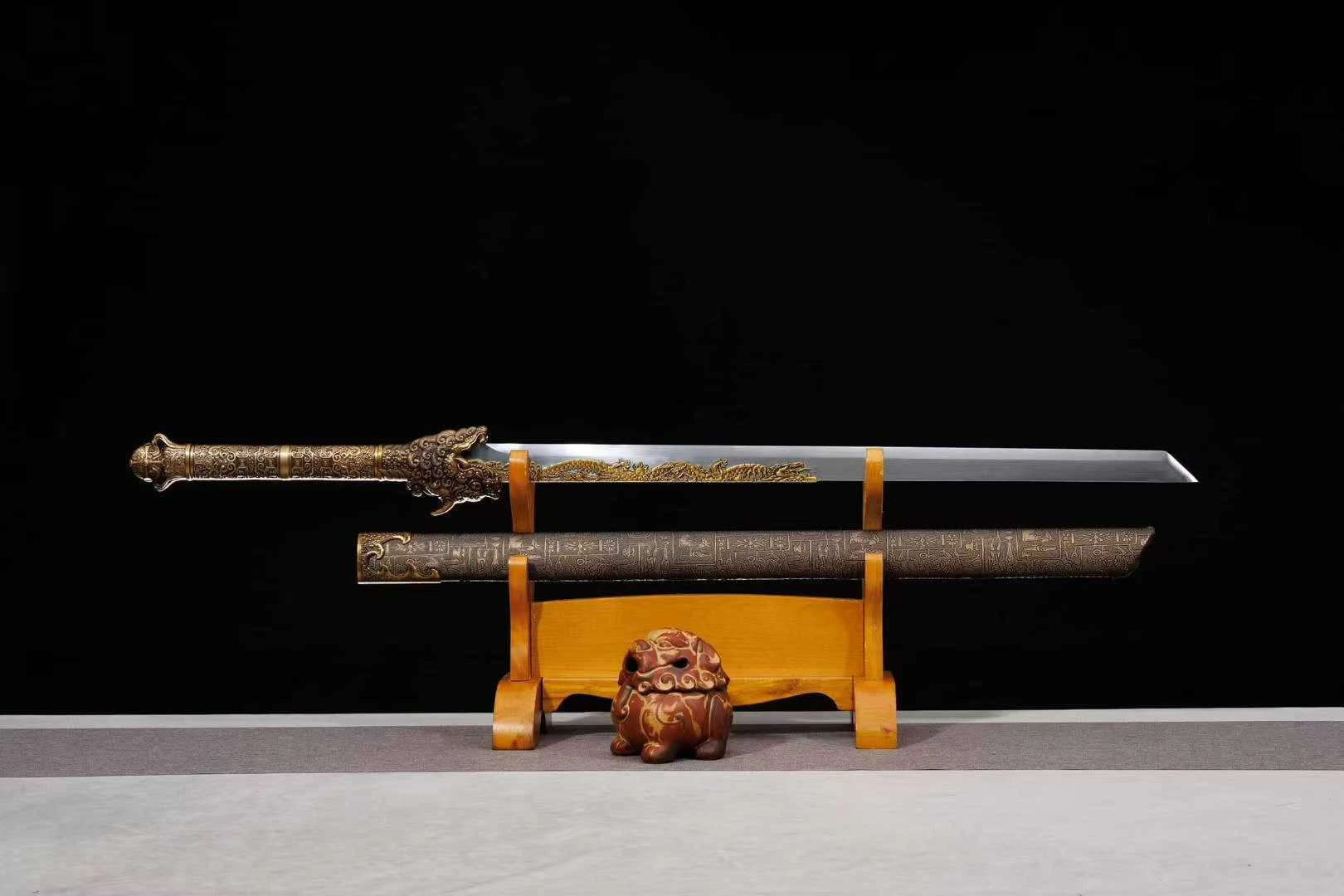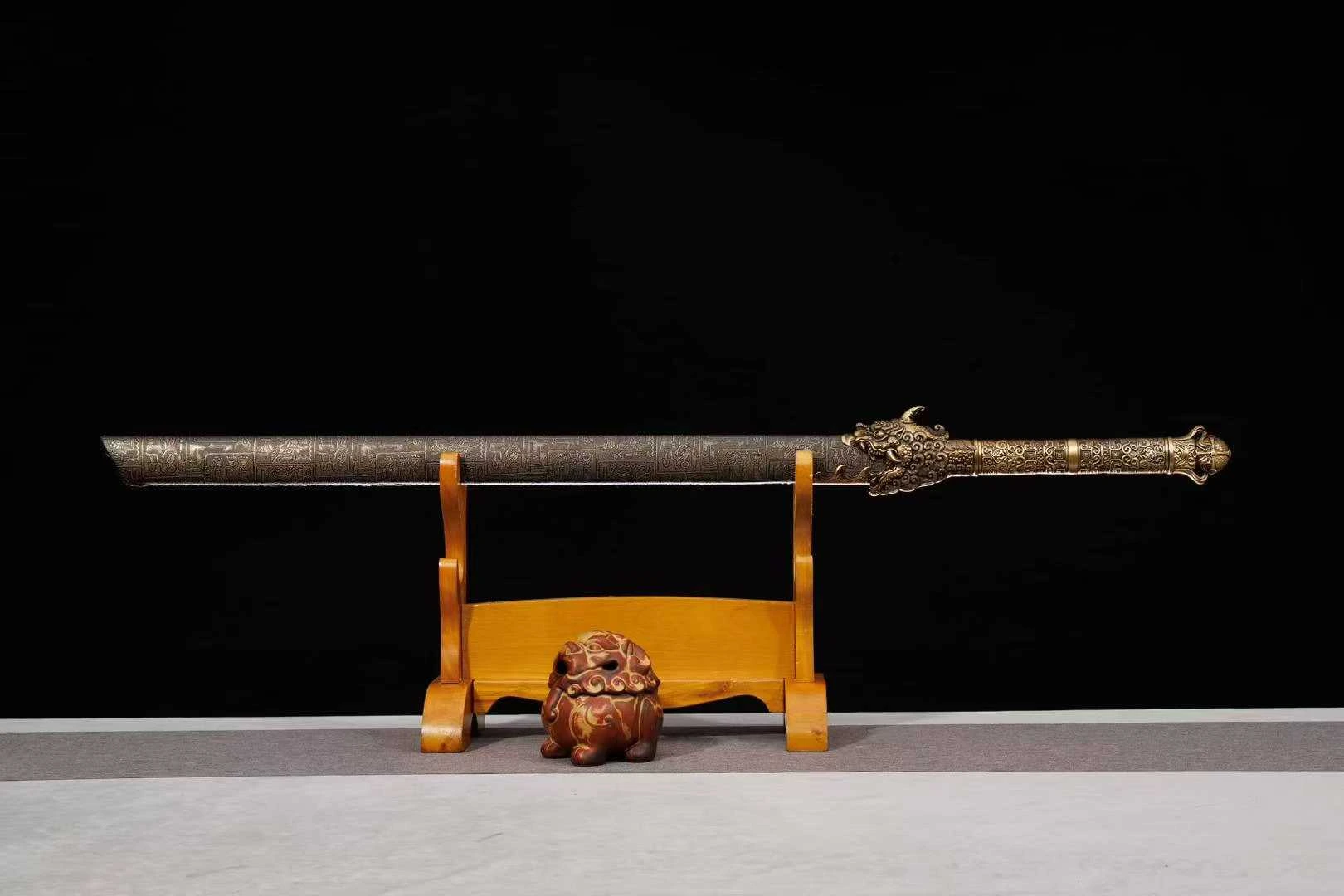 Đây là một thanh đao Hán mang đậm dấu ấn cổ đại, được chế tác từ thép mangan lưỡi đao được tôi luyện thẳng, bản rộng, cạnh sắc xảo, mũi đao vuông tạo hình thức oai phong, dứt khoát – đậm chất binh khí chiến trường. Trên sống lưỡi nổi bật với họa tiết rồng vàng tinh xảo, được đúc nổi chìm thủ công – biểu trưng cho quyền lực, sự linh thiêng và khí chất vương giả. Dải rồng ăn khớp liền mạch từ chuôi ra thân đao, tạo thành một dòng chảy liên tục vừa trang trí vừa tăng thêm độ vững cho kết cấu lưỡi. Tsuka (chuôi đao) được đúc toàn bộ bằng hợp kim đồng giả cổ, điêu khắc hình linh thú đầu rồng dũng mãnh, lông xoắn, sừng nhọn, miệng há rộng ngậm lấy lưỡi đao như đang phun khí thiêng. Cán đao cầm chắc tay, bề mặt phủ họa tiết hoa văn cổ đại dạng hình học, gợi nhớ đến văn hóa Thương Chu thời kỳ sơ khai. Vỏ đao (saya) làm bằng gỗ cứng, được khắc chìm chi chít các ký tự tượng hình và hình ảnh sinh hoạt dân gian, chiến binh, thần thú, mang phong cách nghệ thuật Trung Hoa thời kỳ tiền Tần. Các đầu chụp miệng vỏ và đuôi vỏ đều được đúc rồng nổi, tương xứng với linh thú trên chuôi đao, tạo nên bố cục tổng thể hài hòa. Tổng thể thanh đao phù hợp để trưng bày, sưu tầm hoặc làm đạo cụ cho các bộ ảnh, video, cosplay võ hiệp.