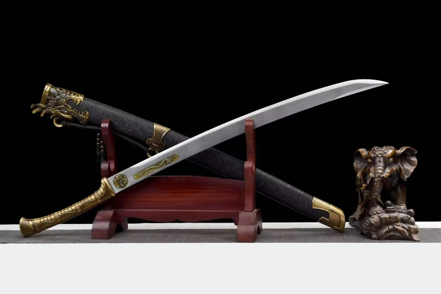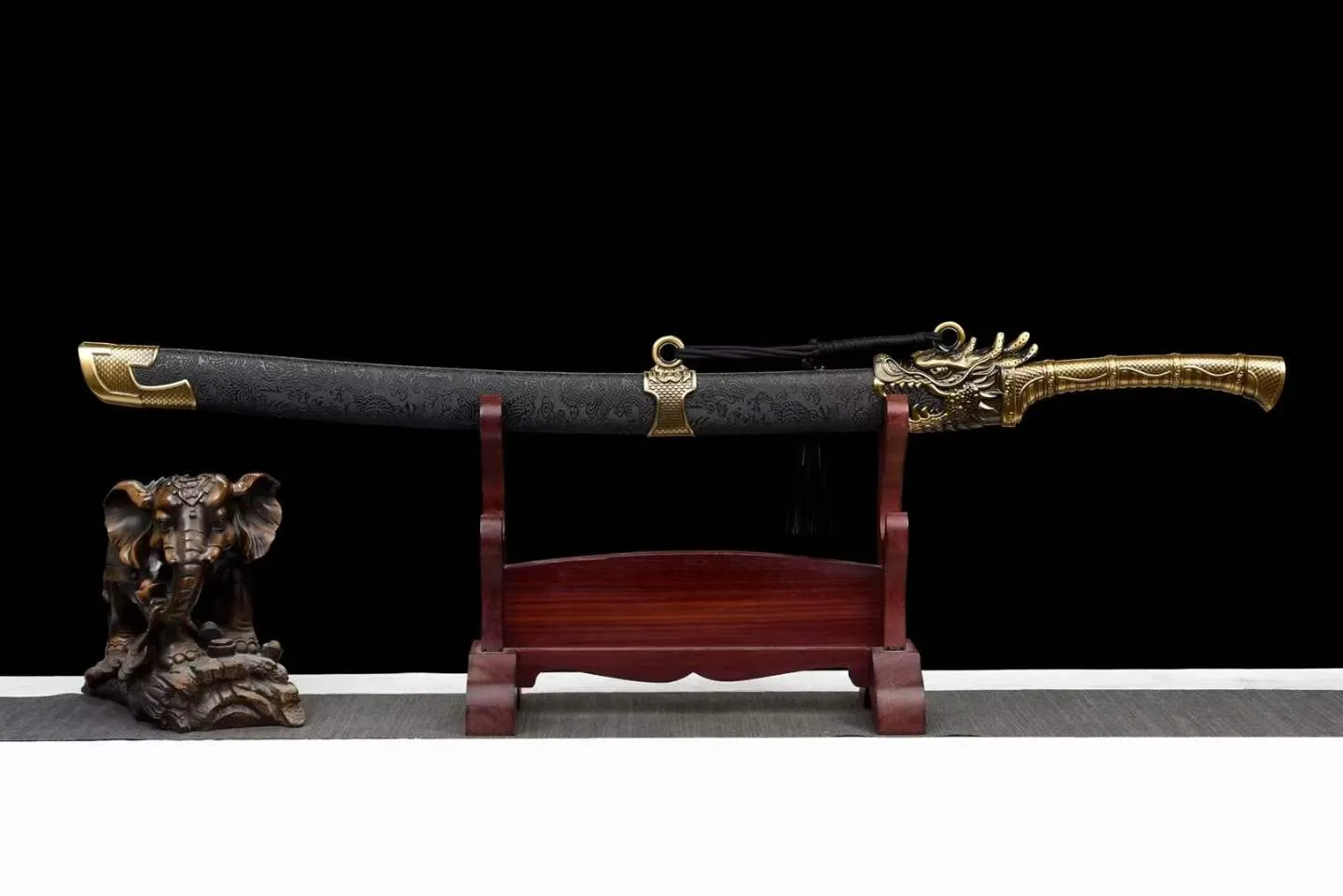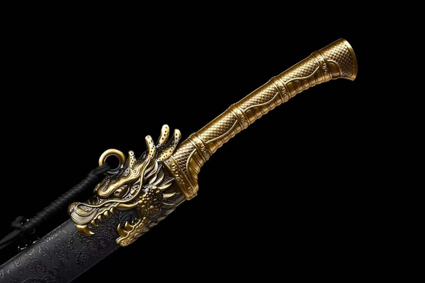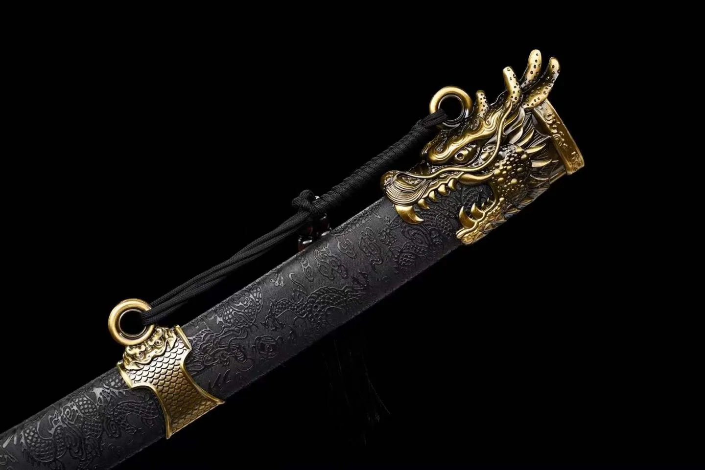 Thanh Long Uy Đao được chế tác với lưỡi đao thép mangan bền chắc, nổi bật nhờ khả năng chịu va đập tốt và độ đàn hồi ổn định. Lưỡi đao có độ cong nhẹ, được mài sáng đều, mang lại cảm giác mạnh mẽ nhưng tinh tế. Phần chuôi và phụ kiện đều làm từ hợp kim đúc, phủ màu vàng đồng, khắc họa đầu rồng nổi chi tiết, tạo nên vẻ uy nghi đặc trưng. Vỏ đao phủ lớp sơn đen khắc chìm hình long văn, kết hợp cùng các vòng đai đồng trang trí tạo tổng thể hài hòa giữa sức mạnh và sự trang trọng. Long Uy Đao không chỉ thể hiện tinh thần võ đạo và nét thủ công tỉ mỉ, mà còn là món sưu tầm có giá trị thẩm mỹ cao, phù hợp cho người yêu thích văn hóa cổ truyền và khí chất chiến binh phương Đông.