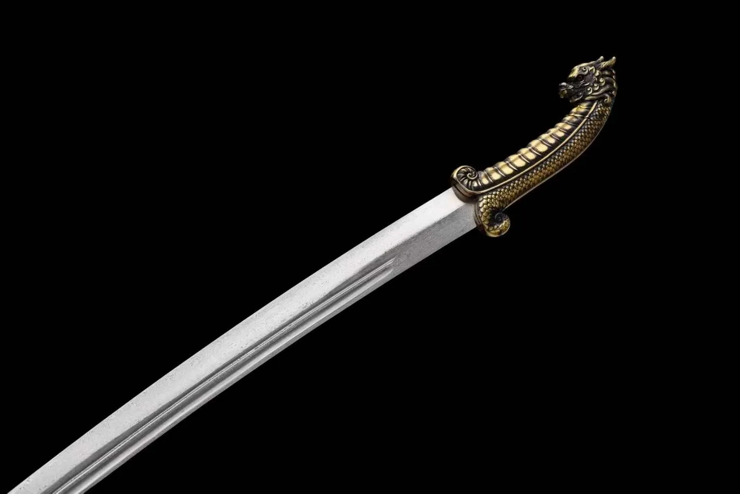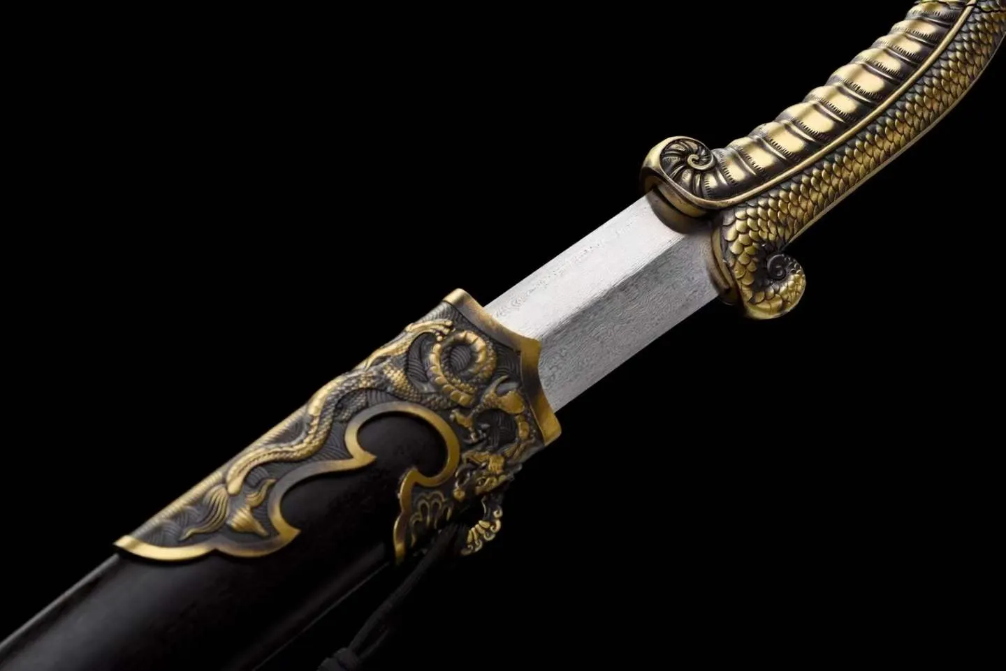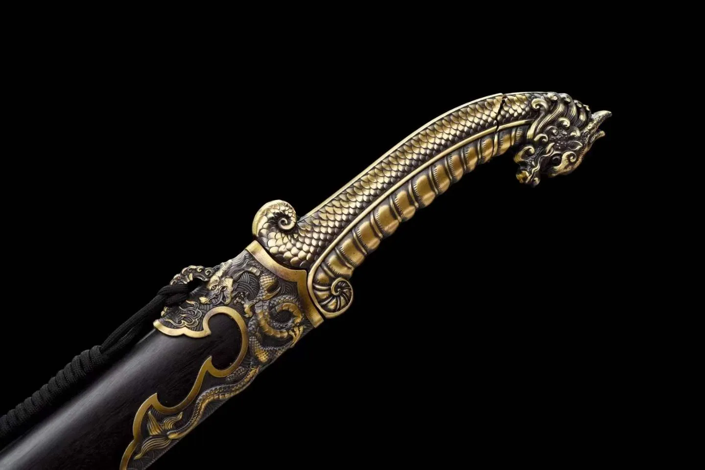 Chuôi đao làm từ đồng thau đúc liền khối, chạm nổi họa tiết vảy rồng và đầu rồng ở chuôi, tạo điểm nhấn mạnh mẽ. Bộ tsuba và habaki đồng thau đồng bộ, giúp tổng thể trở nên thống nhất và chắc chắn khi lắp ráp.