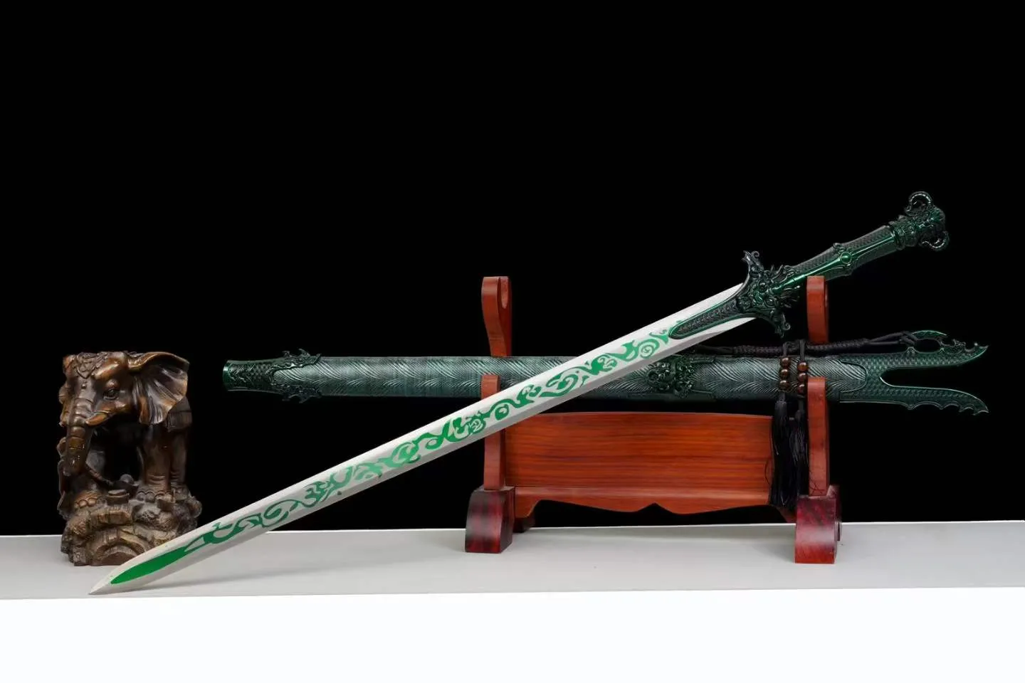 Lục Vũ Huyền Kiếm là mẫu kiếm mang đậm tinh thần cổ phong, nổi bật với tông xanh ngọc chạy xuyên suốt từ lưỡi kiếm đến tay cầm và vỏ kiếm. Lưỡi kiếm được rèn từ thép hợp kim, độ sáng ổn định, thân lưỡi thẳng và hoa văn xanh tạo cảm giác mạnh mẽ nhưng vẫn dễ nhìn. Bản lưỡi vừa phải, đường bo sắc gọn giúp thanh kiếm phù hợp cho mục đích trưng bày hoặc làm điểm nhấn trong bộ sưu tập.