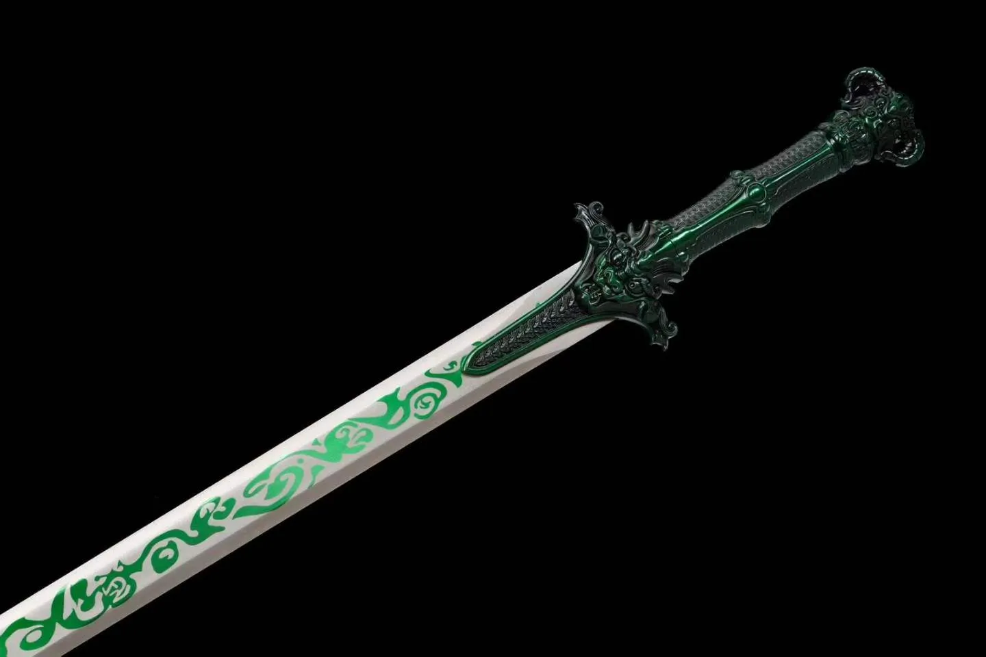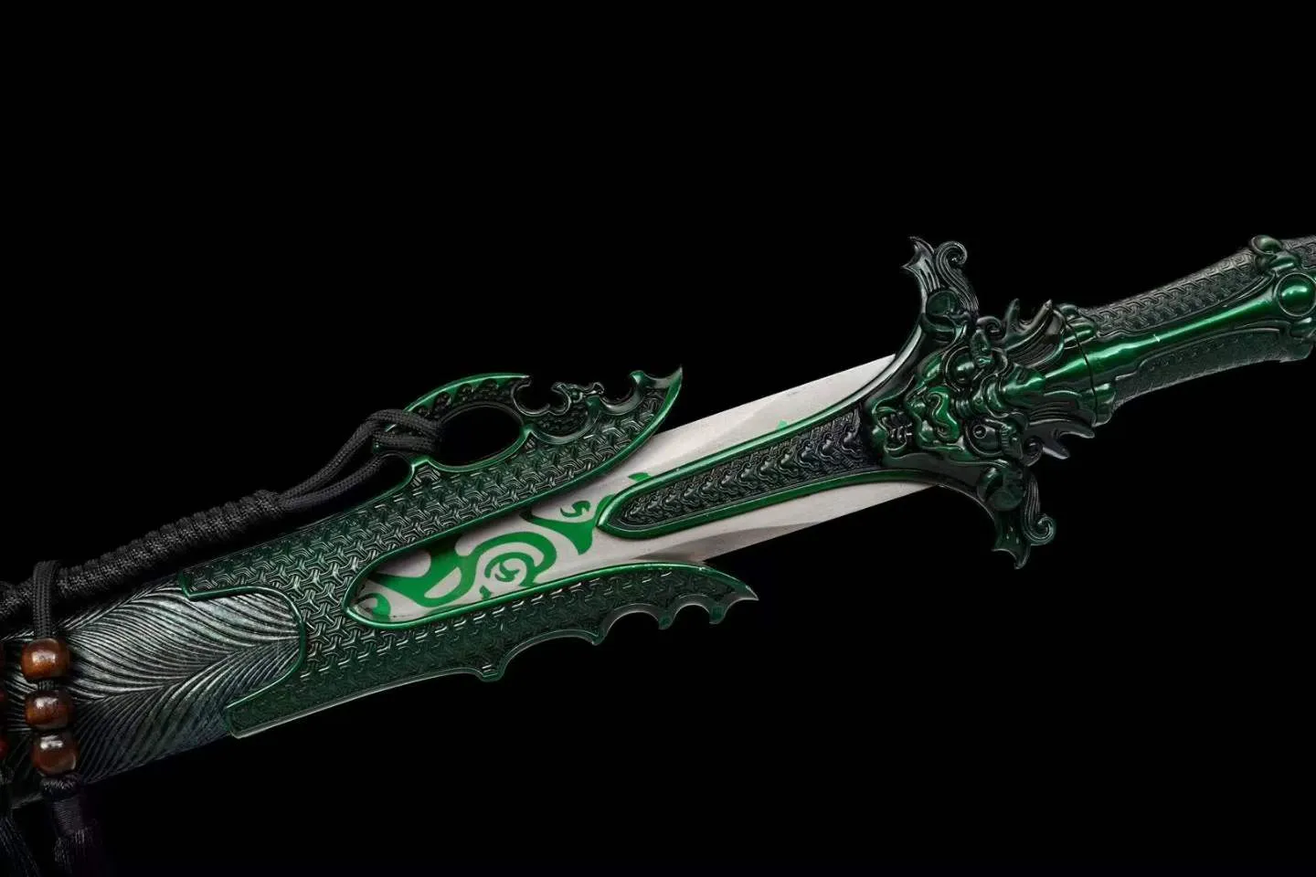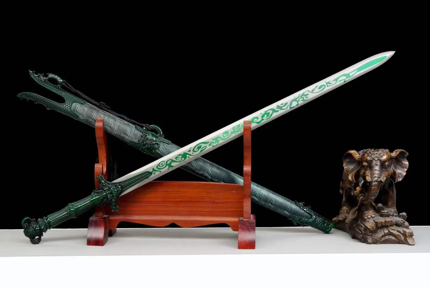 Lục Vũ Huyền Kiếm là mẫu kiếm mang đậm tinh thần cổ phong, nổi bật với tông xanh ngọc chạy xuyên suốt từ lưỡi kiếm đến tay cầm và vỏ kiếm. Lưỡi kiếm được rèn từ thép hợp kim, độ sáng ổn định, thân lưỡi thẳng và hoa văn xanh tạo cảm giác mạnh mẽ nhưng vẫn dễ nhìn. Bản lưỡi vừa phải, đường bo sắc gọn giúp thanh kiếm phù hợp cho mục đích trưng bày hoặc làm điểm nhấn trong bộ sưu tập.