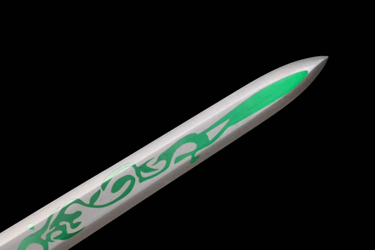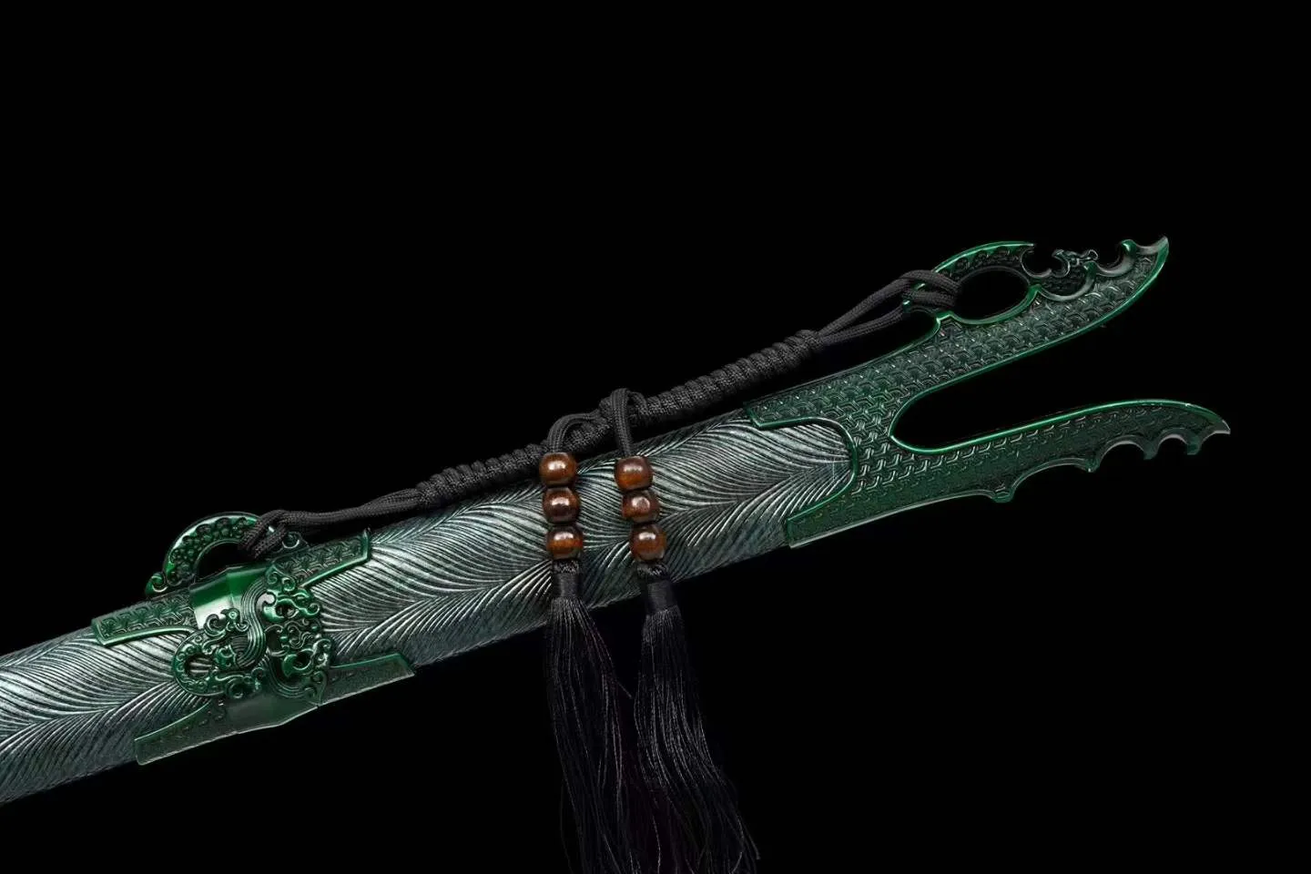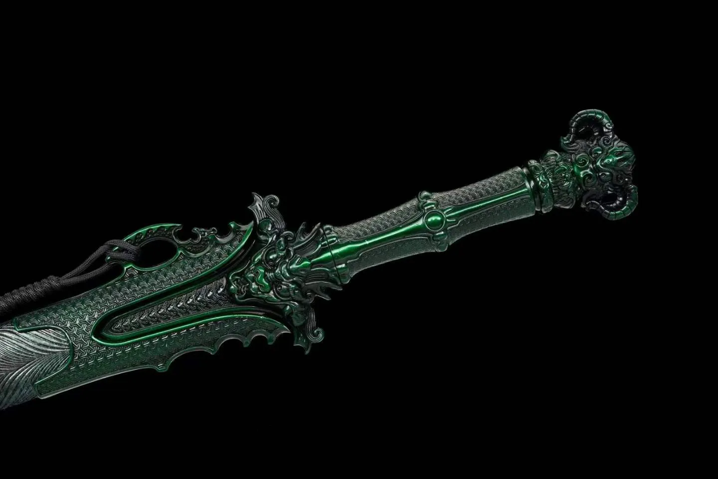 Lục Vũ Huyền Kiếm là mẫu kiếm mang đậm tinh thần cổ phong, nổi bật với tông xanh ngọc chạy xuyên suốt từ lưỡi kiếm đến tay cầm và vỏ kiếm. Lưỡi kiếm được rèn từ thép hợp kim, độ sáng ổn định, thân lưỡi thẳng và hoa văn xanh tạo cảm giác mạnh mẽ nhưng vẫn dễ nhìn. Bản lưỡi vừa phải, đường bo sắc gọn giúp thanh kiếm phù hợp cho mục đích trưng bày hoặc làm điểm nhấn trong bộ sưu tập.