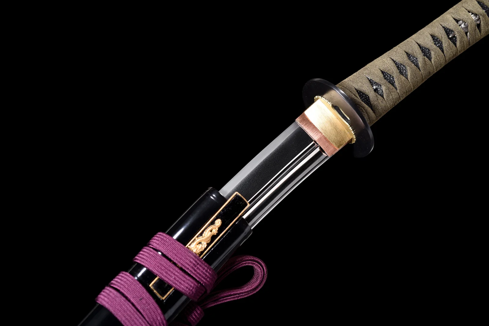 Thanh kiếm Miaochun Chuanchi được chế tác thủ công với tinh hoa nghệ thuật rèn kiếm. Lưỡi thép rèn từ thép Tamahagane – loại thép được ưa thích trong chế tác kiếm Nhật, mang độ sắc cao, cấu trúc chắc chắn. Bề mặt được mài tinh xảo, nổi bật đường sống lưỡi (shinogi) và sống trũng (bo-hi) giúp giảm trọng lượng, tạo cảm giác linh hoạt khi vung. Mũi kiếm (kissaki) thiết kế chuẩn truyền thống, nhấn mạnh sự mạnh mẽ và độ xuyên phá, thể hiện kỹ thuật mài tỉ mỉ. Tsuba đồng thau đen tối giản, gọn gàng, tăng sự cân bằng và giữ an toàn cho người sử dụng. Habaki đồng mạ vàng thủ công ôm sát chân lưỡi, đảm bảo sự chắc chắn và liền lạc giữa lưỡi và cán. Tsuka bọc da cá đen (samegawa) và quấn chỉ olive xanh đậm, nổi bật với nút buộc chuẩn truyền thống, mang lại cảm giác cầm nắm vững chắc, chống trượt. Saya gỗ sơn mài đen bóng, điểm nhấn chi tiết khảm sừng trâu và đồng mạ vàng tinh tế, kết hợp dây sageo tím đỏ sang trọng, tăng thêm phần trang nhã và khí chất quý tộc. Thanh kiếm Miaochun Chuanchi không chỉ là tác phẩm nghệ thuật sưu tầm ở phân khúc cao cấp mà còn đủ chuẩn cho luyện tập, trưng bày và trình diễn. Độ cân bằng hoàn hảo giữa lưỡi thép Tamahagane và chuôi truyền thống giúp người sử dụng vừa trải nghiệm cảm giác lịch sử, vừa khẳng định phong thái mạnh mẽ và tinh tế.