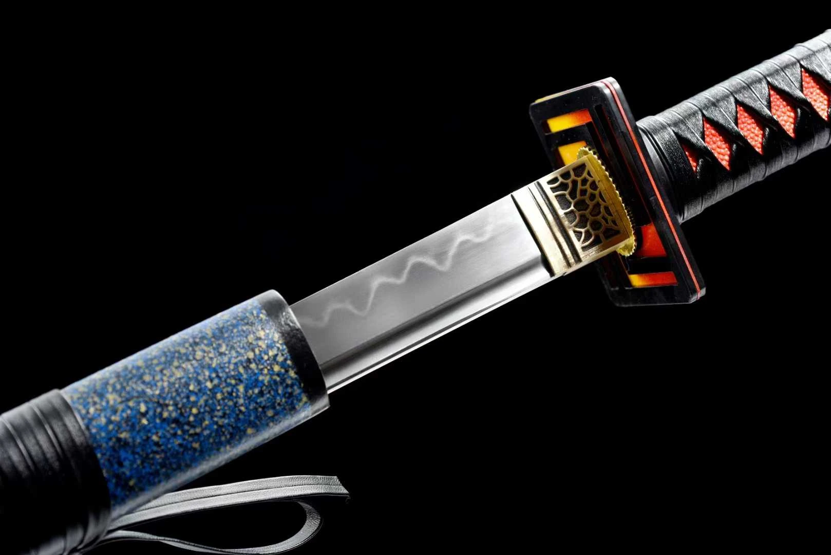Thanh Ninjato này được chế tác từ thép T8dòng thép hàm lượng carbon cao, nổi tiếng với độ cứng, khả năng giữ cạnh sắc bén lâu dài và tạo hình đường hamon rõ nét qua quá trình tôi luyện, dáng thẳng đặc trưng của Ninjato, mũi vuông (kiriha-zukuri) mạnh mẽ. Bề mặt được mài bóng, nổi bật đường hamon dạng sóng chạy dọc sống lưỡi, vừa mang tính thẩm mỹ vừa thể hiện kỹ thuật tôi luyện chuẩn xác. Cạnh cắt sắc ngọt, tối ưu cho bài tập cắt chính xác. Habaki chế tác từ hợp kim đồng với họa tiết dạng lưới tổ ong tinh xảo, ôm khít chân lưỡi, đảm bảo độ chắc chắn khi tra rút. Tsuba thiết kế vuông nhiều lớp, phối sắc đen – đỏ – vàng đầy tương phản, mang hơi hướng hiện đại và mạnh mẽ, khác biệt so với phong cách tròn truyền thống. Tsuka quấn da đen (ito) trên nền samegawa đỏ nổi bật, điểm xuyết menuki vàng hình rồng, tạo độ bám chắc chắn và đem lại cảm giác sang trọng. Vỏ sơn bóng xanh lam ánh kim, phối hạt vàng nổi, tạo hiệu ứng như bầu trời đêm rực sao. Khóa vỏ (koiguchi) màu vàng hổ phách, kết hợp chuôi buộc da đen tăng thêm vẻ đẹp. Thanh Ninjato phù hợp cho cả trưng bày, sưu tầm lẫn luyện tập các bài tập kiếm đạo.