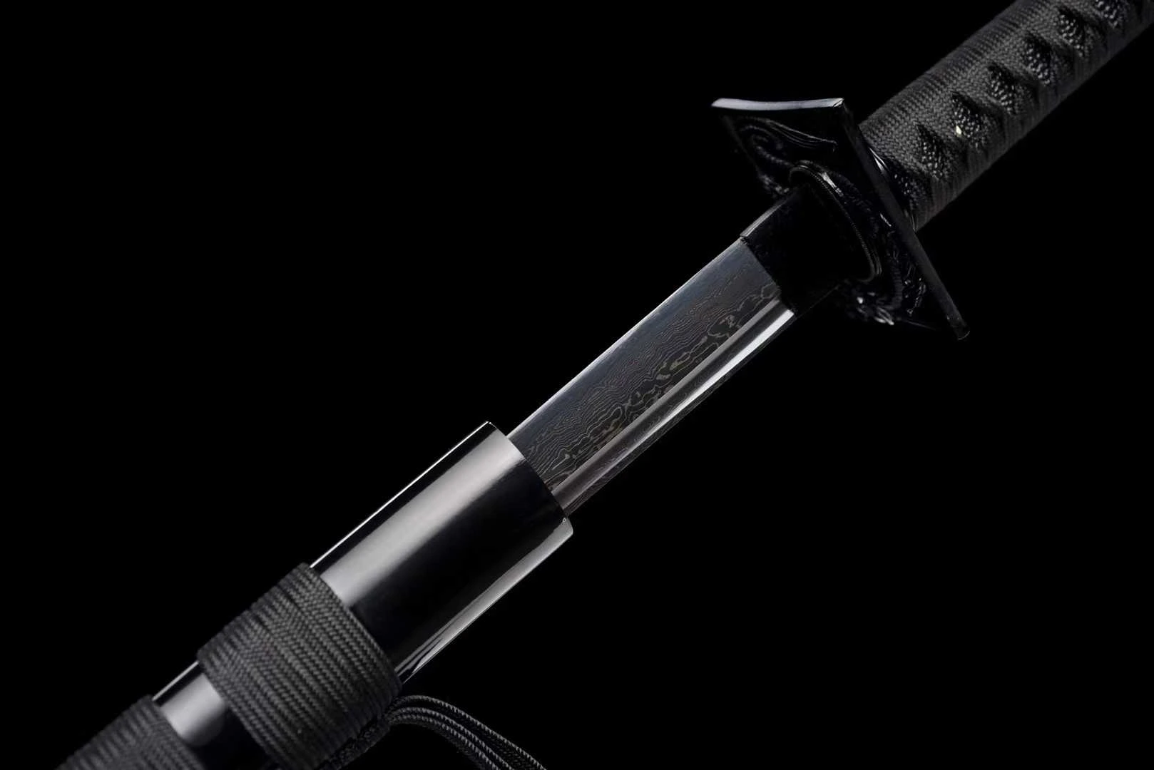Lưỡi của thanh ninjato được rèn từ thép gấp hoa văn damascus tạo từ nhiều lớp thép rèn chồng – cho độ cứng cao, dẻo dai và khả năng chịu lực cực tốt. Đường vân trên lưỡi là dấu ấn của quá trình luyện kim truyền thống. Tsuba (chắn tay) hình vuông, chạm khắc rồng nổi đầy uy lực – biểu tượng cho quyền năng và linh khí bảo vệ chủ nhân. Tsuka (chuôi) bọc dây đen kết hợp cùng menuki ánh vàng bên dưới – cầm chắc tay, không trơn trượt, vừa tăng độ bám vừa mang yếu tố thẩm mỹ ngầm. Saya sơn đen bóng toàn bộ, điểm nhấn bằng sageo (dây buộc) và kurigata ánh kim – gọn gàng, sắc sảo, đúng chất stealth (ẩn thân).Sơn đen bóng toàn bộ, điểm nhấn bằng sageo (dây buộc) và kurigata ánh kim – gọn gàng, sắc sảo, đúng chất stealth (ẩn thân). Thanh kiếm này không đơn thuần là một món trưng bày – nó là hiện thân của sự kiên cường, kỷ luật và phong thái trầm lặng nhưng đầy sát khí của một shinobi thực thụ.