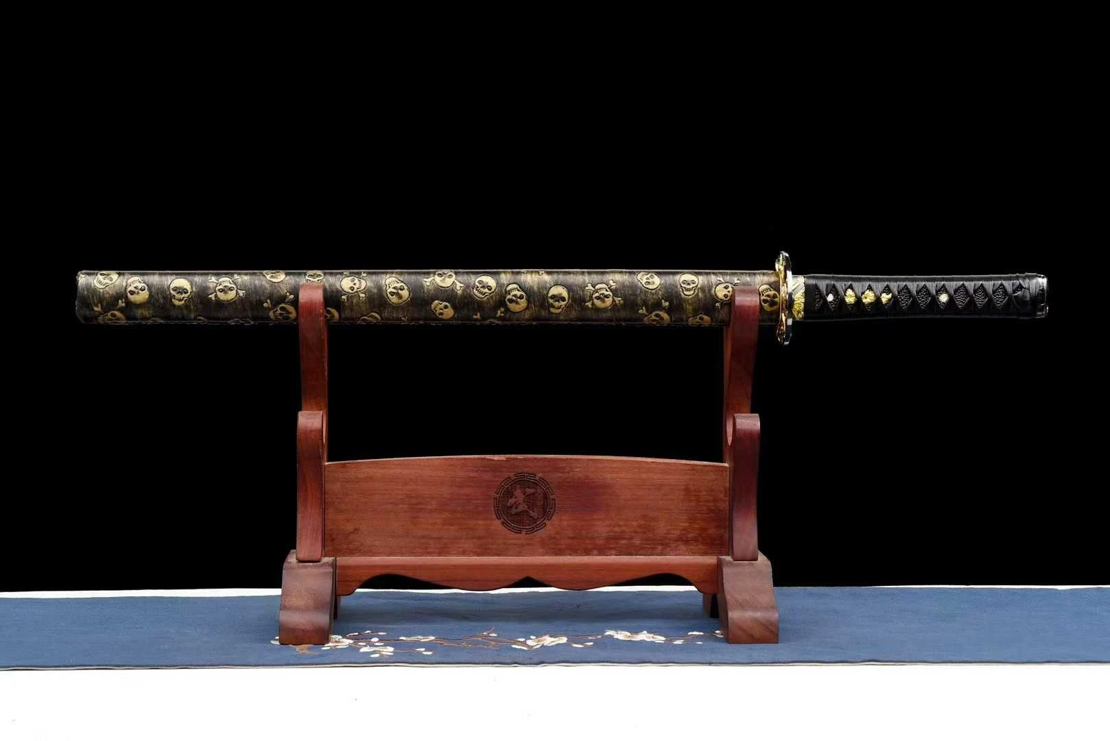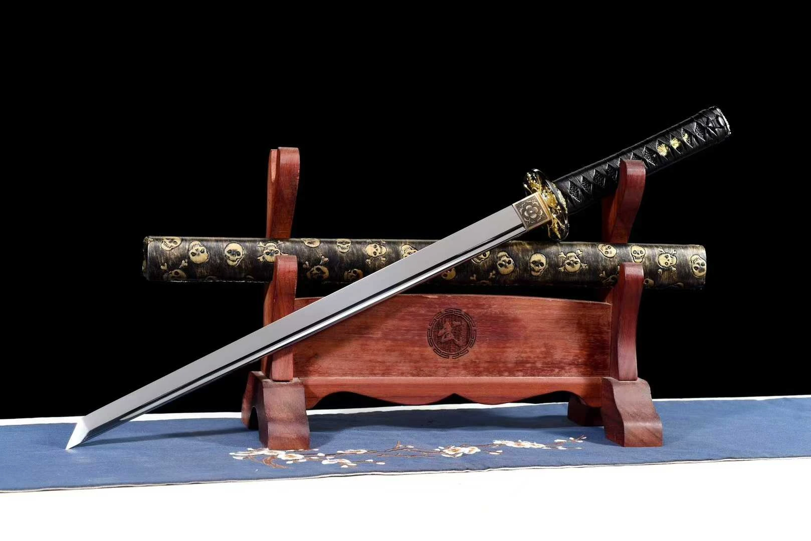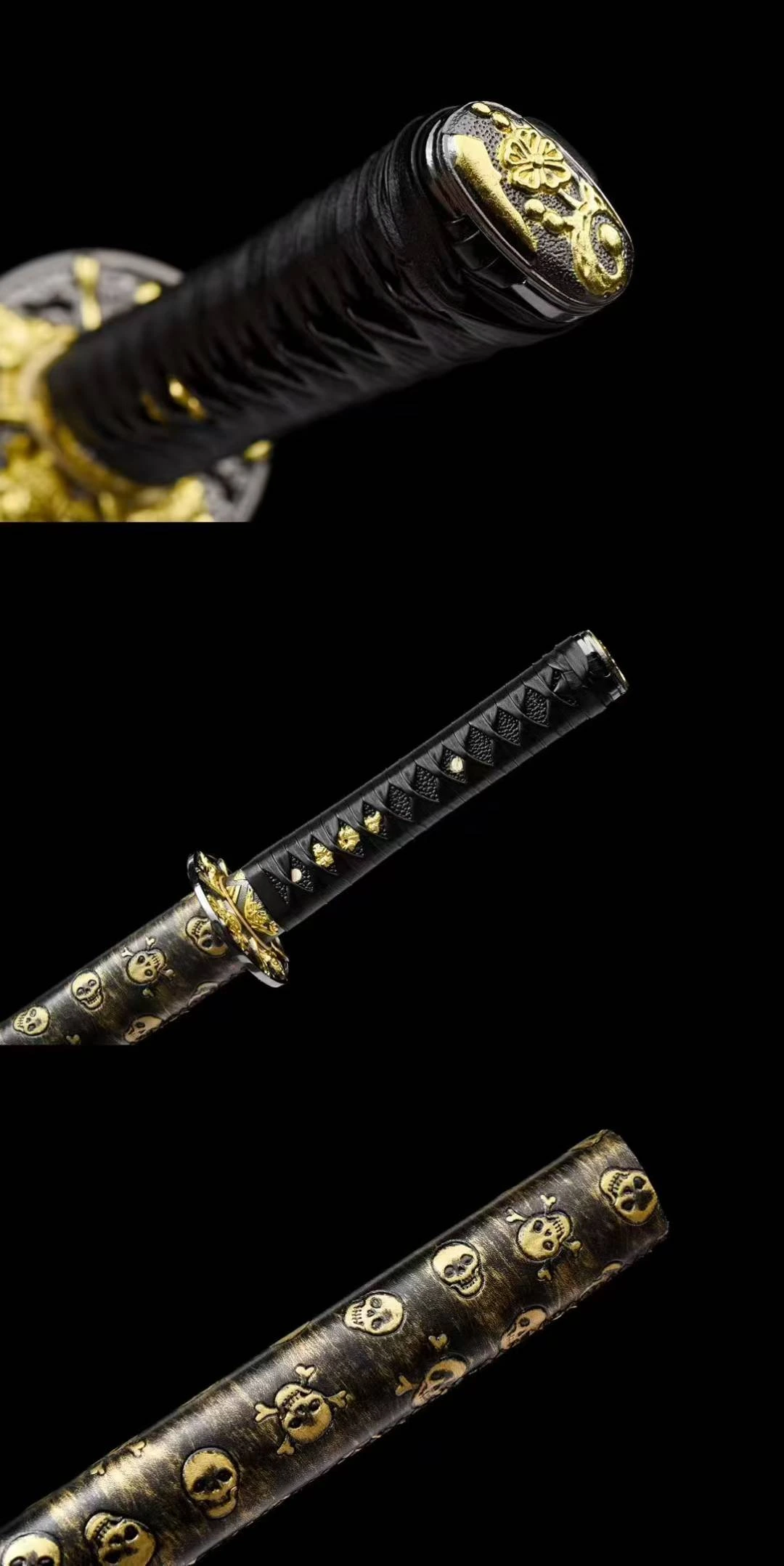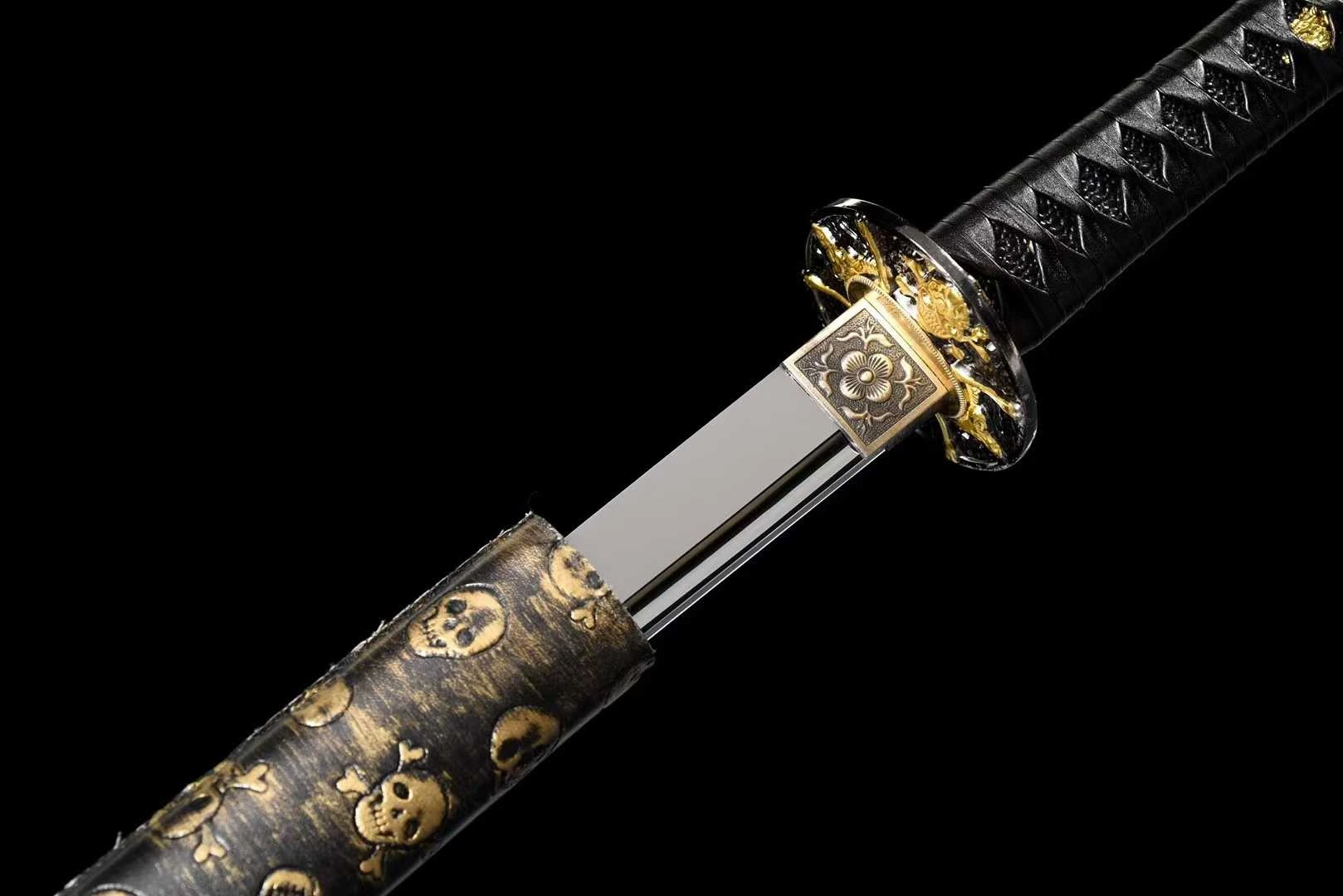 Một thanh kiếm không dành cho số đông – mà dành cho những ai sống theo nguyên tắc, chiến đấu trong im lặng và tỏa sáng bằng sự khác biệt. Đây Ninjato lưỡi thẳng được rèn từ thép lò xo – nổi bật với độ dẻo, khả năng đàn hồi cực tốt và độ bền vượt trội so với các loại thép thông thường. Lưỡi kiếm dạng thẳng chuẩn ninjato, mài sáng bóng gương cực sắc nét, mũi kissaki vát xéo. Được rèn từ thép lò xo có độ cứng vừa phải nhưng vẫn giữ được độ đàn hồi lý tưởng, giúp thanh kiếm linh hoạt khi thao tác, không dễ cong vênh hay gãy nứt khi va chạm mạnh. Tsuba thiết kế cực kỳ cá tính với họa tiết đầu lâu vàng nổi trên nền đen – mang khí chất hắc ám, quái kiệt và không khoan nhượng. Mỗi góc cạnh đều được chạm khắc sắc sảo, tạo chiều sâu nghệ thuật và uy lực thị giác. Tsuka quấn ito đen kiểu Hineri-Maki, nổi bật với menuki tông vàng làm điểm nhấn. Phần tsukamaki ôm khít tạo độ bám tay chắc chắn khi sử dụng, kết hợp cùng kashira (nút chuôi) trang trí họa tiết đầu rồng cách điệu cực độc. Saya phủ họa tiết đầu lâu trên nền đen cháy cạnh, hiệu ứng “burn gold” loang đều như cổ vật, tạo cảm giác bí ẩn và cuốn hút. Một thiết kế phá cách không trộn lẫn – dành cho những ai thích chơi chất, chơi ngầu và không hòa tan.