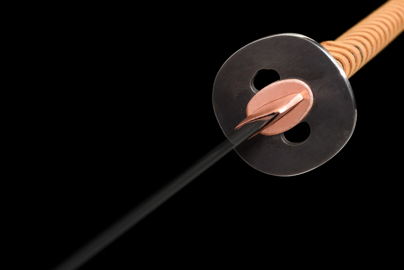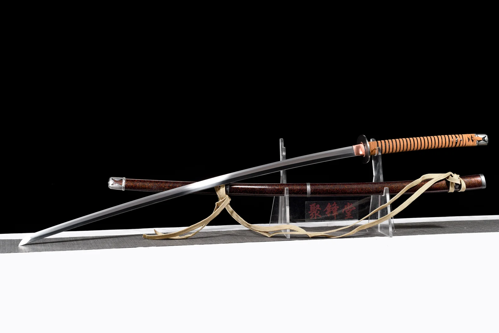 Thanh Odachi này được chế tác từ thép 5160 – loại thép lò xo nổi tiếng với độ bền dẻo và khả năng chịu va đập vượt trội, lý tưởng cho những thanh kiếm kích cỡ lớn. Lưỡi dài, dáng cong sâu, được mài thủ công, xử lý nhiệt làm nguội bằng dầu hiệu suất cao cho độ sắc bén và độ thẩm mỹ cao. Kiểu mài nổi bật sống lưng chắc khỏe, kết hợp mũi lưỡi (kissaki) rộng, tạo nên khí chất mạnh mẽ đặc trưng của Odachi. Habaki bằng đồng đỏ ôm sát chân lưỡi, kết nối chắc chắn với tsuba thép đen tròn tối giản. Tsuka quấn dây da màu nâu cam, kẻ sọc đen, bên dưới là lớp da cá, cho cảm giác cầm nắm vững vàng. Saya phủ sơn mài nâu ánh đỏ, kèm sageo sáng màu, mang phong cách sang trọng. Odachi thép 5160 thích hợp cho sưu tầm, trưng bày và cả luyện tập kỹ thuật kiếm. Kích thước dài cùng trọng lượng lớn giúp tái hiện rõ khí thế của những thanh đại kiếm trên chiến trường.
