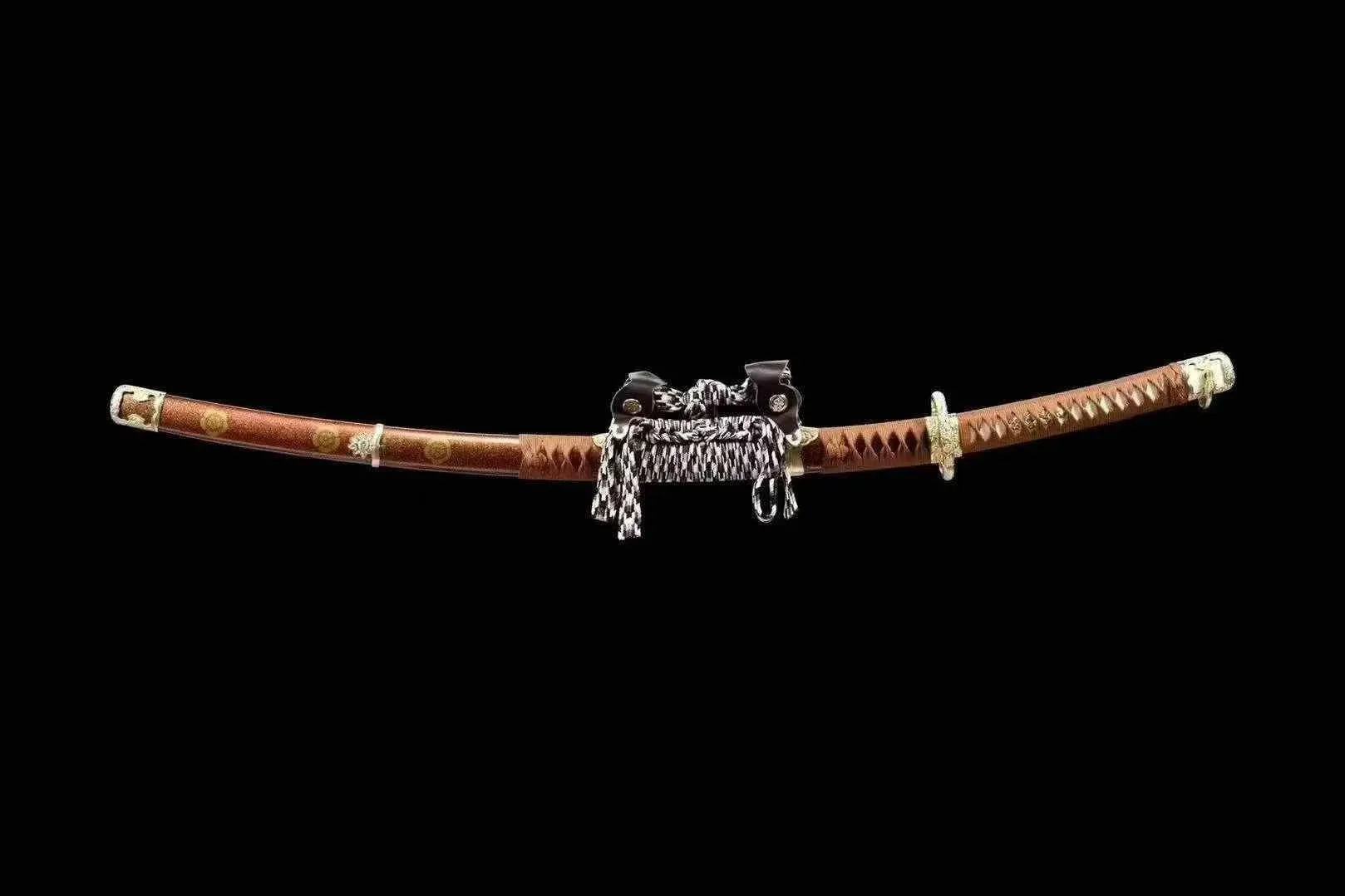 Bao kiếm: gỗ cao cấp, sơn đen phủ kim sa ánh vàng | Tay cầm : fulltang, ốp gỗ, lót da cá | Habaki/Tsuba : Đồng thau