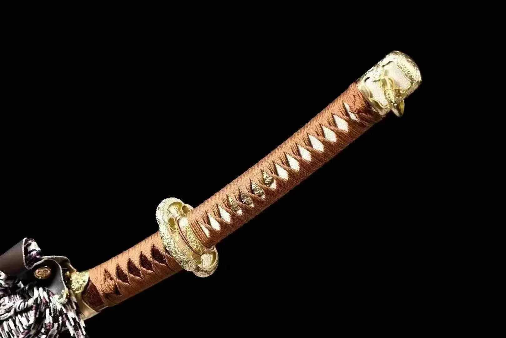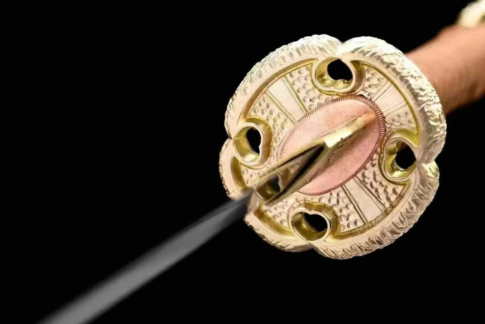 Thanh Tachi được rèn thủ công theo cổ pháp từ thép gấp hoa văn, trải qua quá trình tôi luyện và mài hoàn thiện, tạo nên đường vân thép rõ nét cùng độ cứng khoảng 60 HRC. Bộ phụ kiện đồng nguyên khối chạm khắc thủ công mang phong cách cổ điển sang trọng. Tay cầm quấn dây truyền thống, đảm bảo độ bám chắc và cân bằng khi sử dụng. Bao kiếm gỗ cao cấp sơn mài phủ kim sa, tăng tính thẩm mỹ và độ bền. Phù hợp sưu tầm, trưng bày, luyện võ, quà tặng tân gia hoặc quà tặng cao cấp.