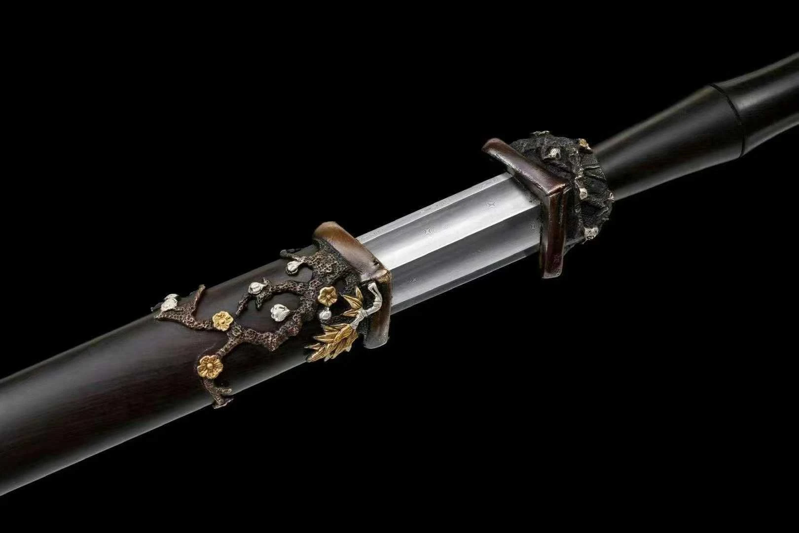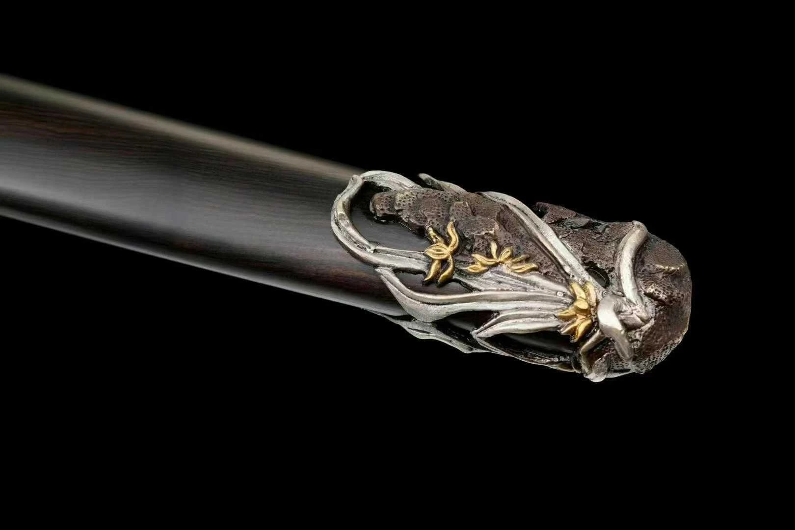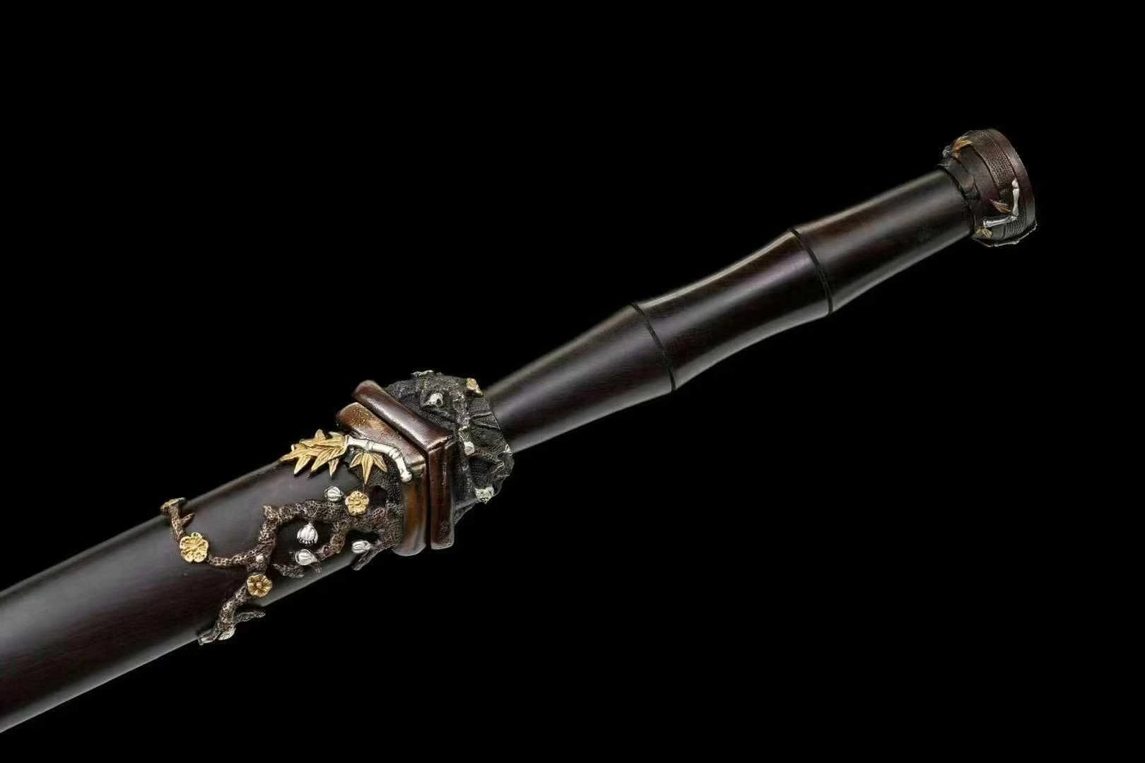 Thanh Quân Tử Kiếm được chế tác từ thép gấp hoa văn damascus , nổi bật với những đường vân gợn sóng đặc trưng trải dọc lưỡi, vừa mang tính thẩm mỹ cao vừa đảm bảo độ bền và độ sắc tinh xảo. Lưỡi kiếm thẳng, sống kiếm cân đối, mũi nhọn mạnh mẽ thể hiện khí chất uy nghi. Chuôi kiếm tạo hình ống trúc liền khối, mang ý nghĩa thanh cao và chính trực. Bao kiếm làm từ gỗ mun, điểm xuyết hoa văn nổi thủ công tinh xảo bằng đồng – vàng – bạc, tái hiện cảnh sắc hoa lá bốn mùa. Các chi tiết đai đeo, chạm khắc và nắp vỏ đều mang nét cổ phong, hòa quyện giữa sự mạnh mẽ và trang nhã. Quân Tử Kiếm không chỉ là một vũ khí mà còn là tác phẩm nghệ thuật, thích hợp trưng bày, biểu diễn văn nghệ, sưu tầm hoặc làm quà tặng cao cấp.