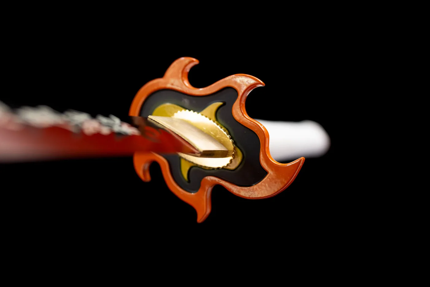 Lấy cảm hứng rèn từ thanh Nichirin Katana do Rengoku Kyojuro – Hỏa Trụ sử dụng trong Demon Slayer. Với thép mangan dẻo dai, kết hợp màu sắc và tạo hình trung thành nguyên tác, sản phẩm phù hợp để trưng bày, sưu tầm, cosplay hoặc làm đạo cụ ảnh phong cách anime. Không khuyến nghị sử dụng để chém vật cứng hoặc va đập mạnh. Lưỡi kiếm của katana được rèn từ thép mangan có độ bền cao, được sơn phủ tông đen tuyền kết hợp họa tiết ngọn lửa đỏ đặc trưng chạy dọc sống lưỡi – biểu trưng cho Hỏa trụ Rengoku Kyojuro trong anime Kimetsu no Yaiba. Phần lưỡi được mài thẳng sắc cạnh, form shinogi-zukuri, tạo nên vẻ cứng cáp, rực lửa và đầy khí chất chiến binh. Tsuba (chắn tay) có thiết kế hình ngọn lửa độc bản, phối màu cam-đen-vàng tạo điểm nhấn mạnh mẽ, mô phỏng chính xác nguyên tác trong truyện. Chất liệu cứng cáp, viền sắc nét, tăng độ chân thật khi trưng bày hoặc cosplay. Tsuka (chuôi kiếm) quấn bằng lớp ito trắng trên nền samegawa giả cá đuối, mang lại vẻ tinh khiết đối lập với màu lưỡi đỏ rực. Fuchi và kashira (đầu chuôi và chuôi kiếm) đều được sơn cam đồng bộ với tsuba, tạo nên tổng thể hài hòa và bắt mắt. Saya (vỏ kiếm) phủ sơn trắng, họa tiết chéo đen mô phỏng lớp vải quấn của Rengoku, kèm theo kojiri (đầu vỏ) và koiguchi (miệng vỏ) màu cam. Phối màu tương phản cao nhưng gọn gàng, tạo hiệu ứng thị giác mạnh mẽ khi để trên giá trưng bày hoặc chụp ảnh.